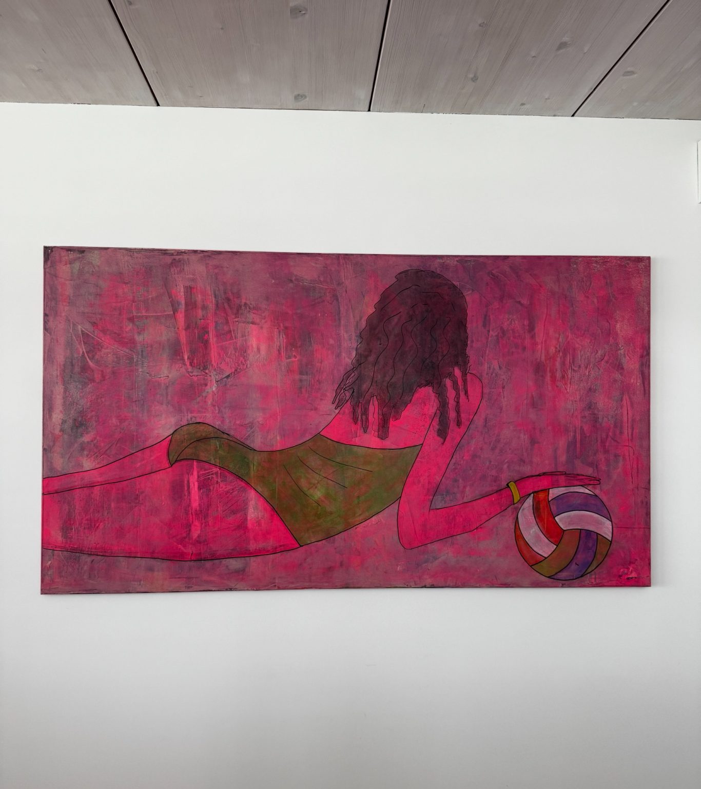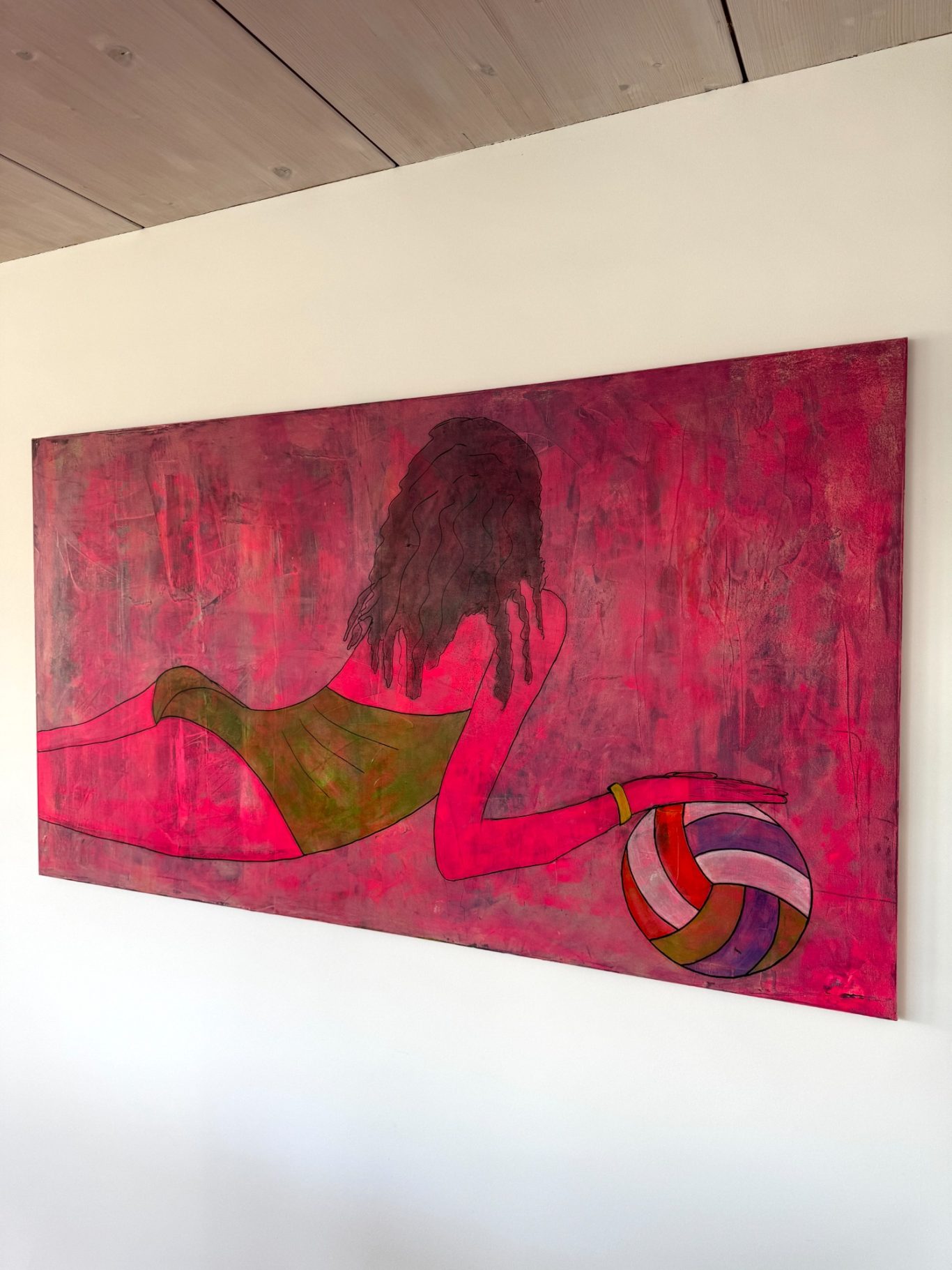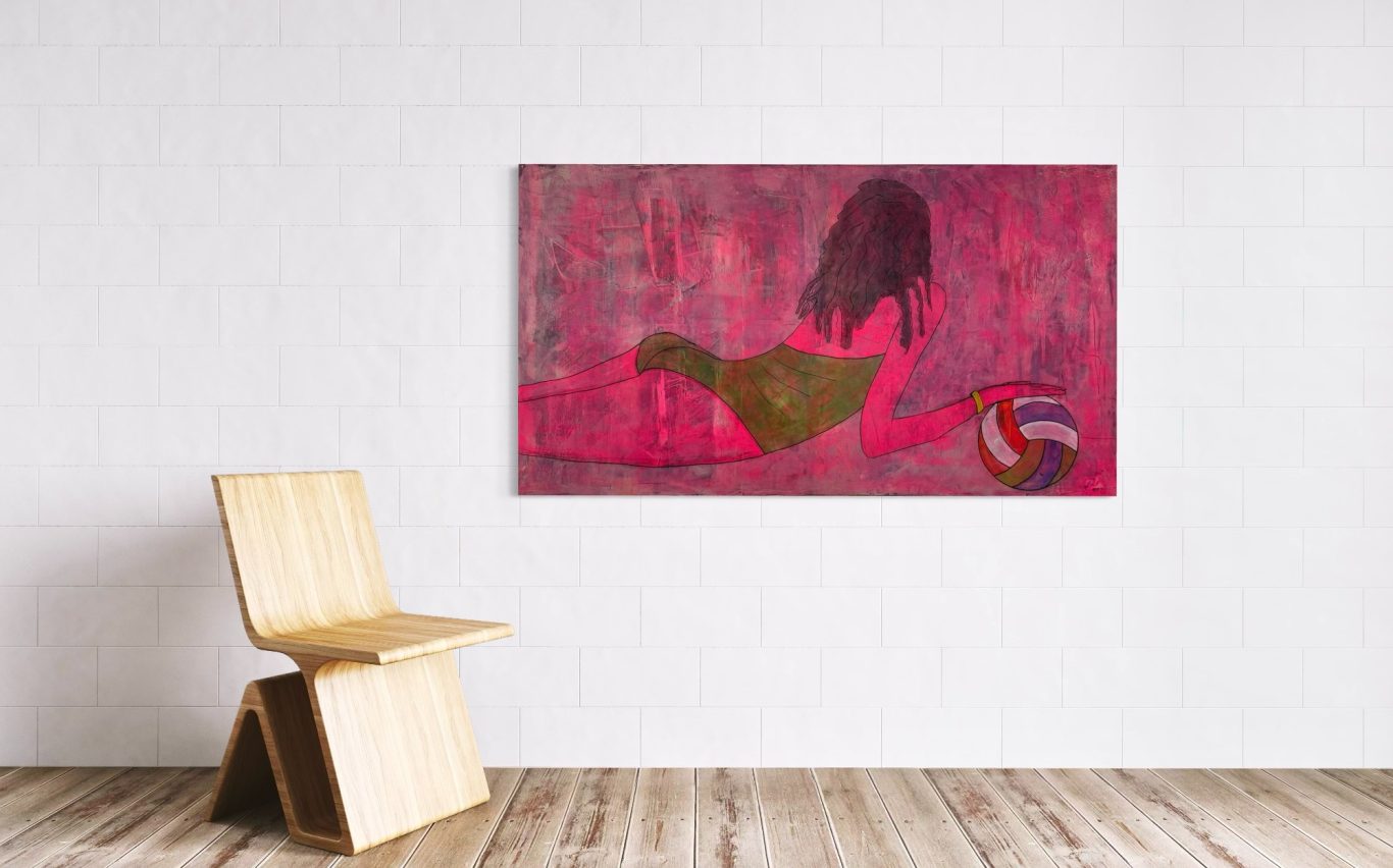 „Lea“ zeigt die kraftvolle Ruhe einer jungen, sportlichen Frau, die in einem Moment voller Körperspannung und Leichtigkeit festgehalten wurde. In einem grünen Badeanzug liegt sie am Boden, abgestützt im Sand, einen Ball in der Hand – bereit zur Bewegung, und doch ganz bei sich. Ihre nassen, gelockten Haare und die Rückenansicht betonen die natürliche Dynamik ihres Körpers, besonders die elegant geformten Konturen. Der leuchtend pinke Hintergrund mit dunkler Tiefe verleiht dem Werk eine fast surreale Aura – wie ein flirrendes Sommerlicht zwischen Traum und Realität.