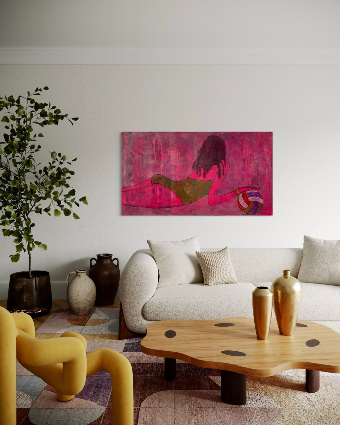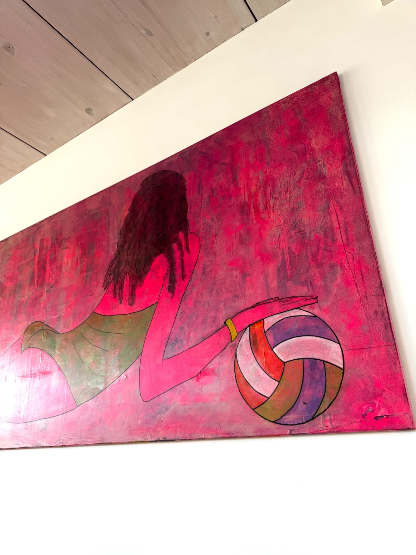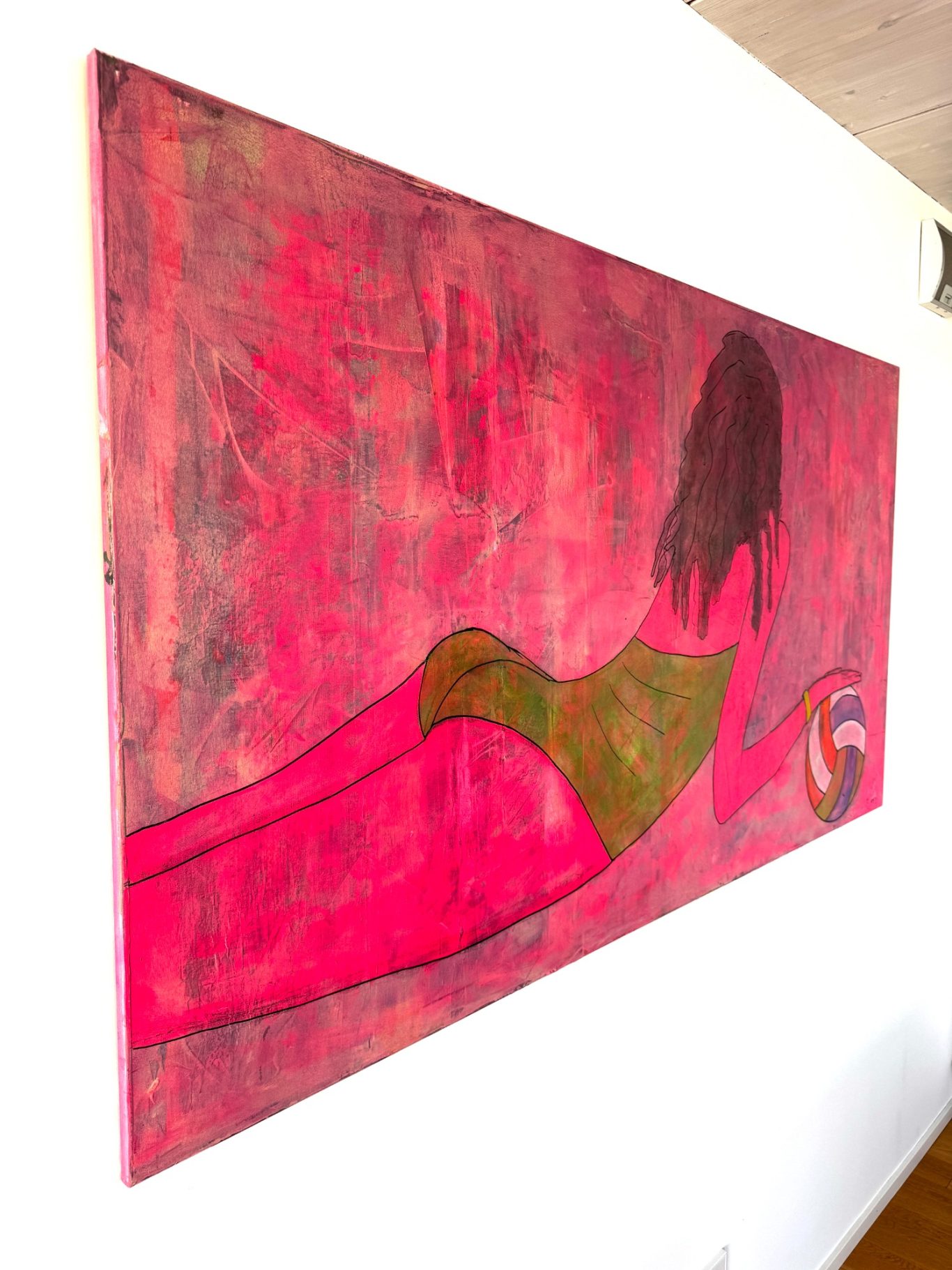 „Lea“ zeigt die kraftvolle Ruhe einer jungen, sportlichen Frau, die in einem Moment voller Körperspannung und Leichtigkeit festgehalten wurde. In einem grünen Badeanzug liegt sie am Boden, abgestützt im Sand, einen Ball in der Hand – bereit zur Bewegung, und doch ganz bei sich. Ihre nassen, gelockten Haare und die Rückenansicht betonen die natürliche Dynamik ihres Körpers, besonders die elegant geformten Konturen. Der leuchtend pinke Hintergrund mit dunkler Tiefe verleiht dem Werk eine fast surreale Aura – wie ein flirrendes Sommerlicht zwischen Traum und Realität.