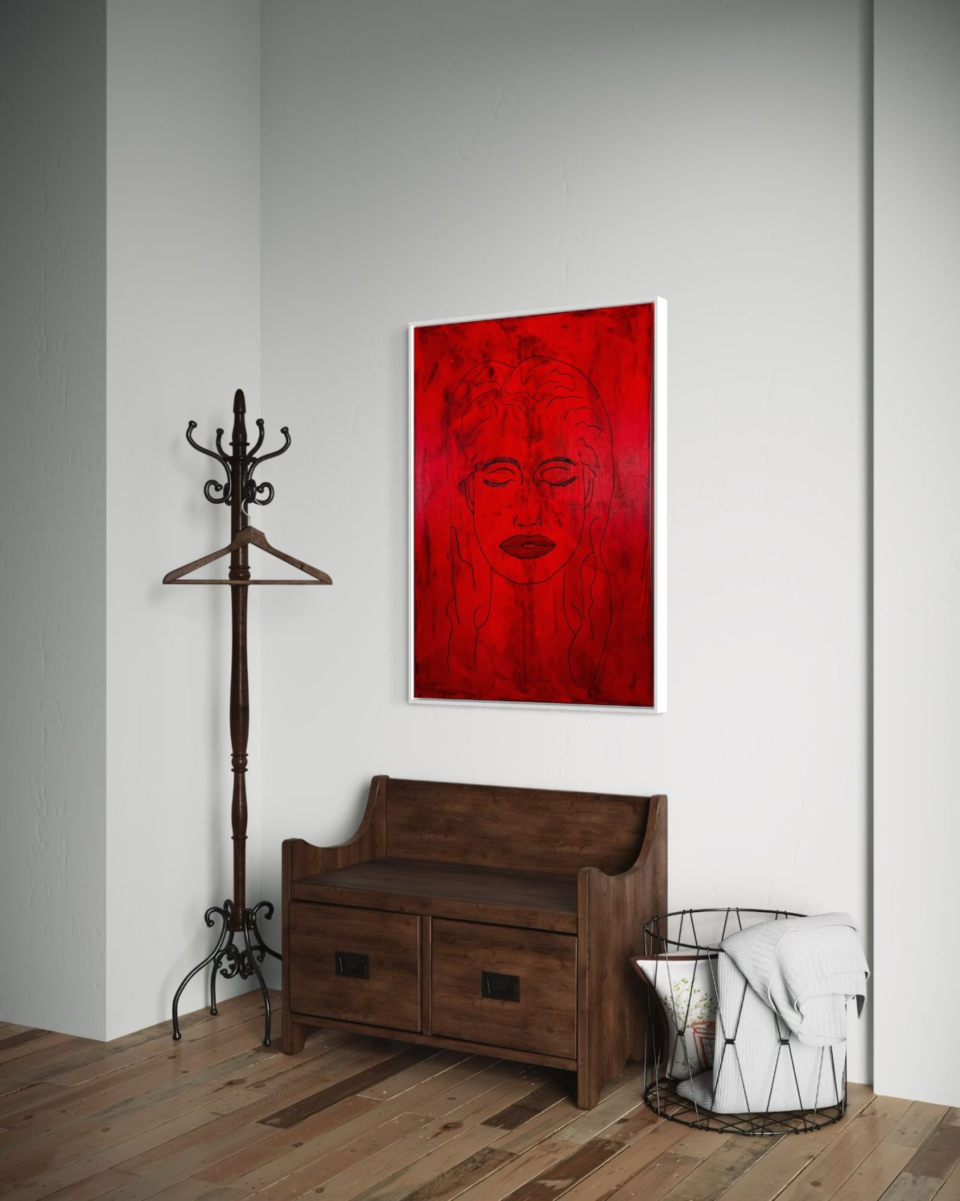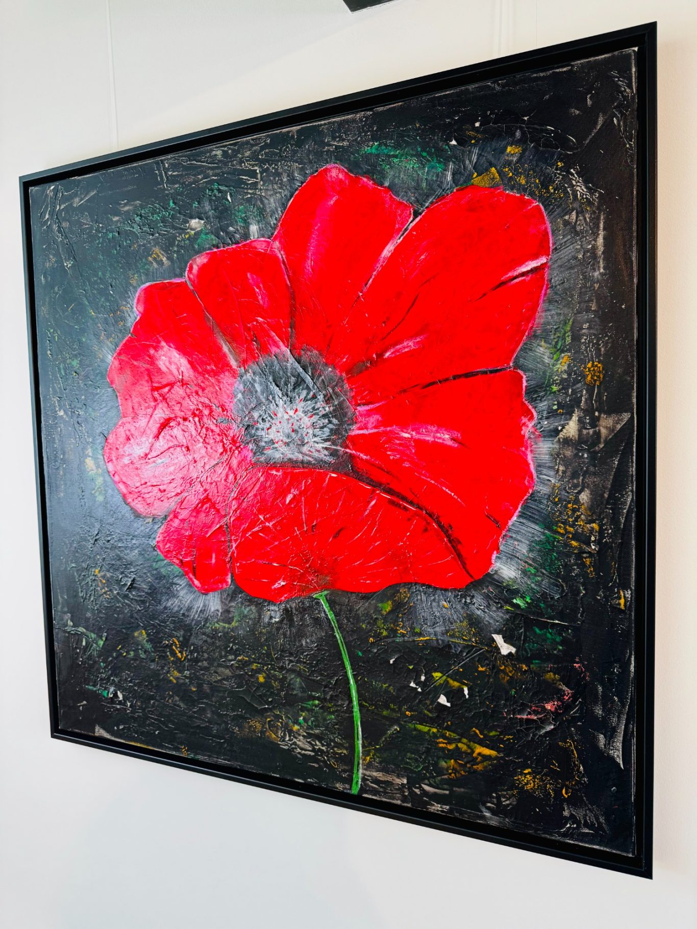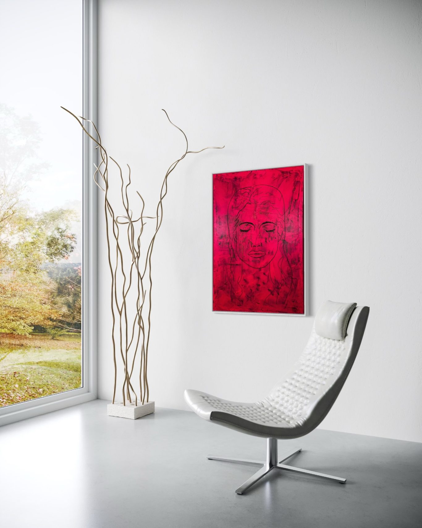 „Space Girl“ erscheint in kraftvollem Rot vor weißem Hintergrund und wurde komplett mit dem Flächenspachtel gestaltet – ganz ohne Pinsel. Schicht für Schicht wurden Formen und Strukturen aufgebaut, die eine lebendige Dynamik und Tiefe schaffen. Die reduzierte, dennoch ausdrucksstarke Komposition verbindet Energie mit einer klaren, minimalistischen Ästhetik und lädt dazu ein, immer wieder neue Details zu entdecken.