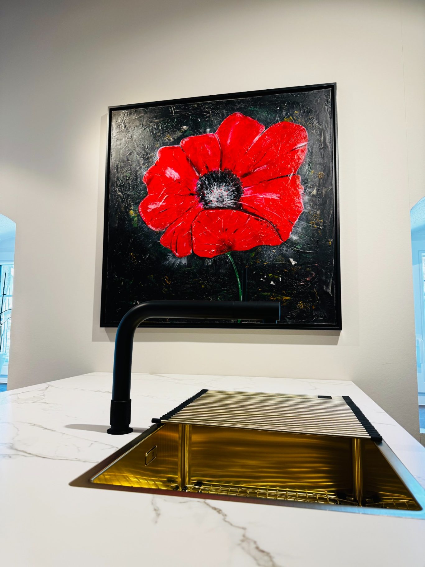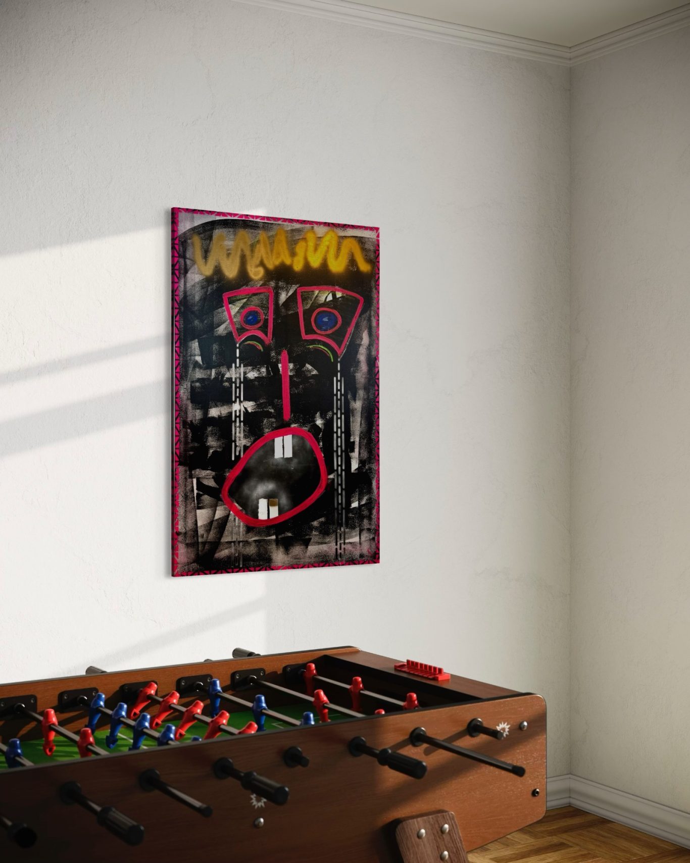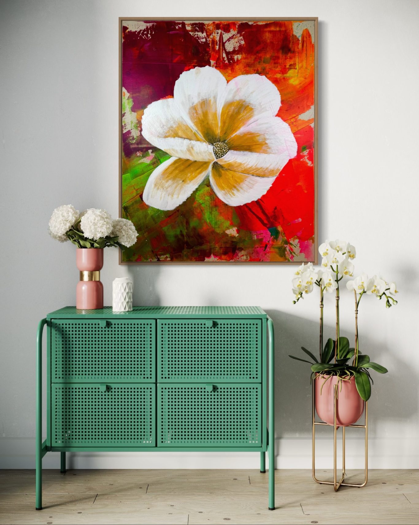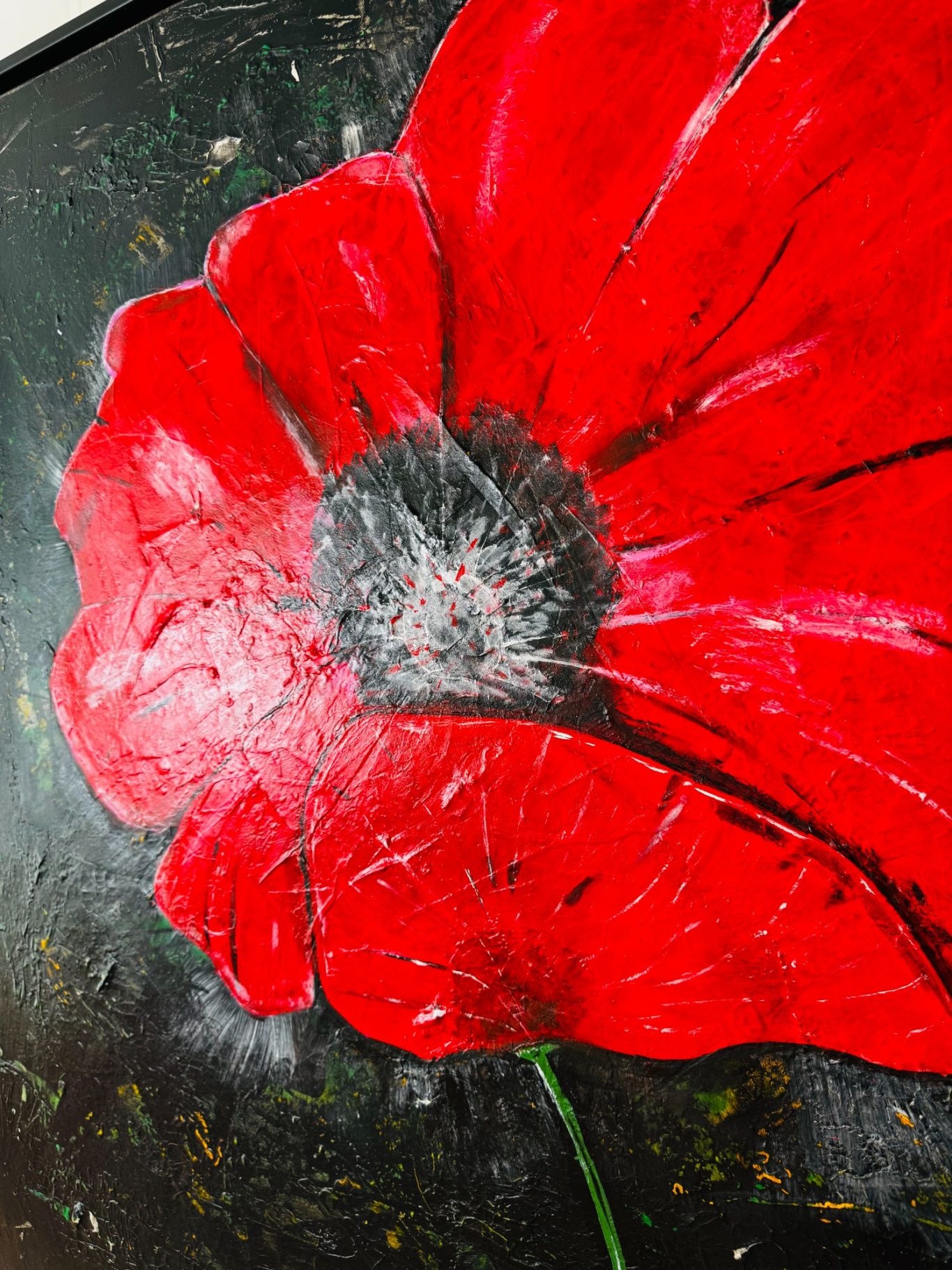 „Space Girl“ erscheint in kraftvollem Rot vor weißem Hintergrund und wurde komplett mit dem Flächenspachtel gestaltet – ganz ohne Pinsel. Schicht für Schicht wurden Formen und Strukturen aufgebaut, die eine lebendige Dynamik und Tiefe schaffen. Die reduzierte, dennoch ausdrucksstarke Komposition verbindet Energie mit einer klaren, minimalistischen Ästhetik und lädt dazu ein, immer wieder neue Details zu entdecken.