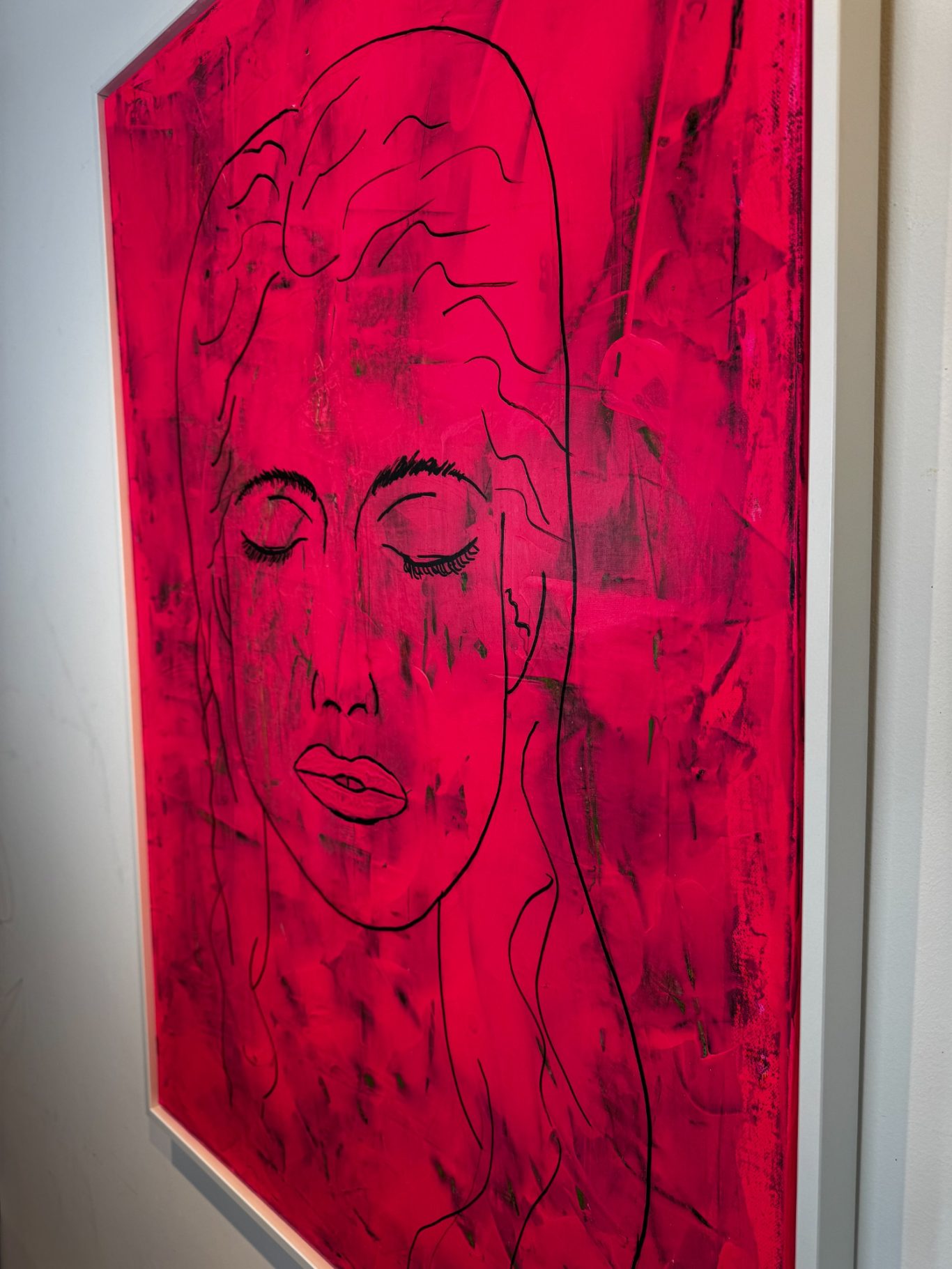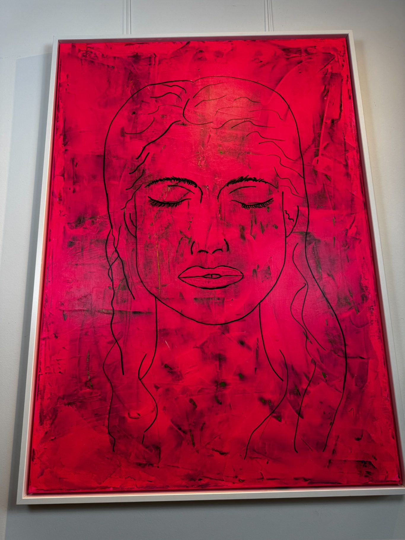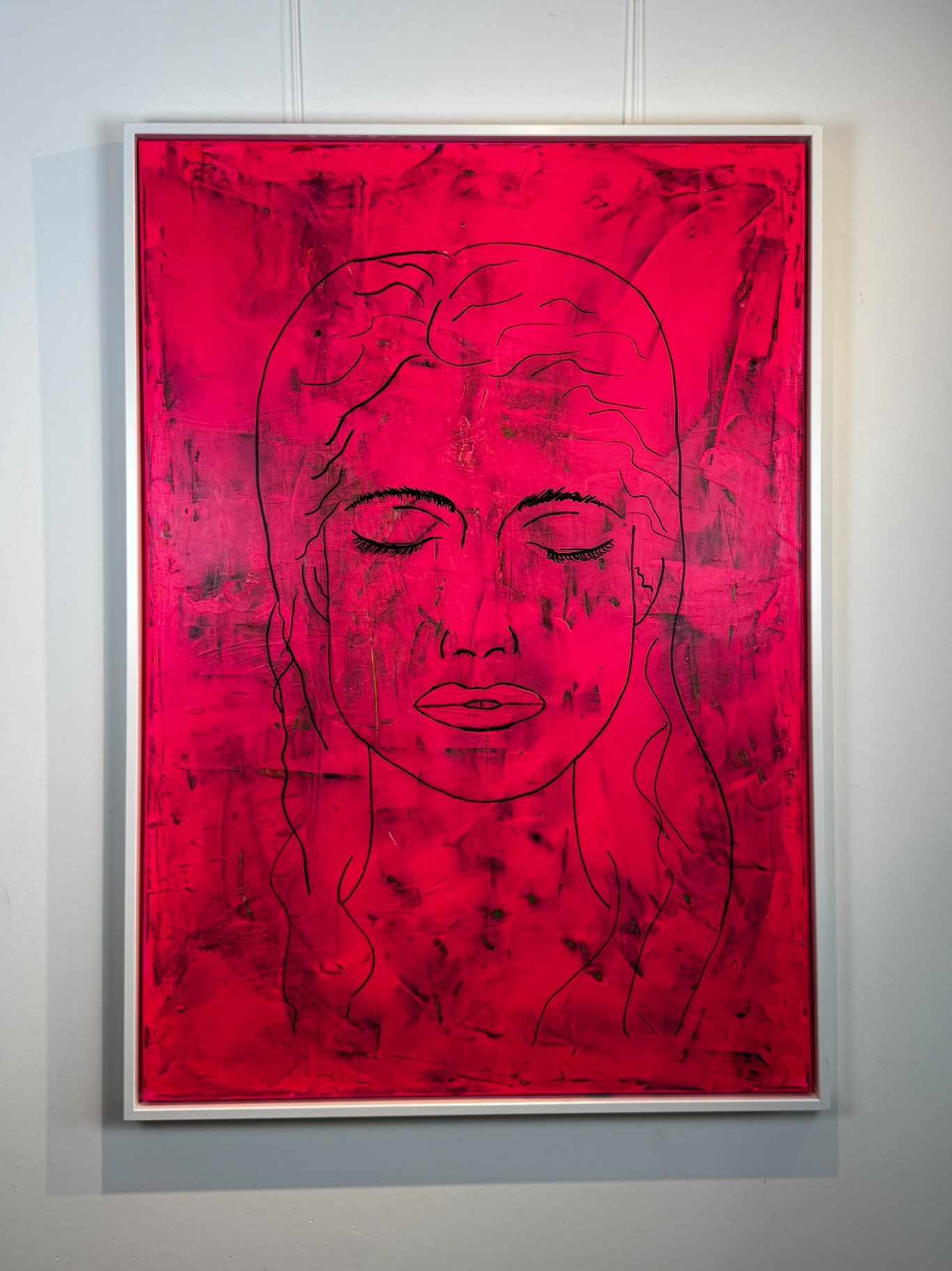 „Aurélie 973“ zeigt das Gesicht einer jungen Frau – offen, nachdenklich, in sich versunken. Das Bild ist von Neonmagenta durchzogen, in lasurartigen Schichten aufgetragen. Die intensive Farbe verliert durch die Technik nicht an Leuchtkraft, sondern gewinnt an Tiefe: Sie wirkt zugleich kraftvoll und durchscheinend.