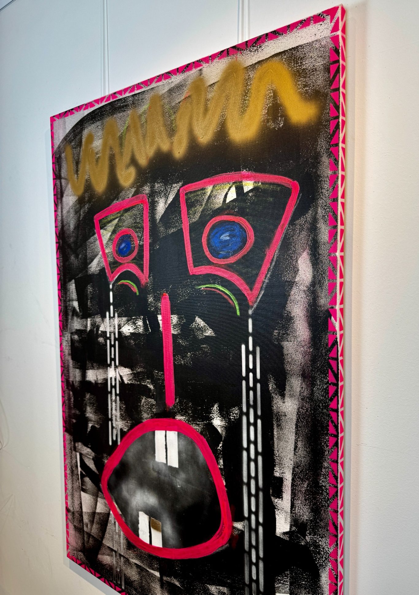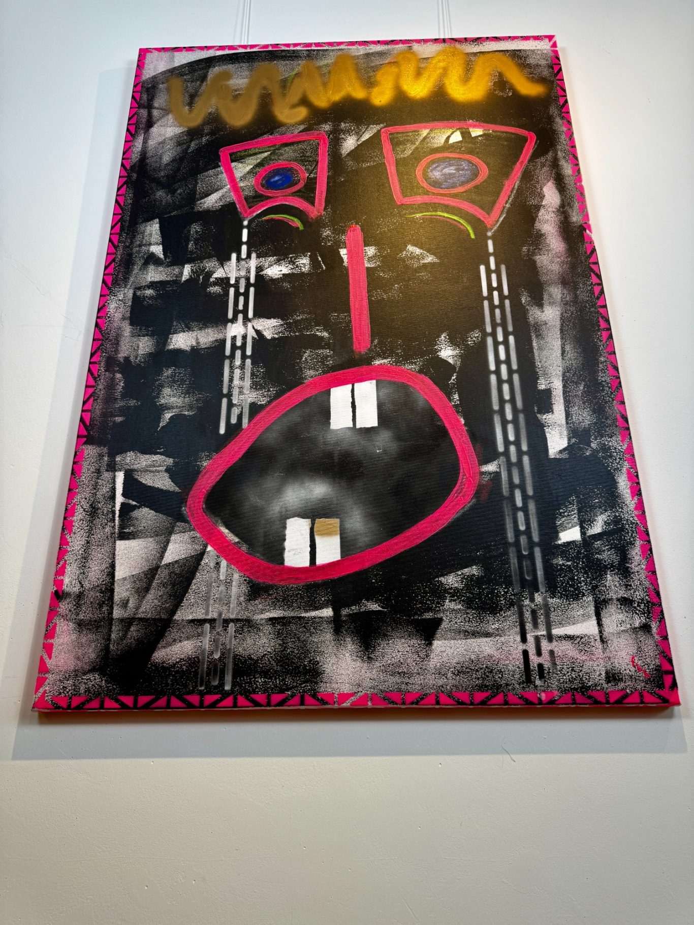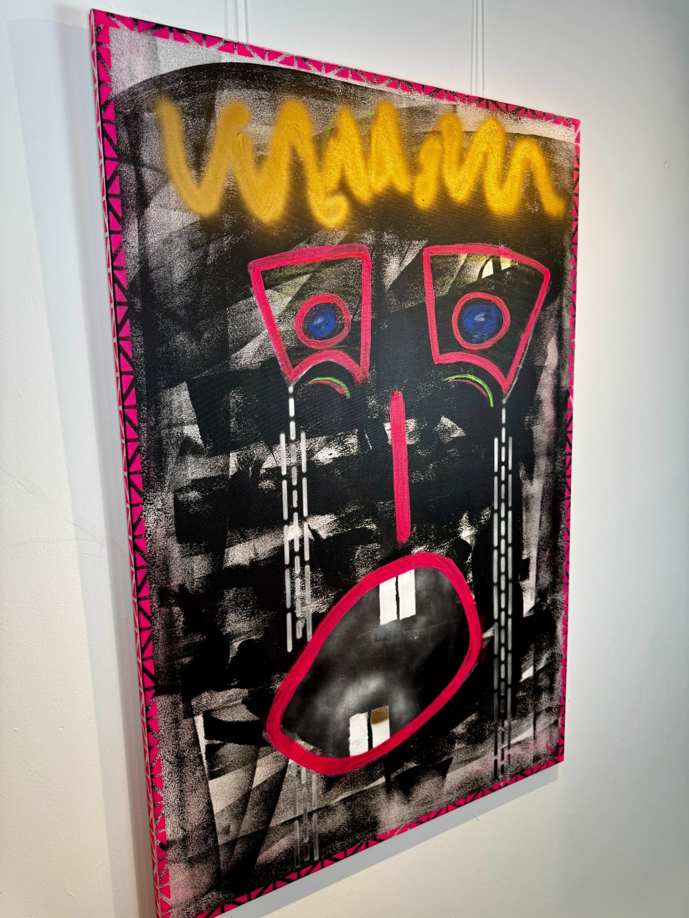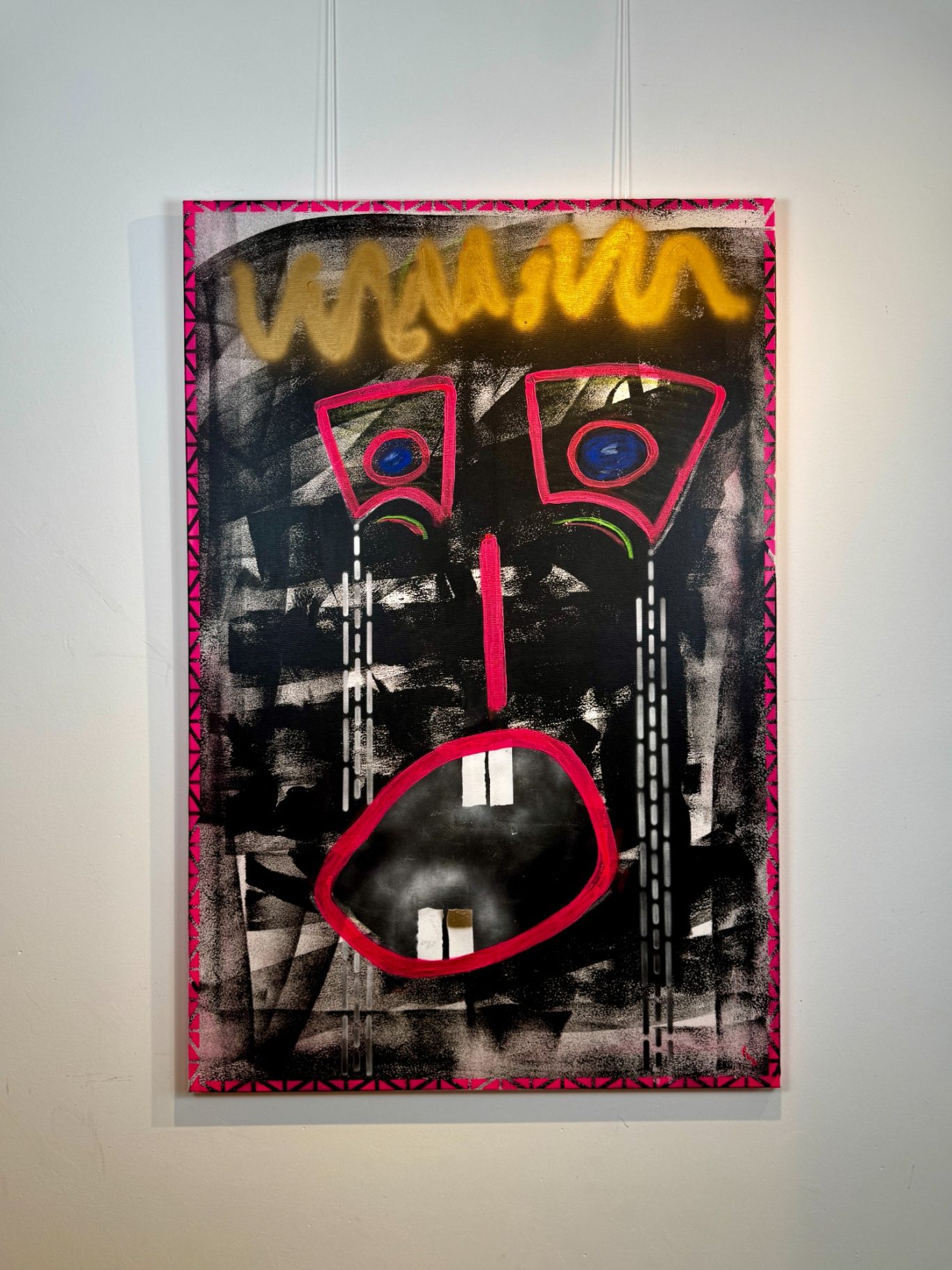„The Shock King“ ist ein kraftvolles Pop-up-Werk, das auf schwarzem Hintergrund mit einer leuchtend pinken Verzierung inszeniert wird – ein Kontrast, der sofort ins Auge fällt. Im Zentrum steht ein abstrakt gezeichnetes Gesicht: der Mund weit aufgerissen, aus den Augen schießen Tränen – Ausdruck purer Emotion und innerer Explosion. Gekrönt von einer stilisierten Krone, vereint dieses Werk Schmerz, Macht und Überzeichnung zu einer eindrucksvollen Bildsprache, die unter die Haut geht.