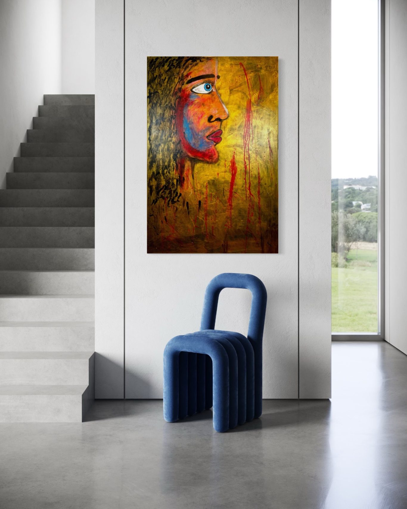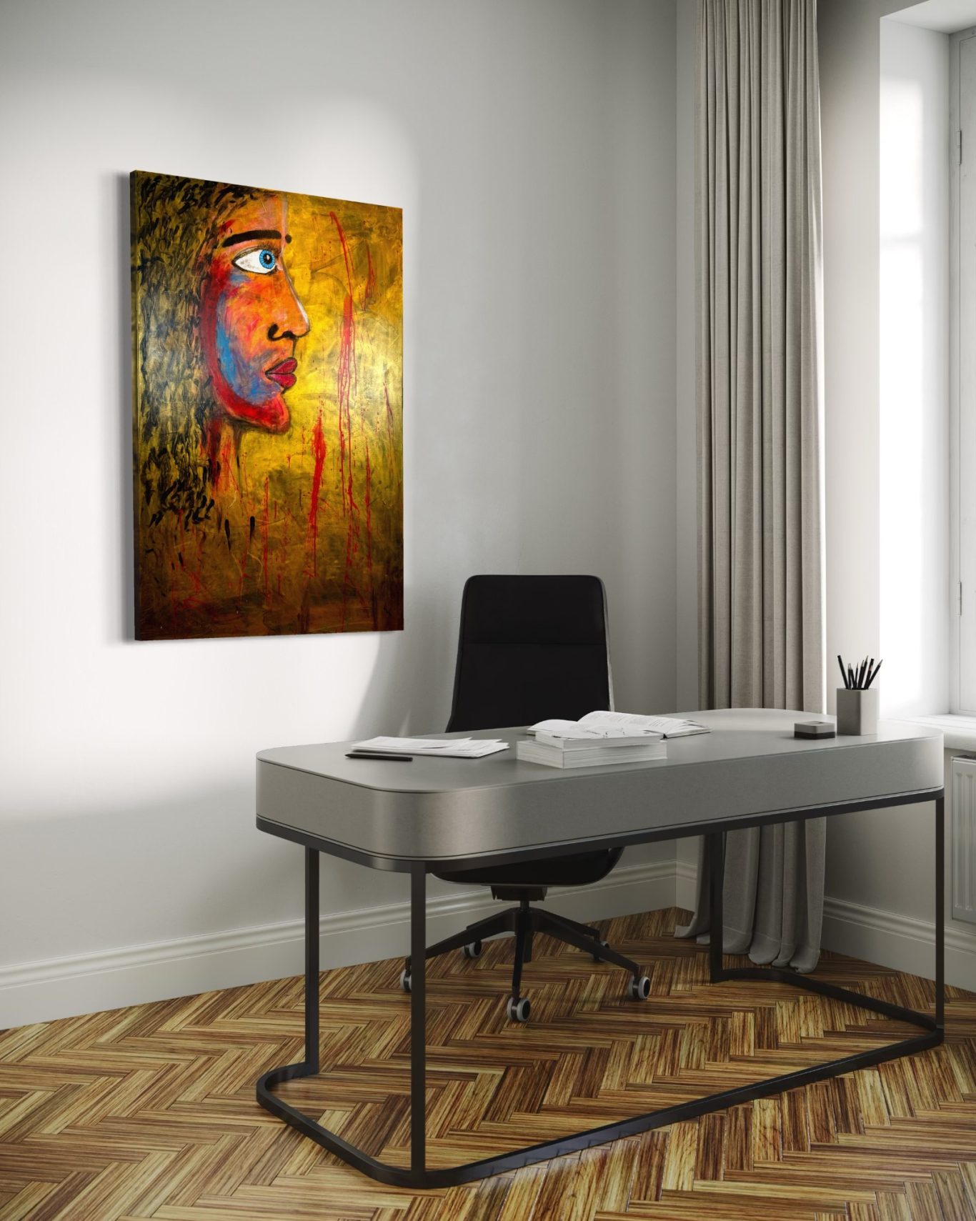 Durch die Anwendung einer besonderen Technik entsteht eine Oberfläche, die lebt – voller feiner Übergänge, in denen Licht und Emotion miteinander verschmelzen. Das Gesicht ist eingebettet in das Farbspiel, nicht abgesetzt, sondern verwoben mit der Fläche selbst.