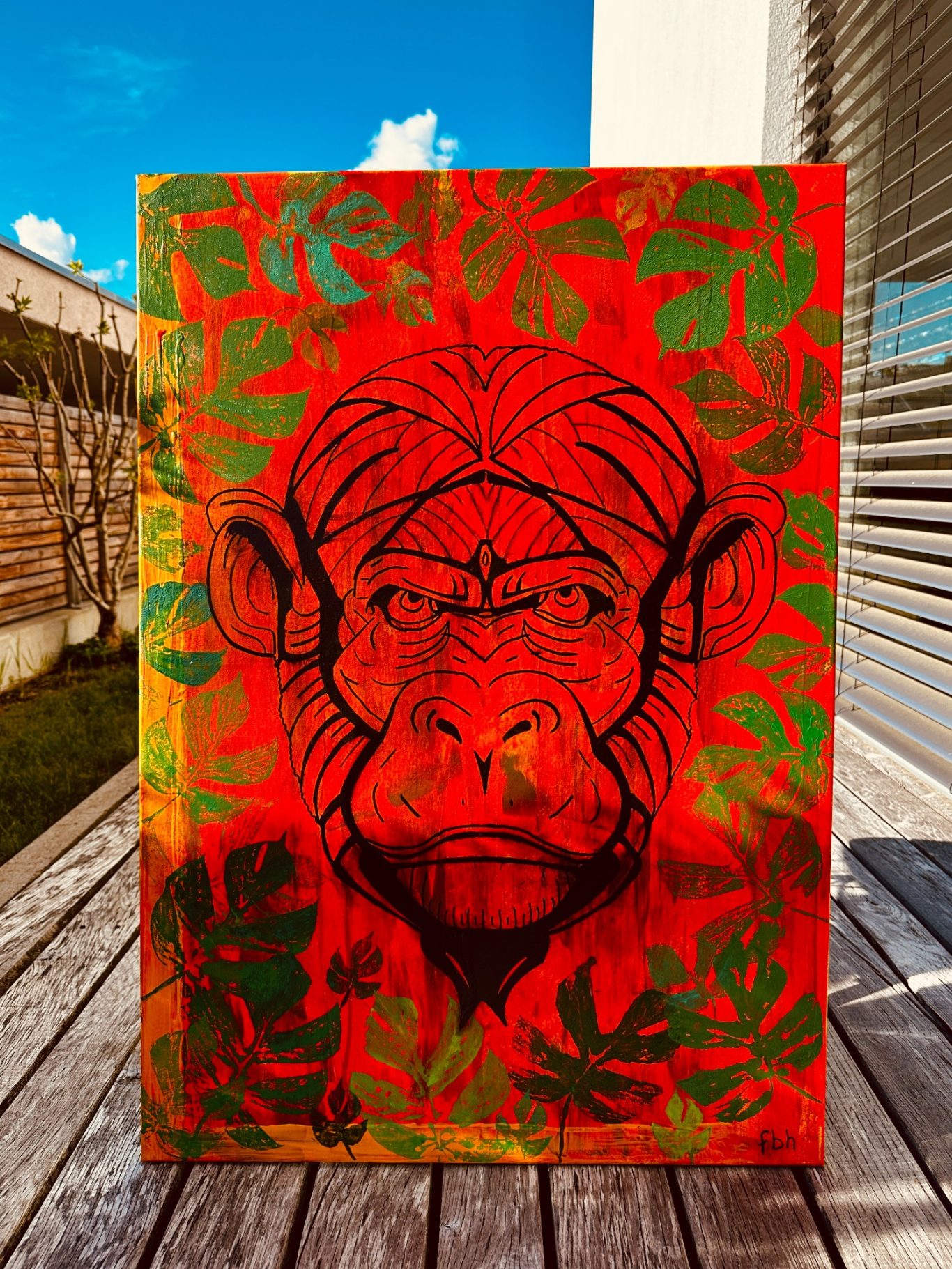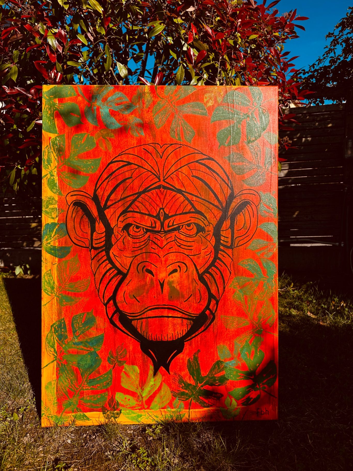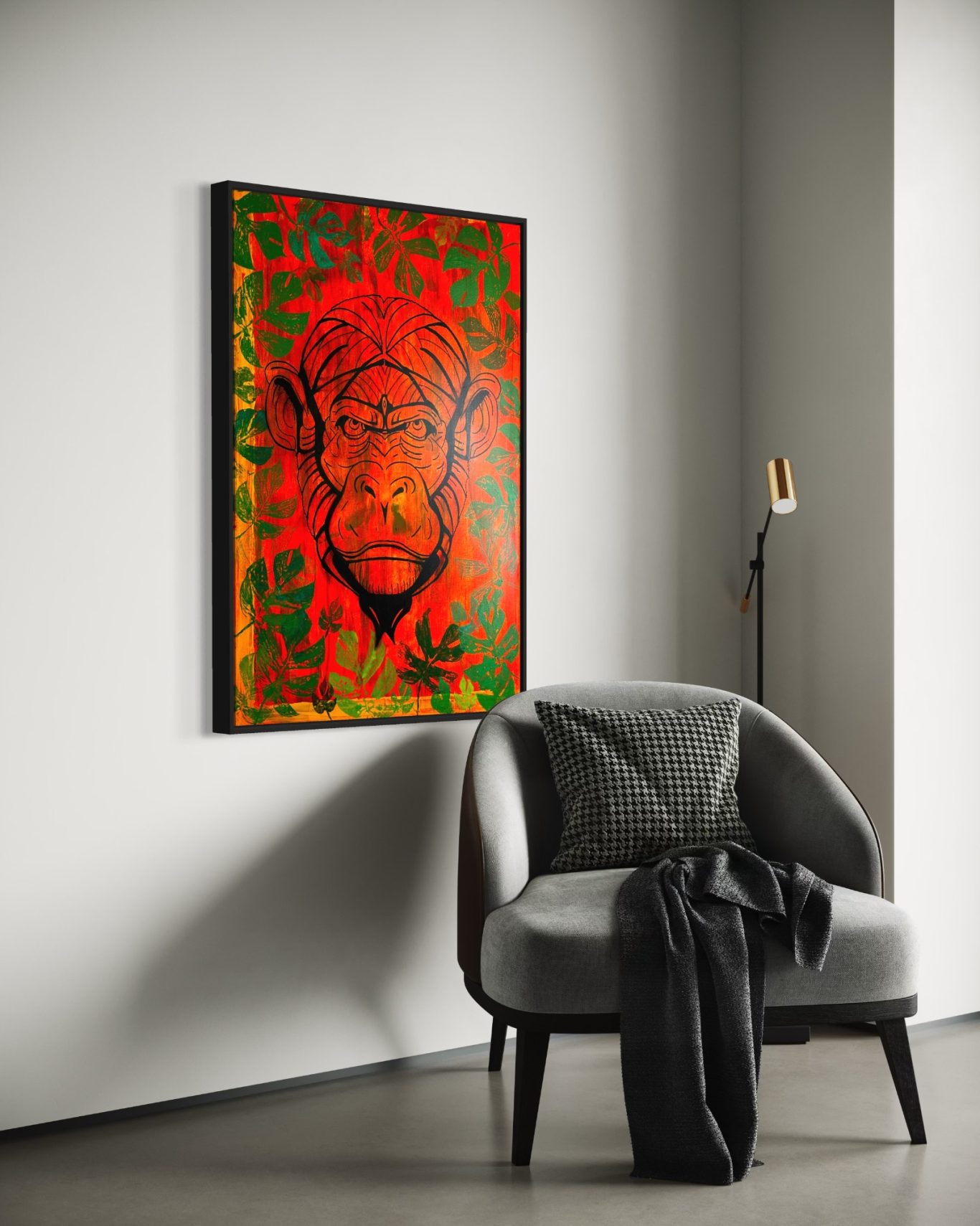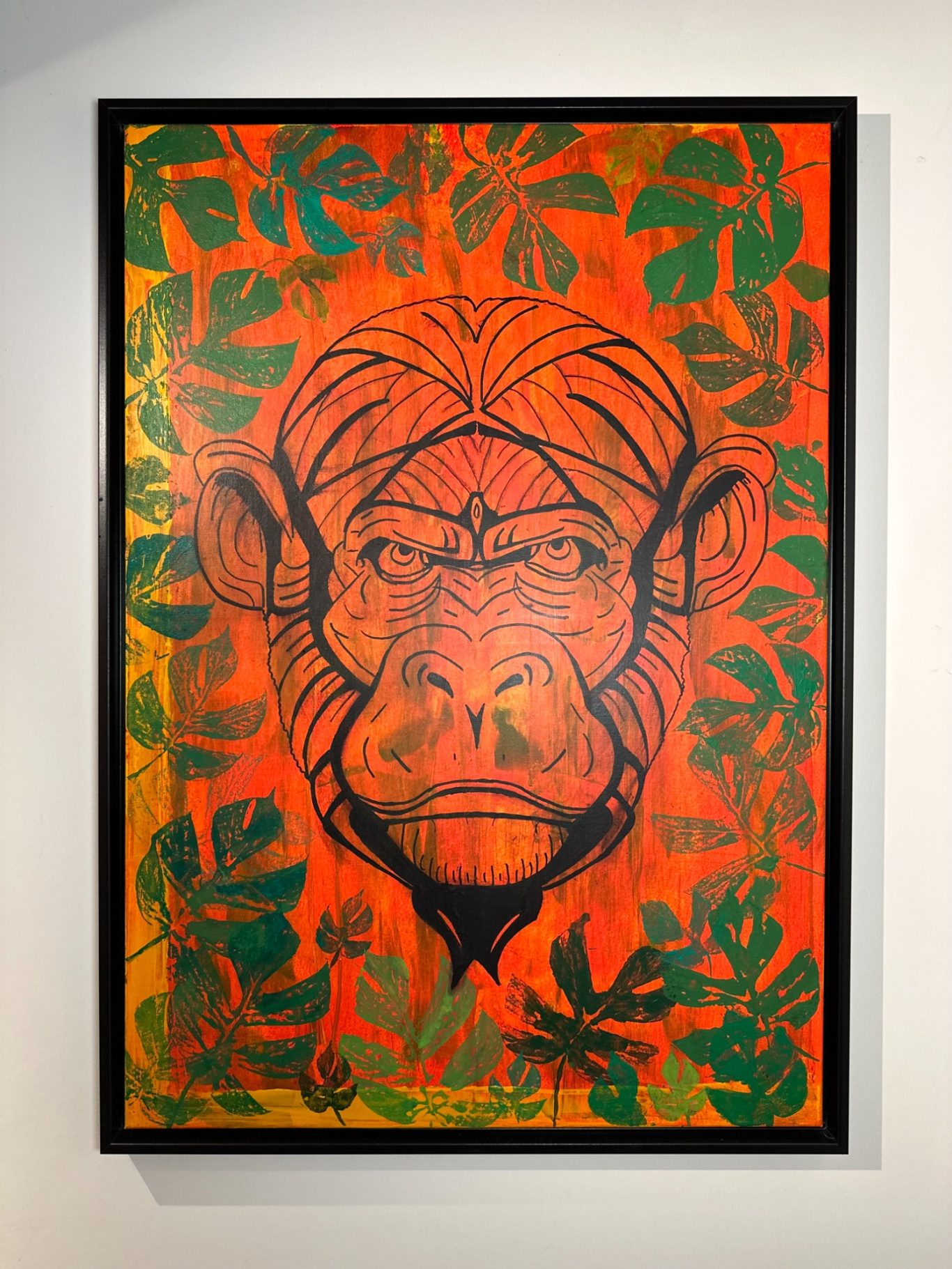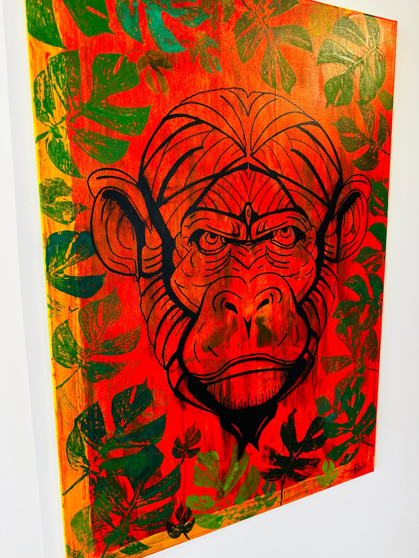 „Monkey“ entfaltet sich vor einem kraftvollen rötlich-orangenen Hintergrund, der die Energie und Intensität der Szenerie betont. Im dichten Dickicht erscheint der Affe lebendig und aufmerksam, als ob er gerade aus seinem Versteck hervorlugt. Die Kombination aus warmen Farbtönen und dynamischer Komposition vermittelt ein Gefühl von Lebendigkeit und Ungebundenheit. Dieses Werk fängt nicht nur die wilde Natur des Tiers ein, sondern auch die Spannung und das Geheimnis seiner Umgebung – eine Momentaufnahme voller Kraft, Neugier und natürlicher Anmut.