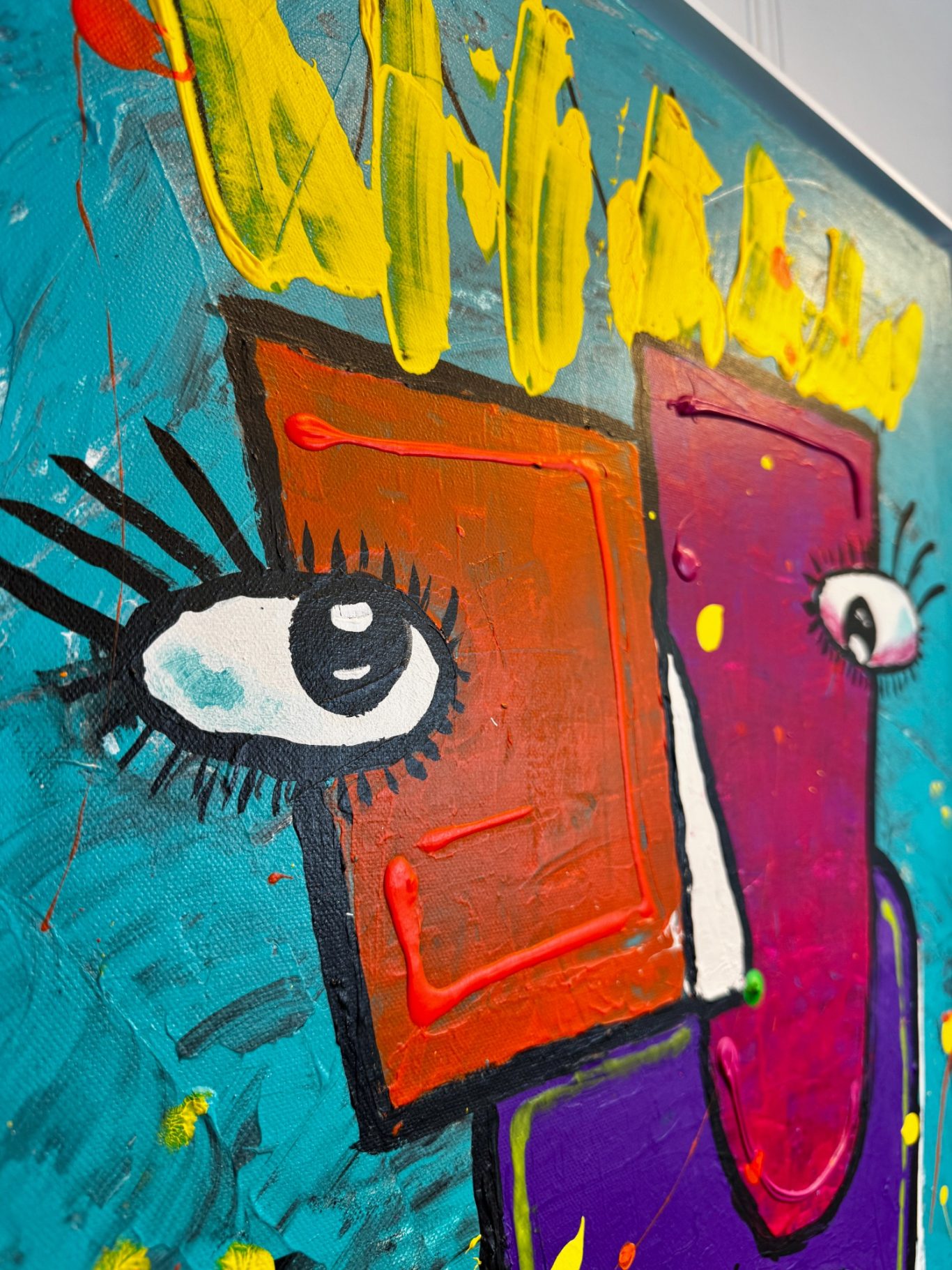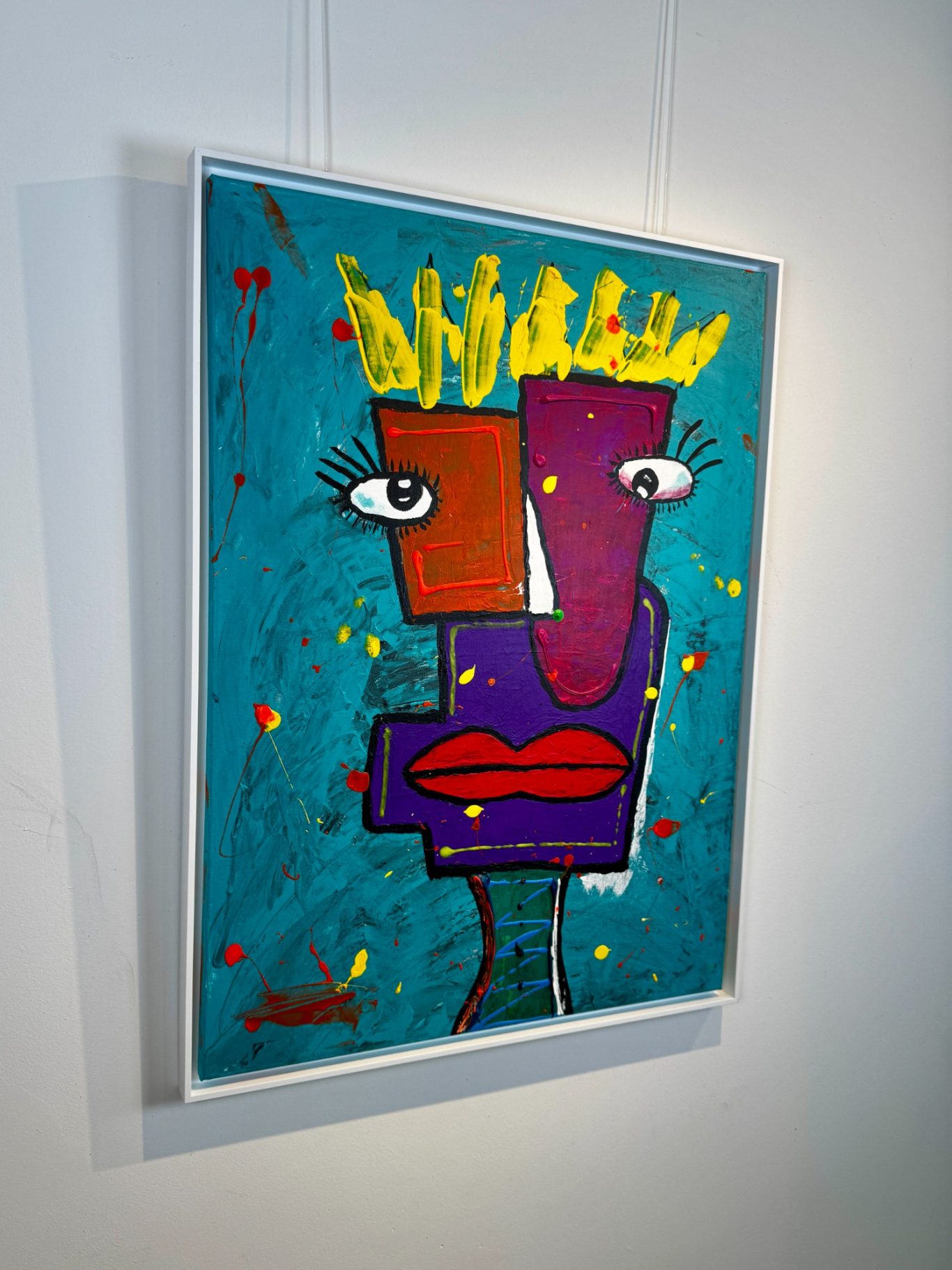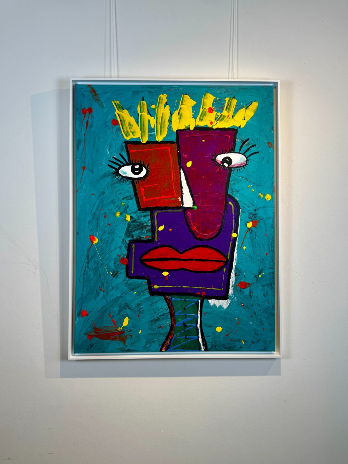 „Zwei Gesichter“ entfaltet auf einem strukturierten, türkisfarbenen Hintergrund ein geheimnisvolles Wesen mit zwei unterschiedlichen Gesichtshälften – eine leuchtend rot, die andere tief bordeauxfarben. Gekrönt von einer strahlend gelben Krone, wirkt die Figur zugleich mächtig und verletzlich. Der übergroße Mund dominiert den Körper und verleiht dem Werk eine expressive, beinahe surrealistische Kraft, während die blauen, schnurartig verschnürten Beine wie ein enges Korsett wirken – Symbol für Spannung, Kontrolle und innere Zerrissenheit. Ein faszinierendes Stück zwischen Fantasie, Identität und Ausdruck.
