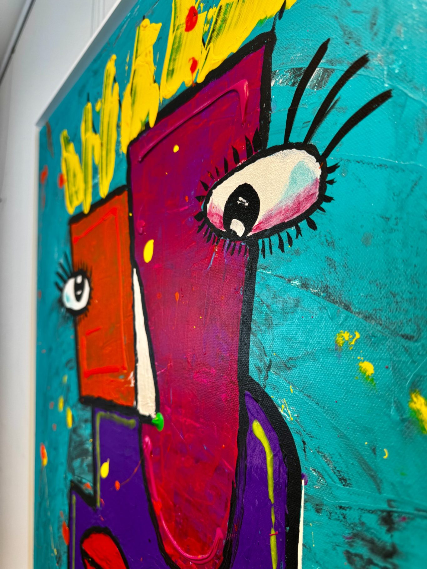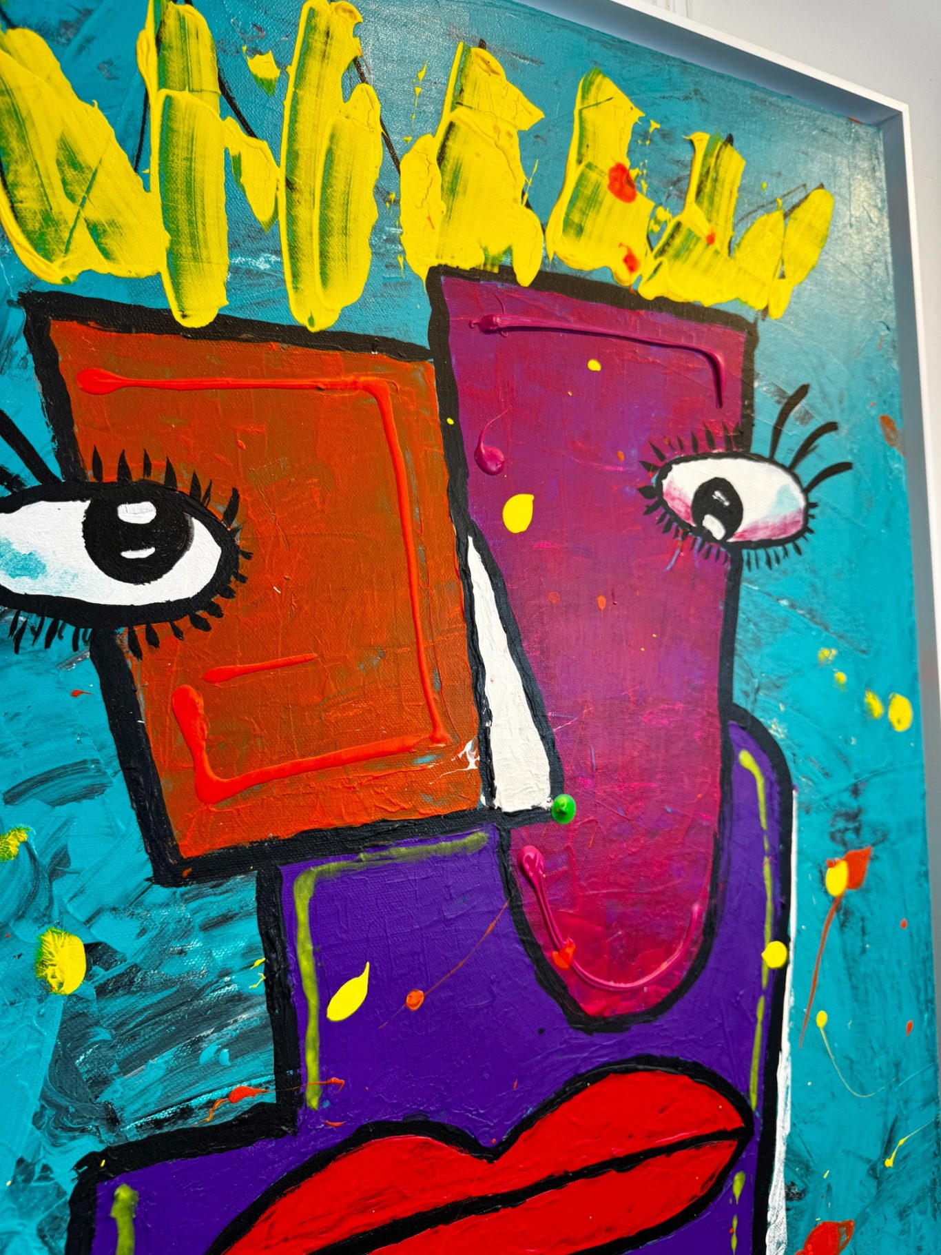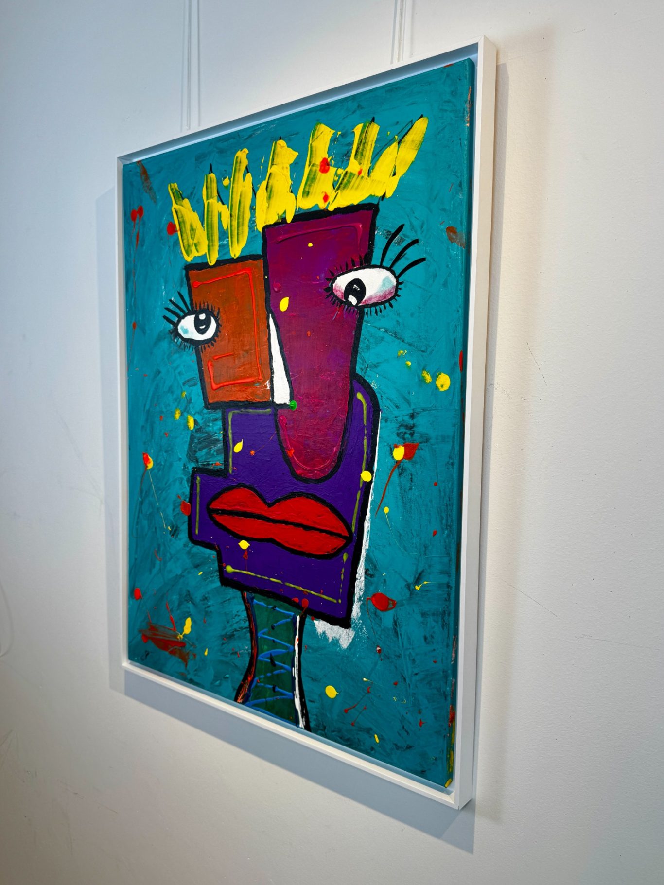 „Zwei Gesichter“ entfaltet auf einem strukturierten, türkisfarbenen Hintergrund ein geheimnisvolles Wesen mit zwei unterschiedlichen Gesichtshälften – eine leuchtend rot, die andere tief bordeauxfarben. Gekrönt von einer strahlend gelben Krone, wirkt die Figur zugleich mächtig und verletzlich. Der übergroße Mund dominiert den Körper und verleiht dem Werk eine expressive, beinahe surrealistische Kraft, während die blauen, schnurartig verschnürten Beine wie ein enges Korsett wirken – Symbol für Spannung, Kontrolle und innere Zerrissenheit. Ein faszinierendes Stück zwischen Fantasie, Identität und Ausdruck.