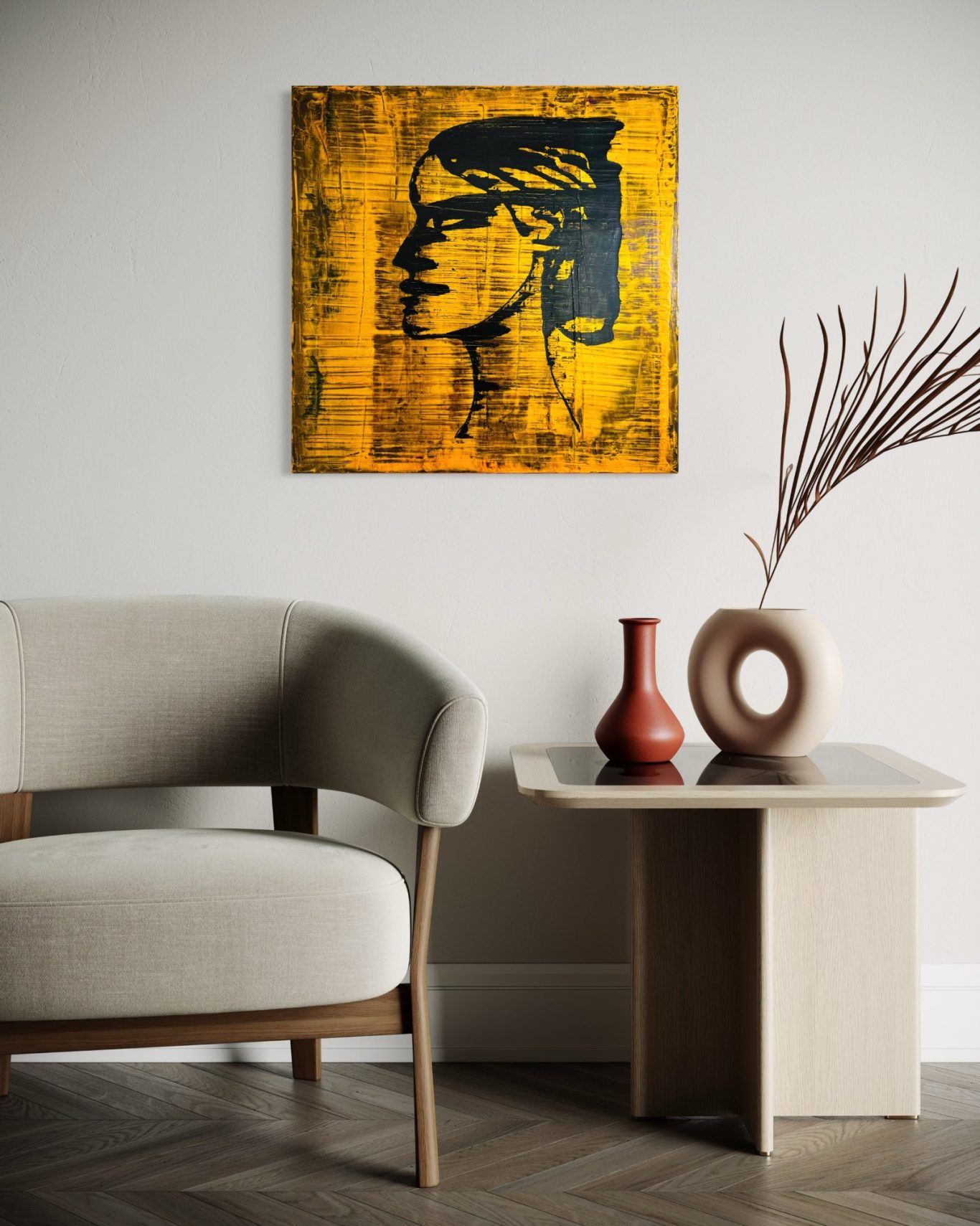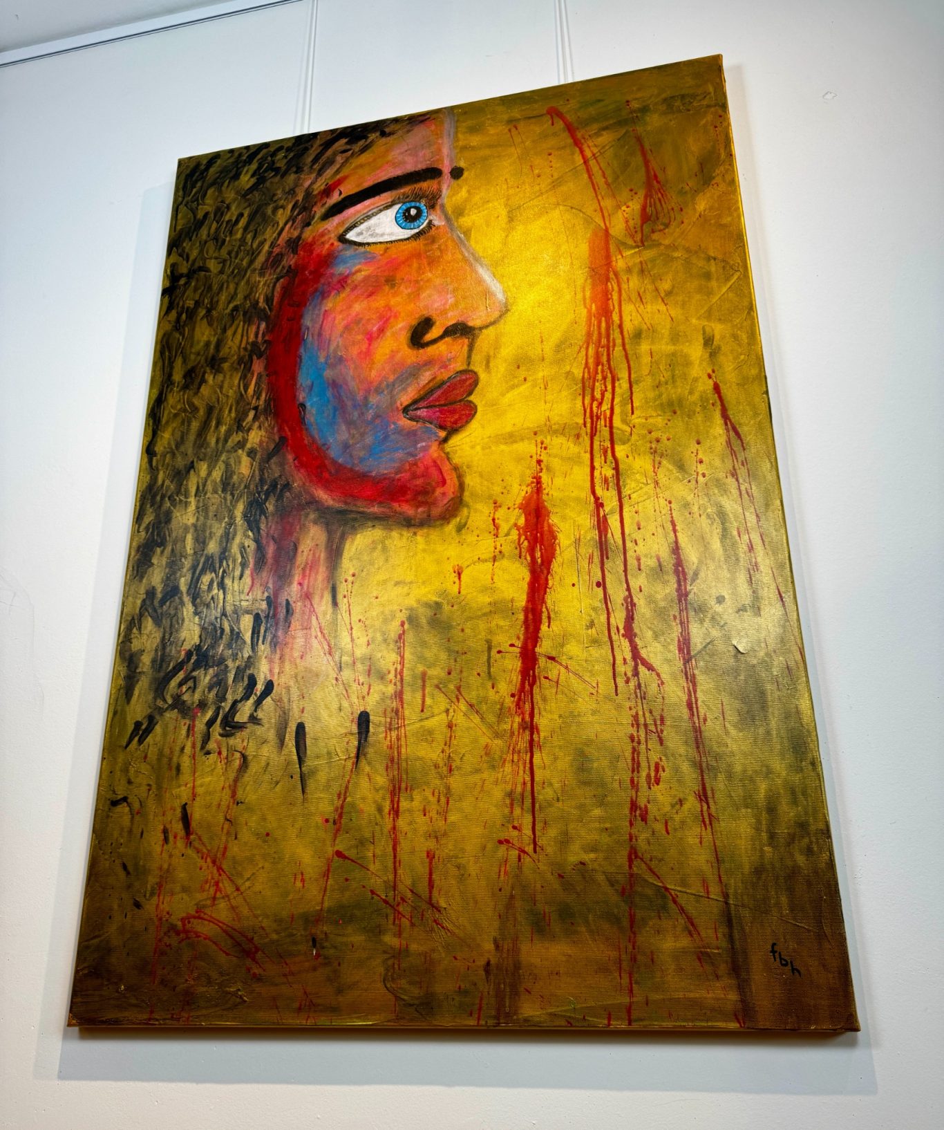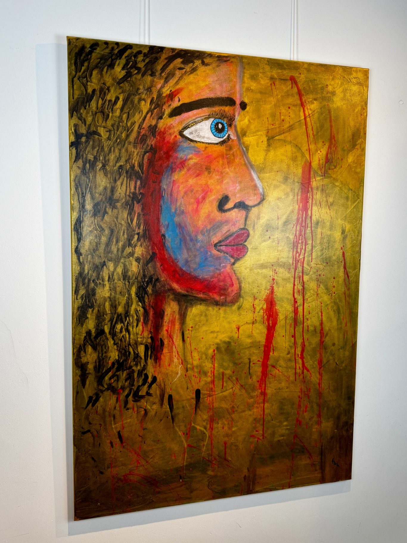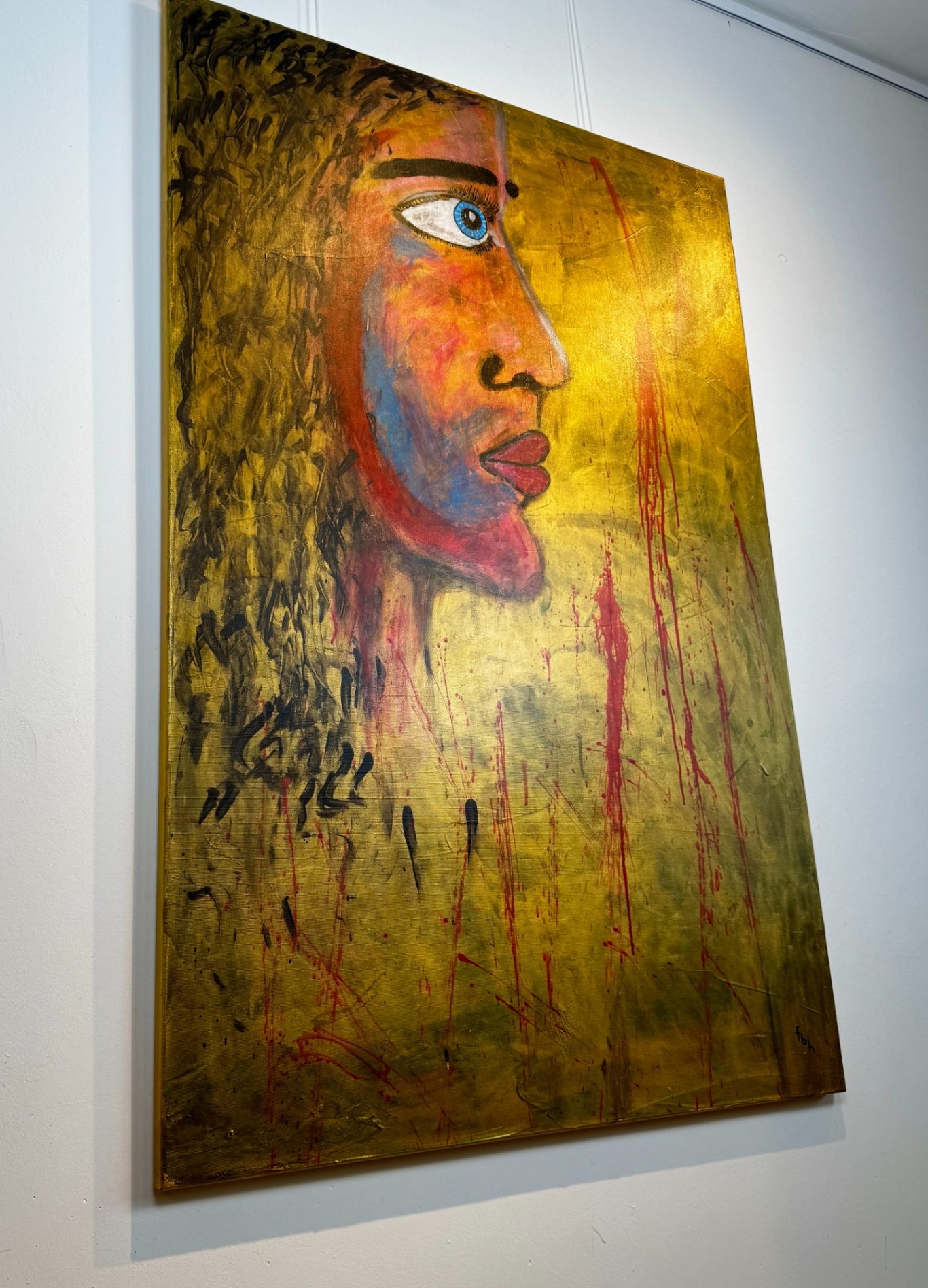 „Sofie“ ist ein ausdrucksstarkes Porträt, das ausschließlich mit den bloßen Händen geschaffen wurde – jede Spur, jede Form ein direkter Ausdruck der künstlerischen Intuition. Im Seitenprofil zeigt sich das markante Gesicht einer Frau vor einem goldenen, schimmernden Hintergrund, aus dem vereinzelt dunkle Tiefe hervortritt. Rote Wangen, ein charaktervoll geformtes Kinn und eine markante Nase verleihen der Figur Stärke und Persönlichkeit, während die nach vorn gerichteten Augen Entschlossenheit und Präsenz ausstrahlen. Ein kraftvolles Werk, das Nähe, Intensität und Individualität spürbar macht.
