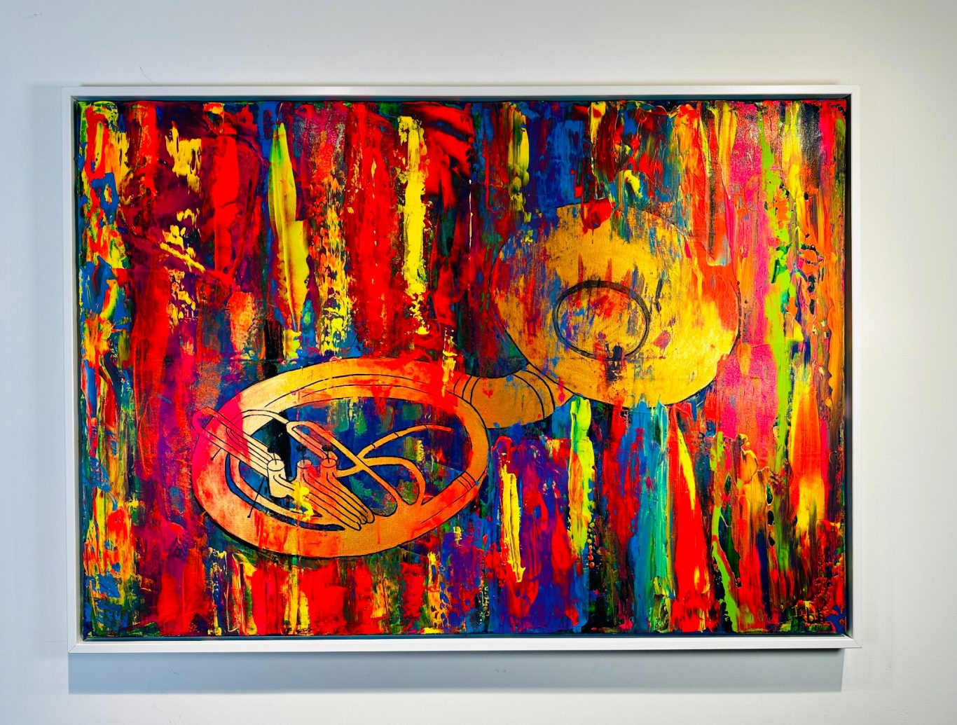 „Emotions“ lebt von kraftvollen, leuchtenden Farben, die den Hintergrund wie ein emotionales Klangfeld durchziehen. Tief im Bild eingebettet liegt ein Sousaphon, dessen geschwungene Form fast mit dem Werk verschmilzt und dennoch eine starke Präsenz entfaltet.