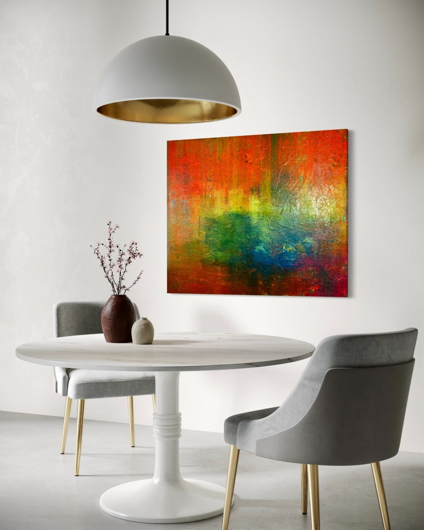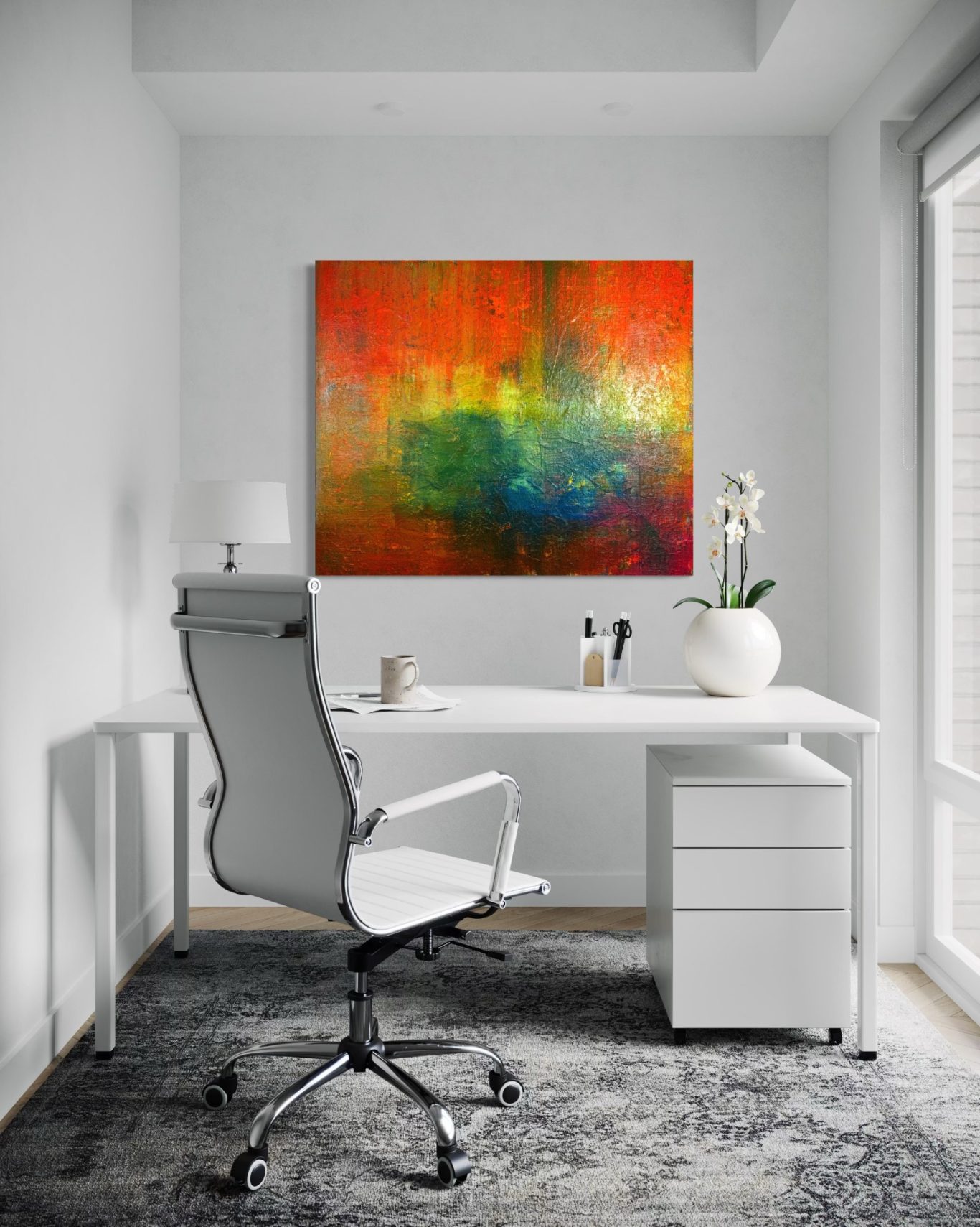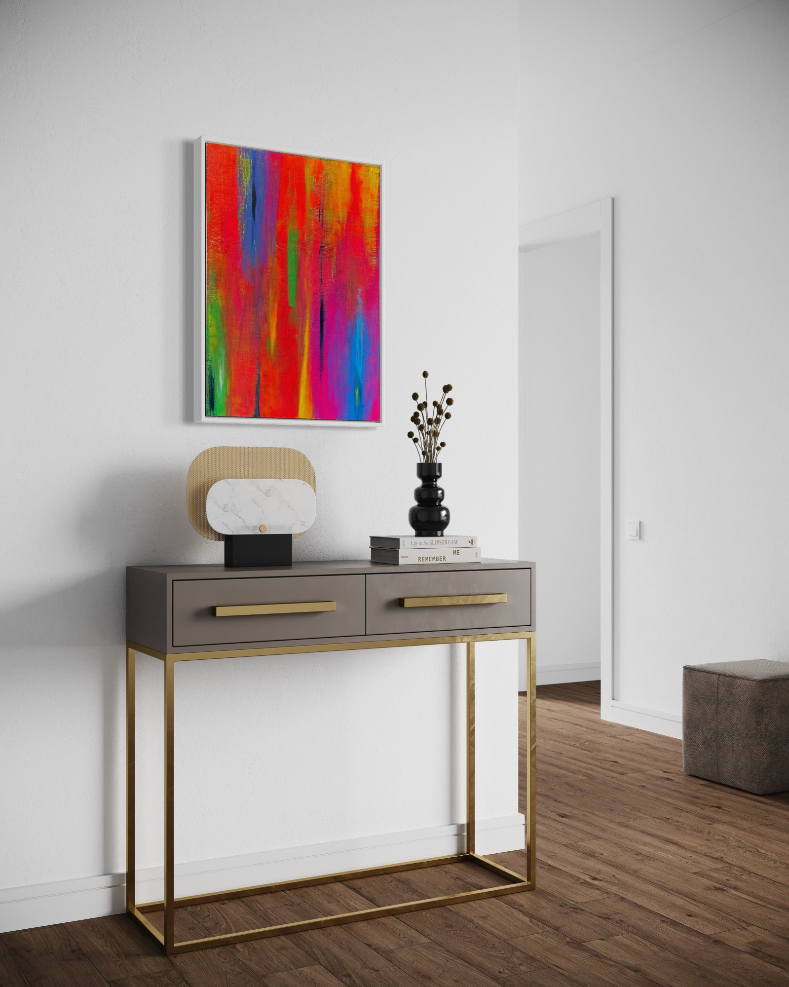 „Aurora Inferno“ ist ein Bild voller Energie und Dynamik – ein visueller Sturm aus Farbe und Licht, der Wärme, Kraft und Faszination in den Raum trägt.