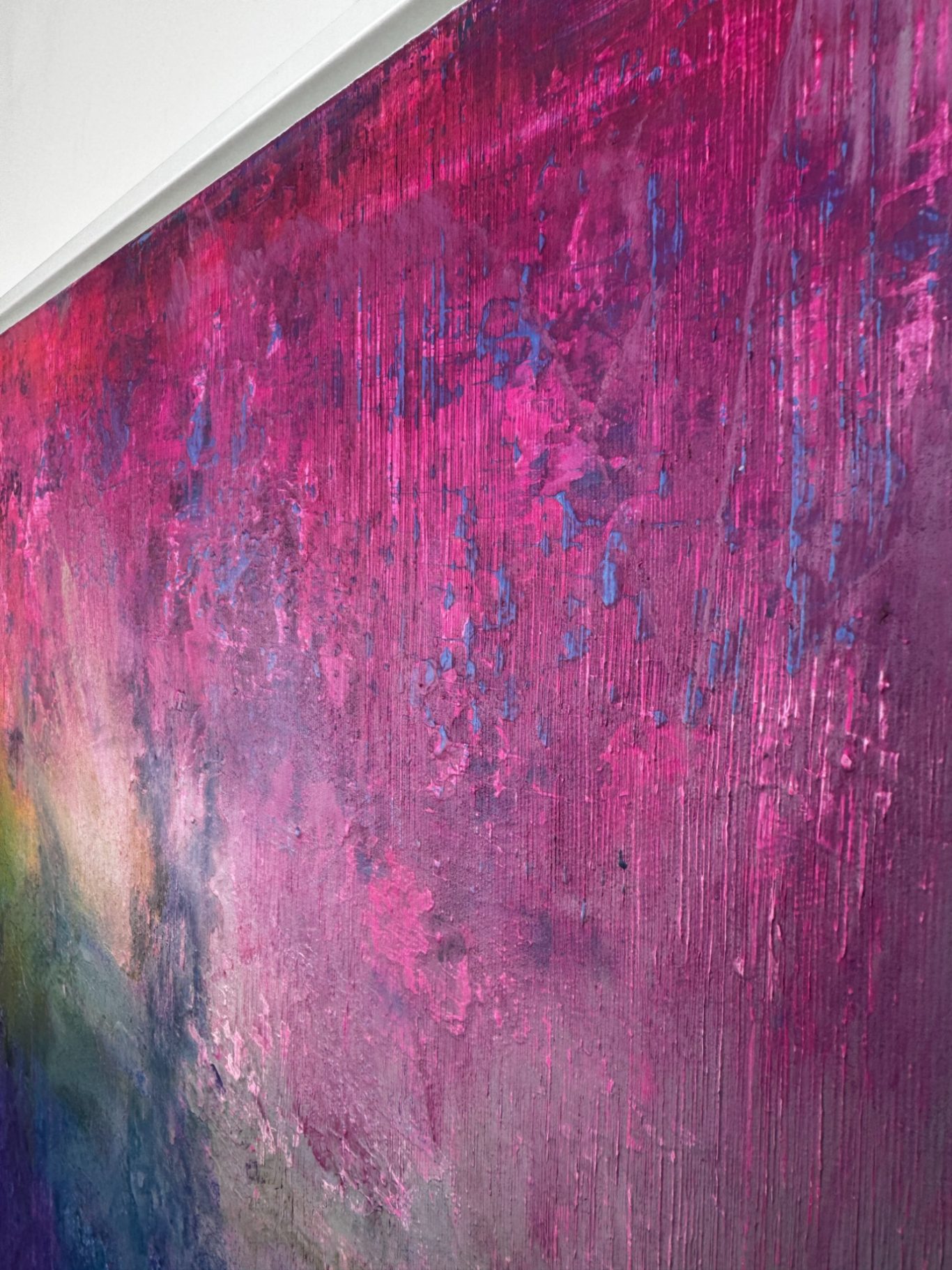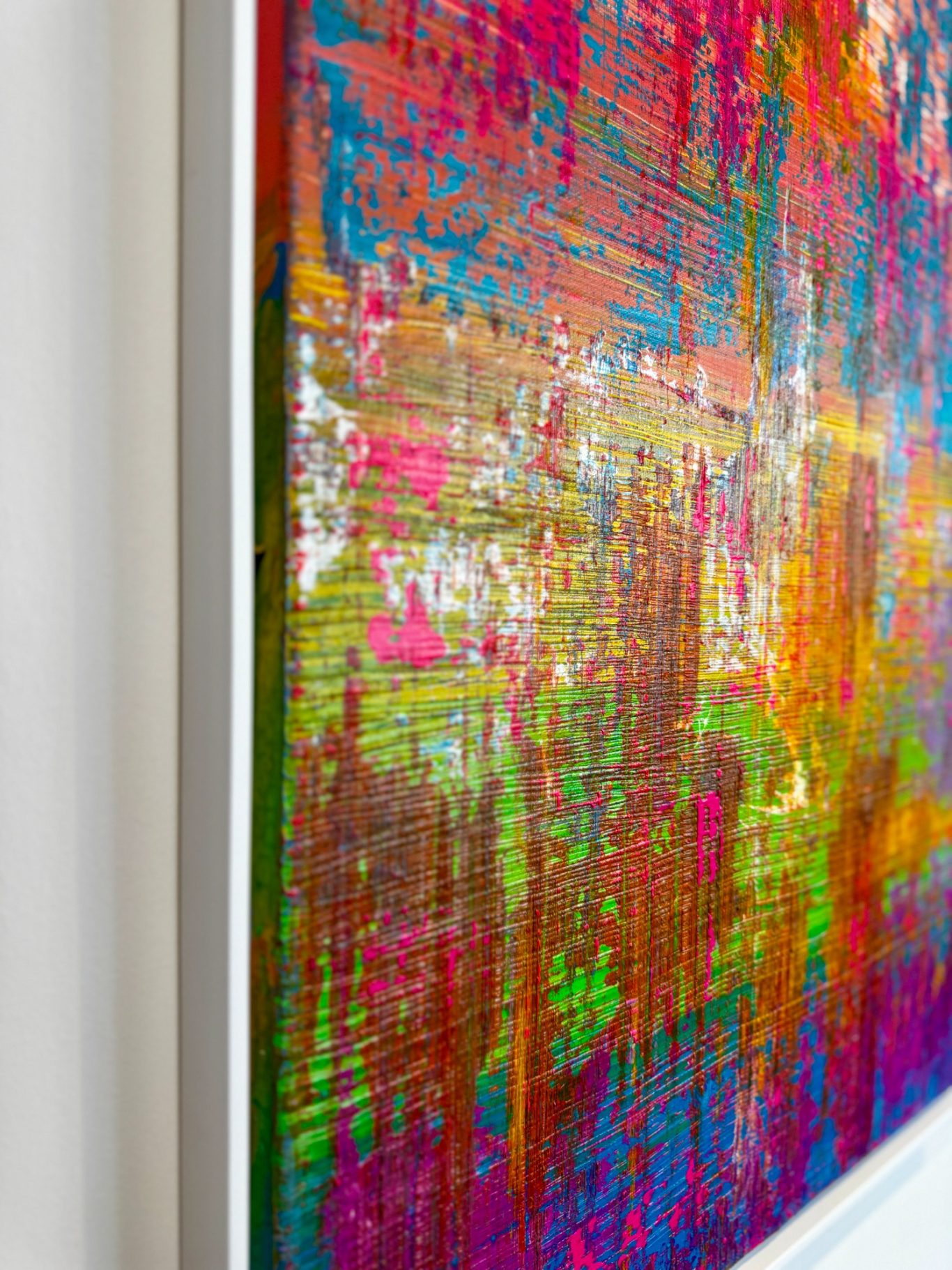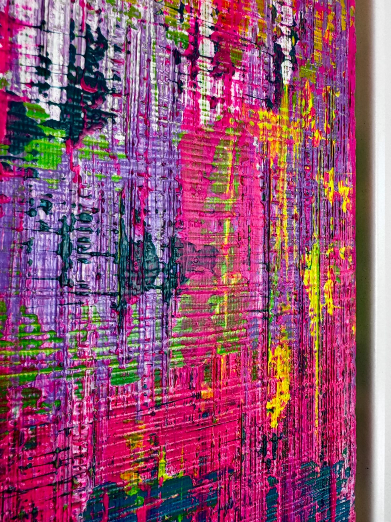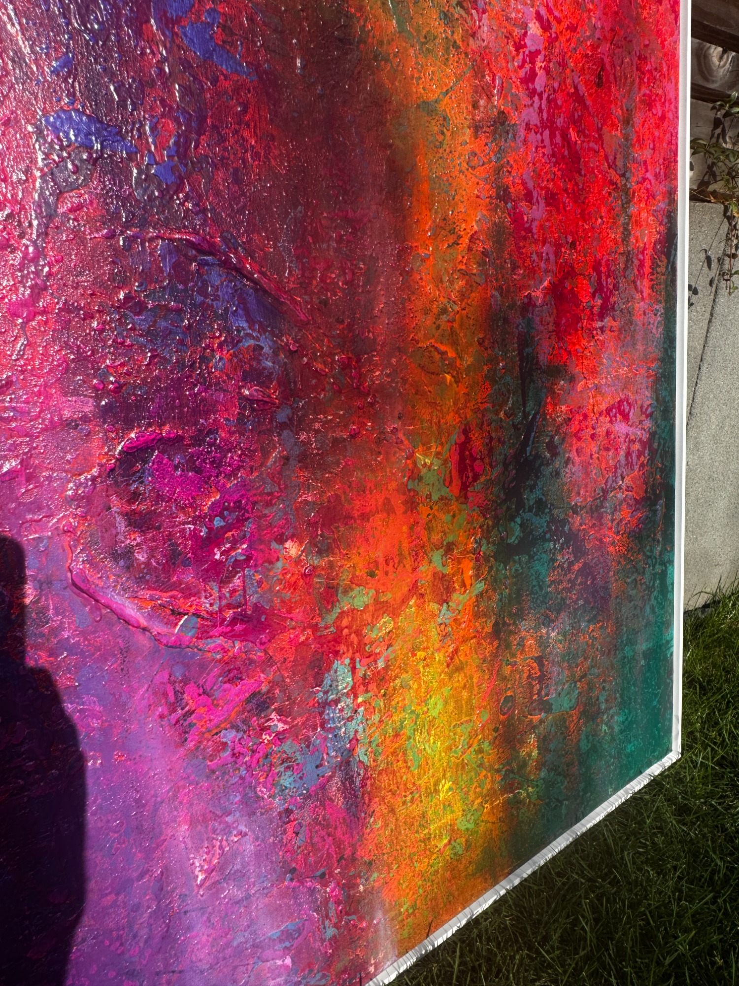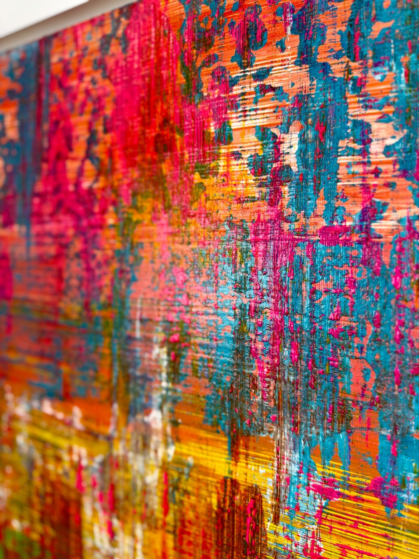 „Farbrauschen“ verdichtet leuchtende Schichten aus Magenta, Türkis, Gelb und Rot zu einem vibrierenden Farbspiel, das die Sinne umhüllt. Die mit dem Spachtel aufgetragene Struktur erzeugt eine lebendige Oberfläche, auf der Licht und Farbe in ständiger Bewegung zu sein scheinen – fast so, als würde die Leinwand selbst atmen.