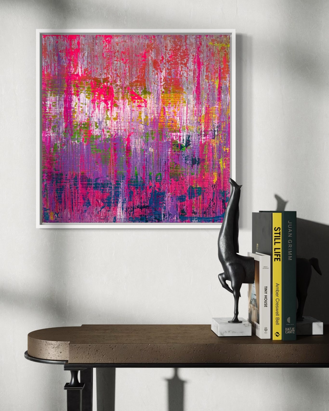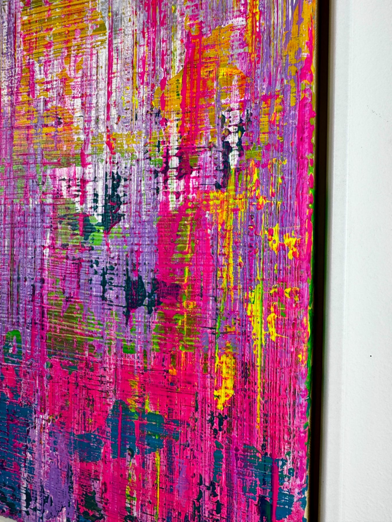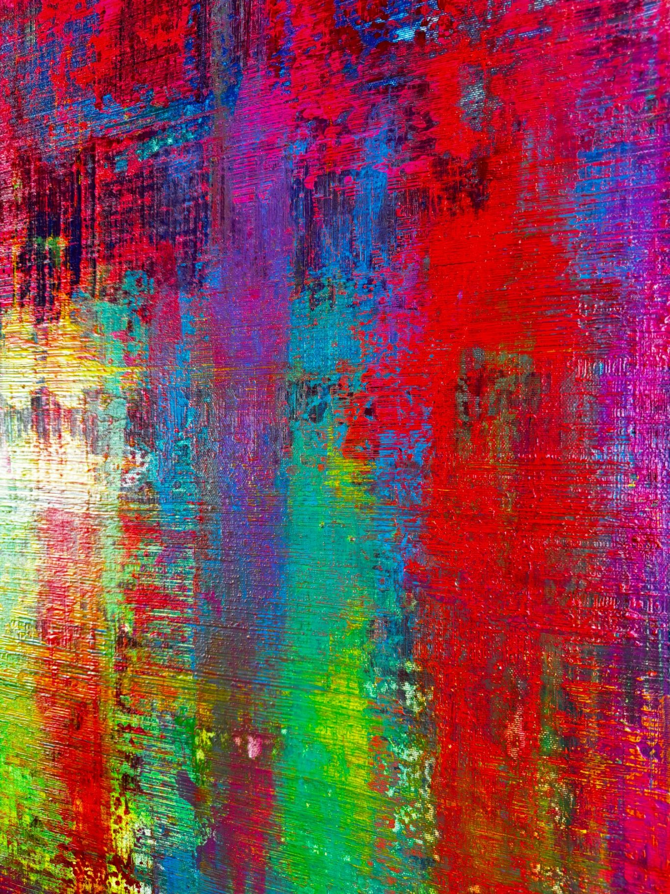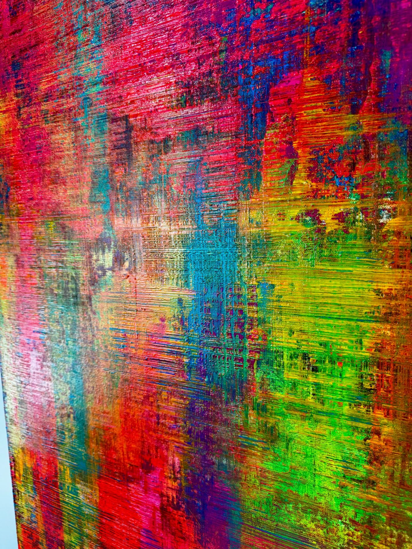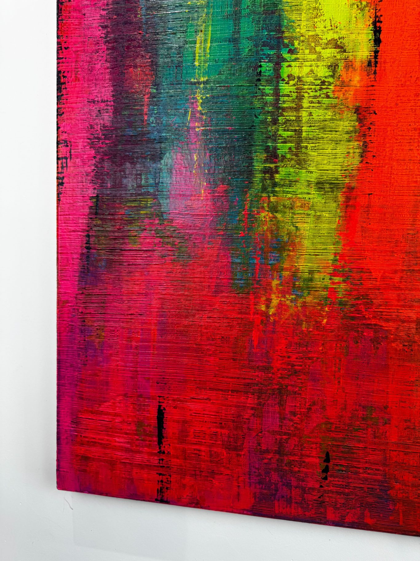 „Farbrauschen“ verdichtet leuchtende Schichten aus Magenta, Türkis, Gelb und Rot zu einem vibrierenden Farbspiel, das die Sinne umhüllt. Die mit dem Spachtel aufgetragene Struktur erzeugt eine lebendige Oberfläche, auf der Licht und Farbe in ständiger Bewegung zu sein scheinen – fast so, als würde die Leinwand selbst atmen.