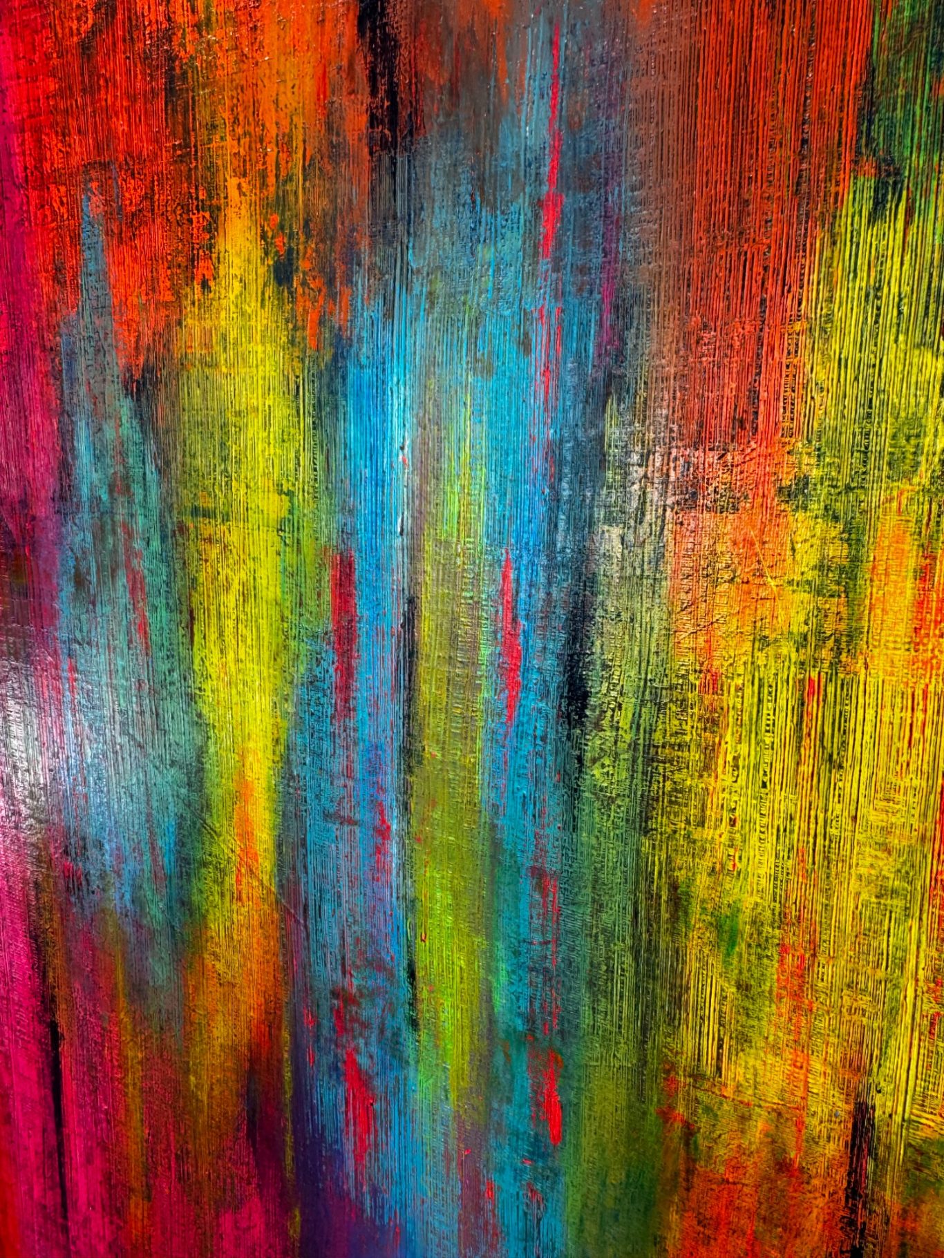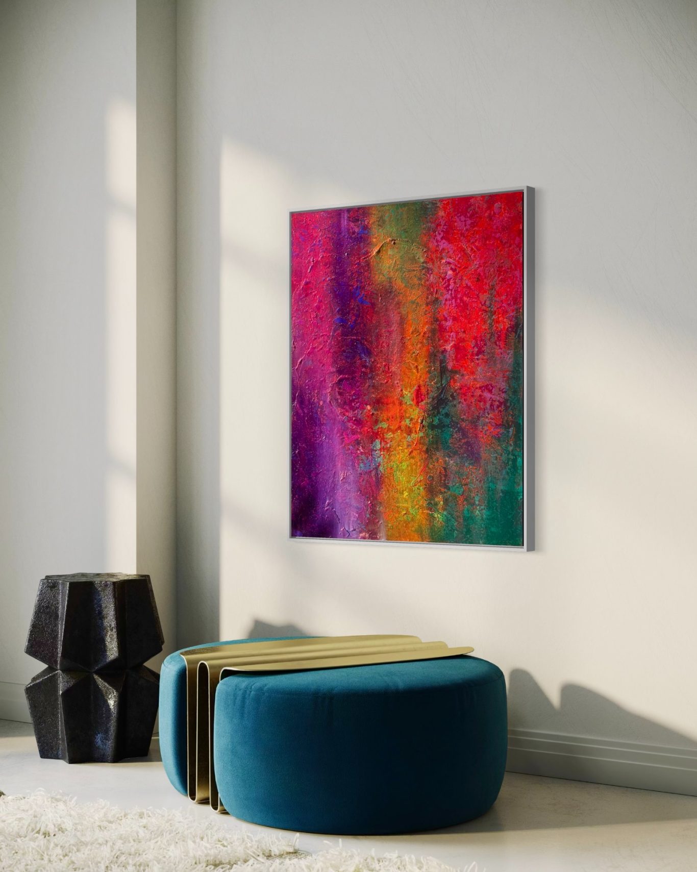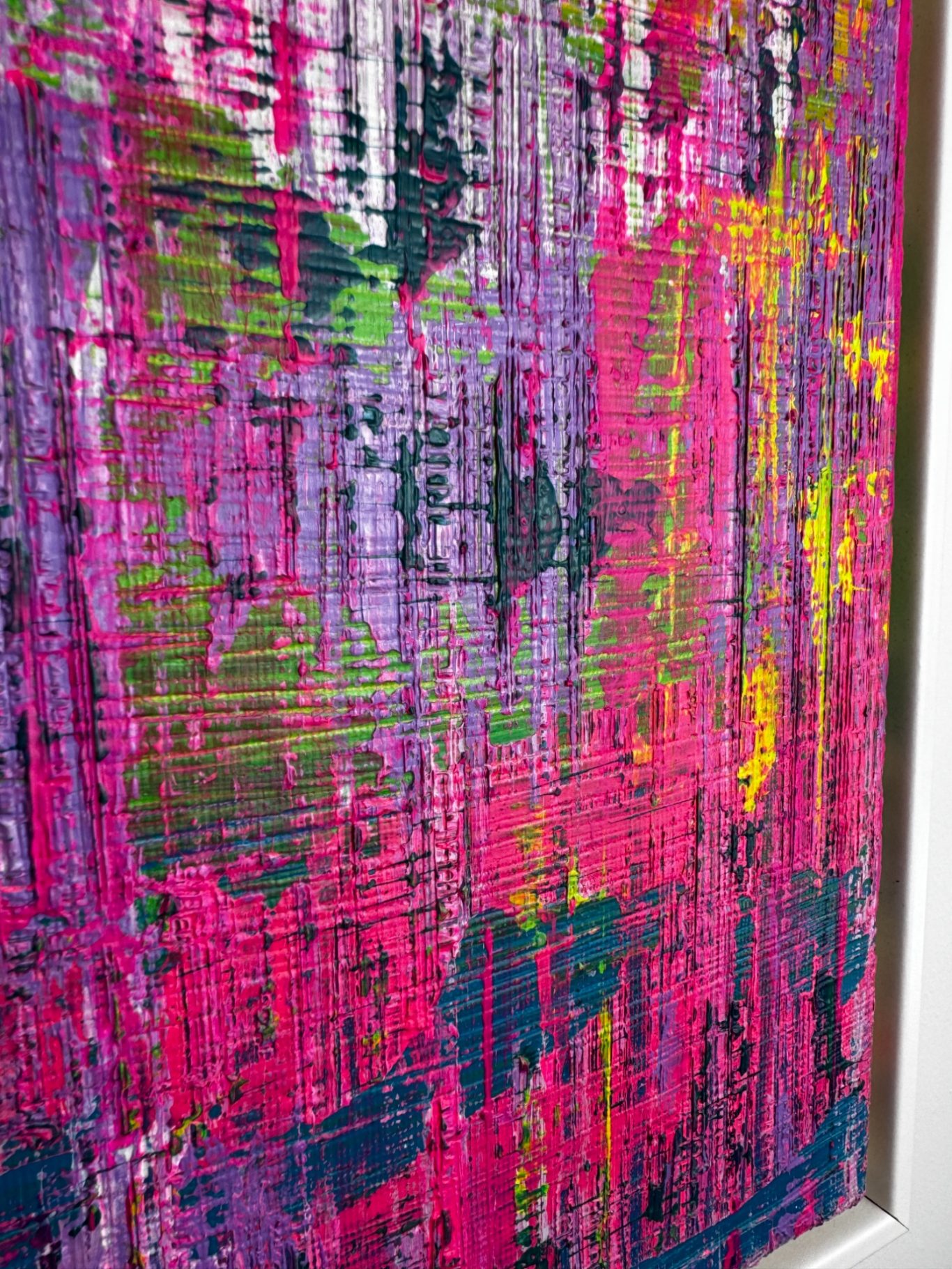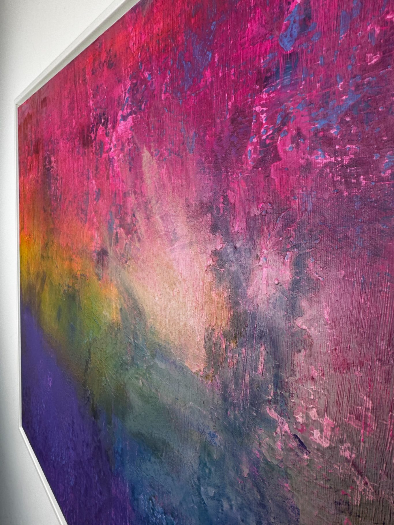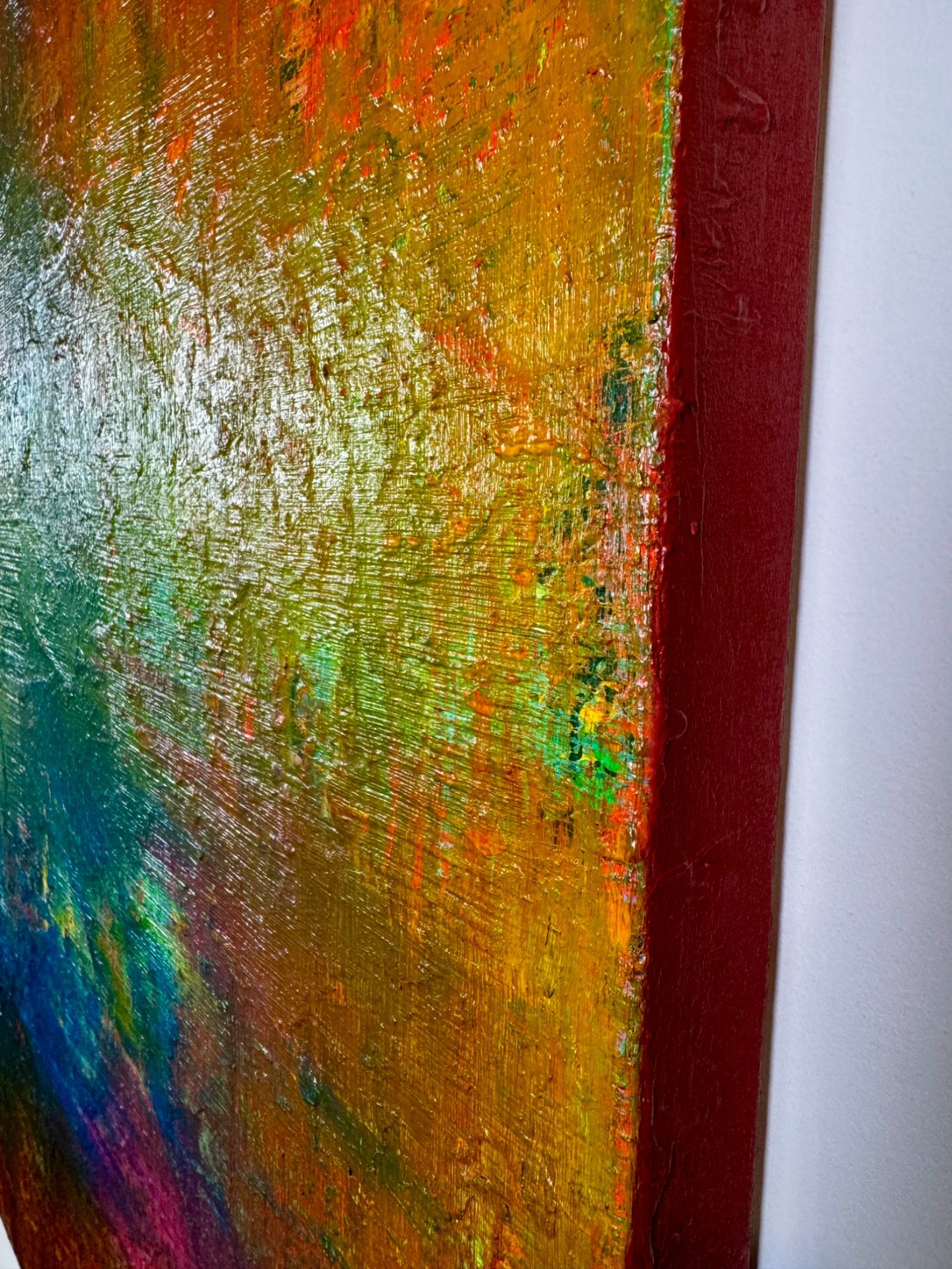 „Farbrauschen“ verdichtet leuchtende Schichten aus Magenta, Türkis, Gelb und Rot zu einem vibrierenden Farbspiel, das die Sinne umhüllt. Die mit dem Spachtel aufgetragene Struktur erzeugt eine lebendige Oberfläche, auf der Licht und Farbe in ständiger Bewegung zu sein scheinen – fast so, als würde die Leinwand selbst atmen.