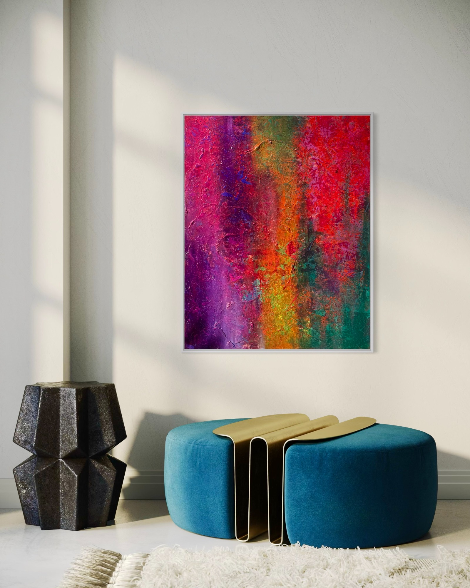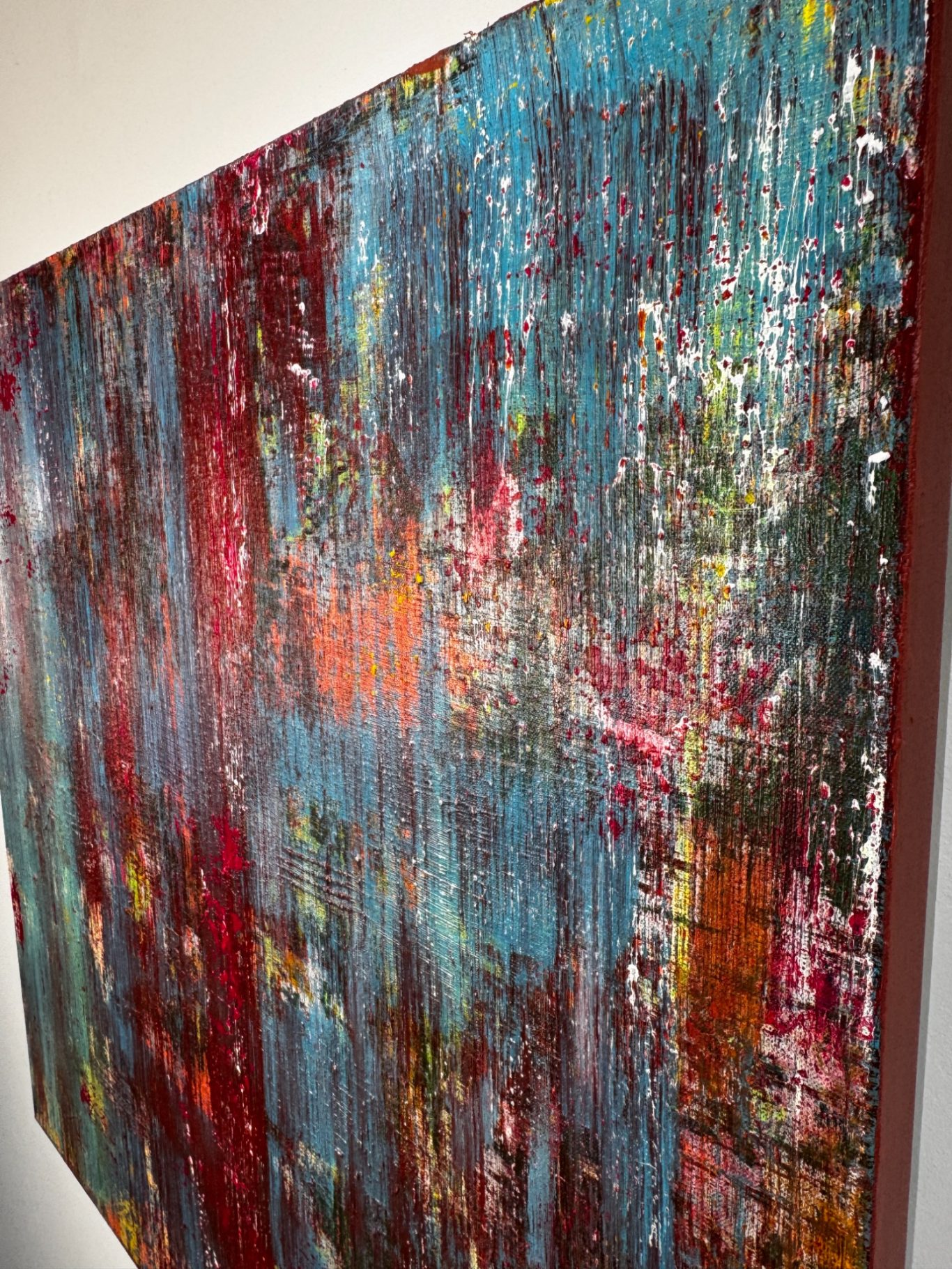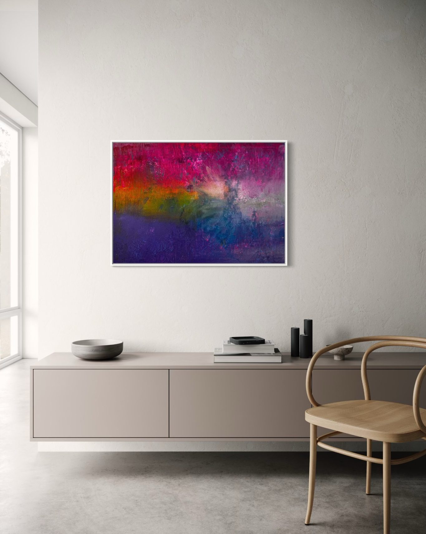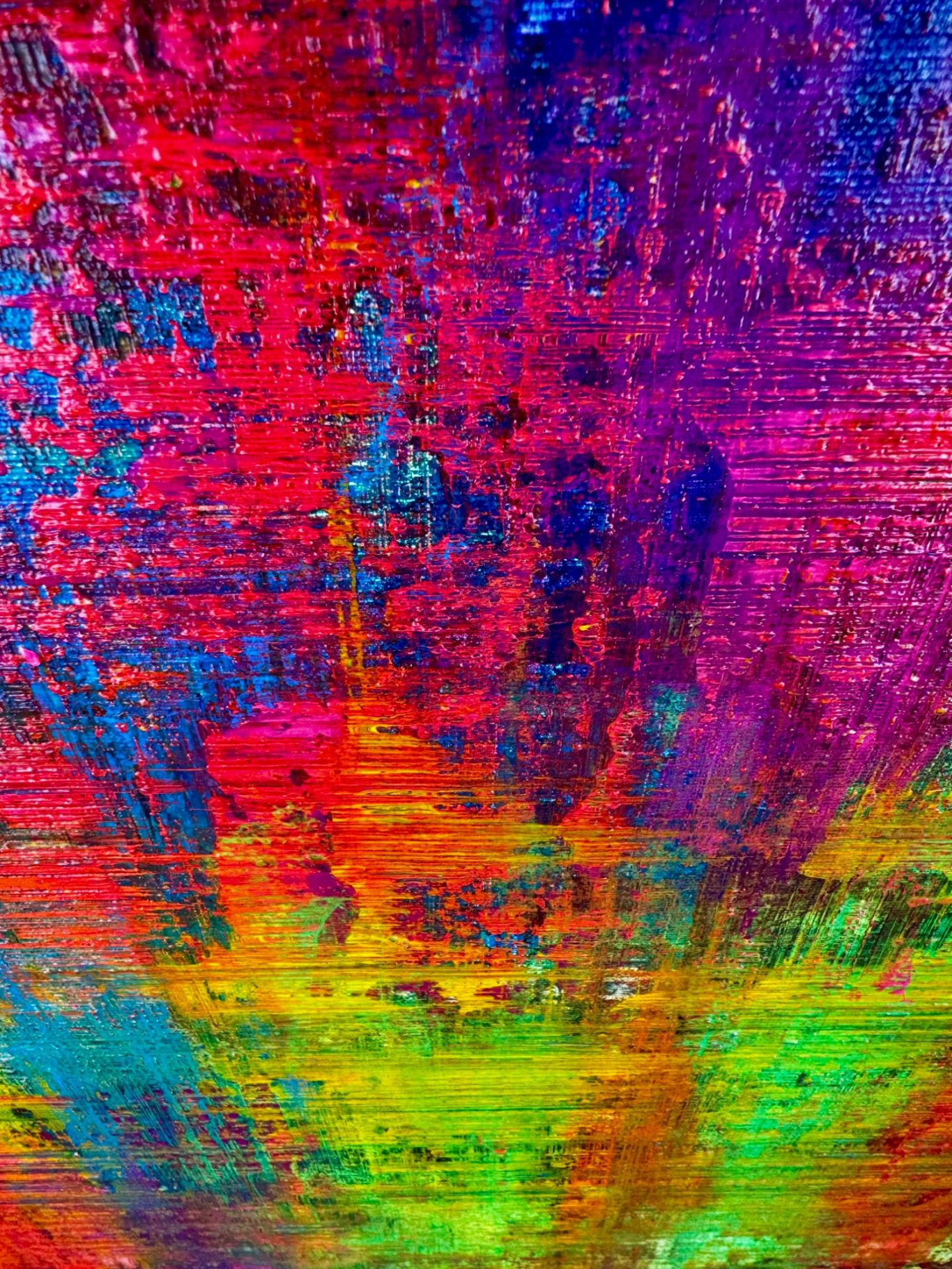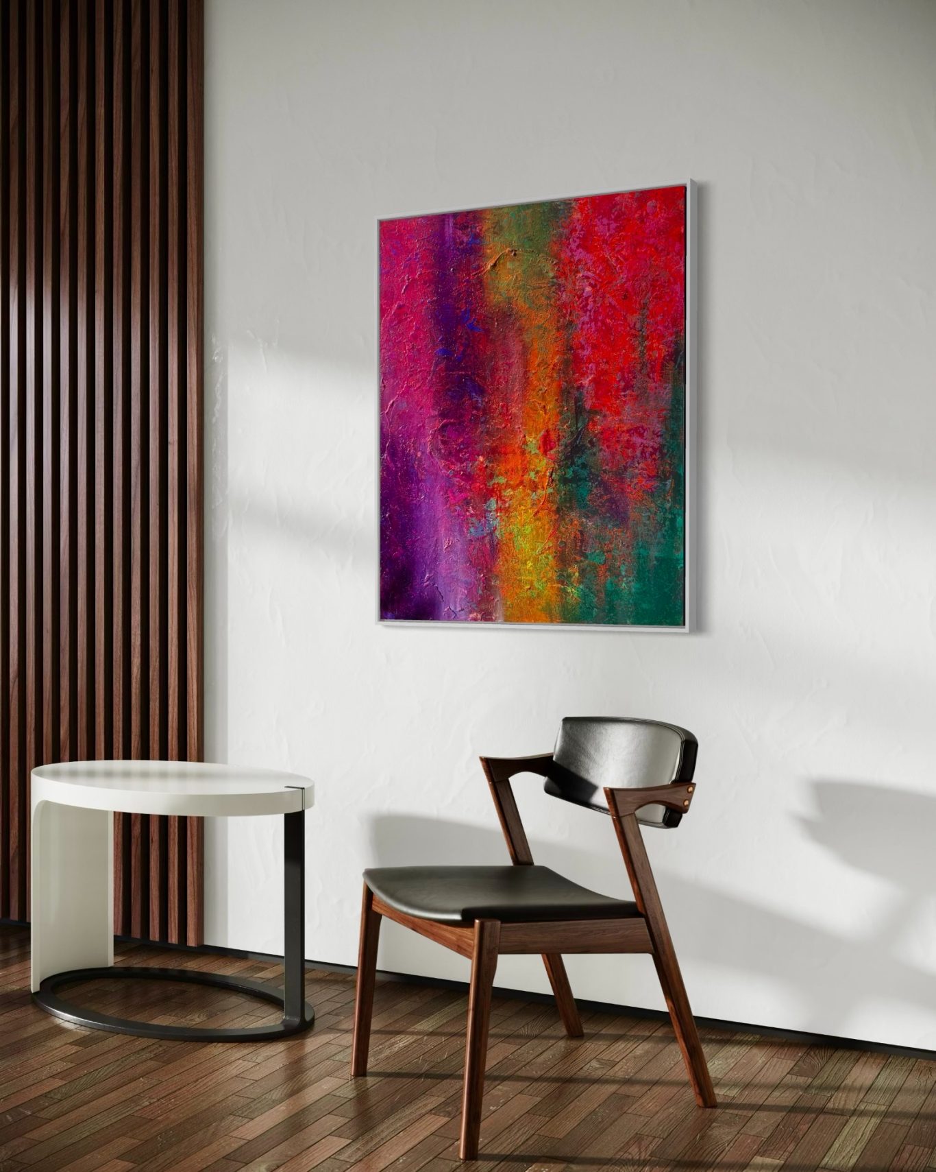 „Farbrauschen“ verdichtet leuchtende Schichten aus Magenta, Türkis, Gelb und Rot zu einem vibrierenden Farbspiel, das die Sinne umhüllt. Die mit dem Spachtel aufgetragene Struktur erzeugt eine lebendige Oberfläche, auf der Licht und Farbe in ständiger Bewegung zu sein scheinen – fast so, als würde die Leinwand selbst atmen.