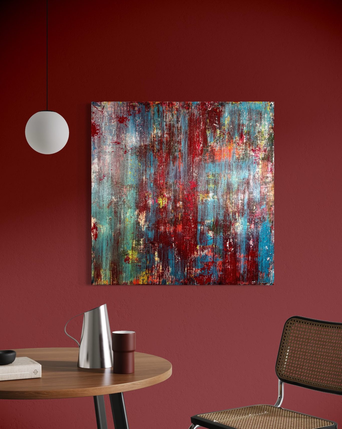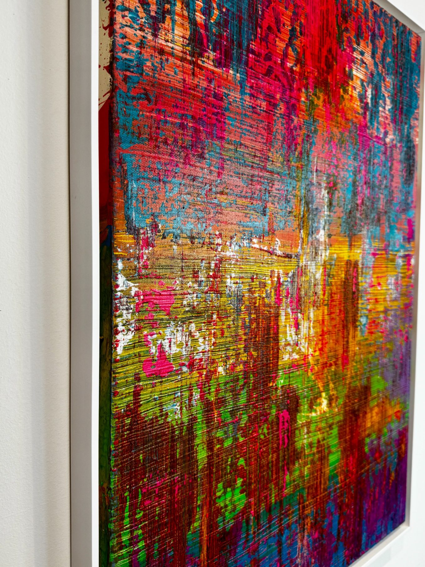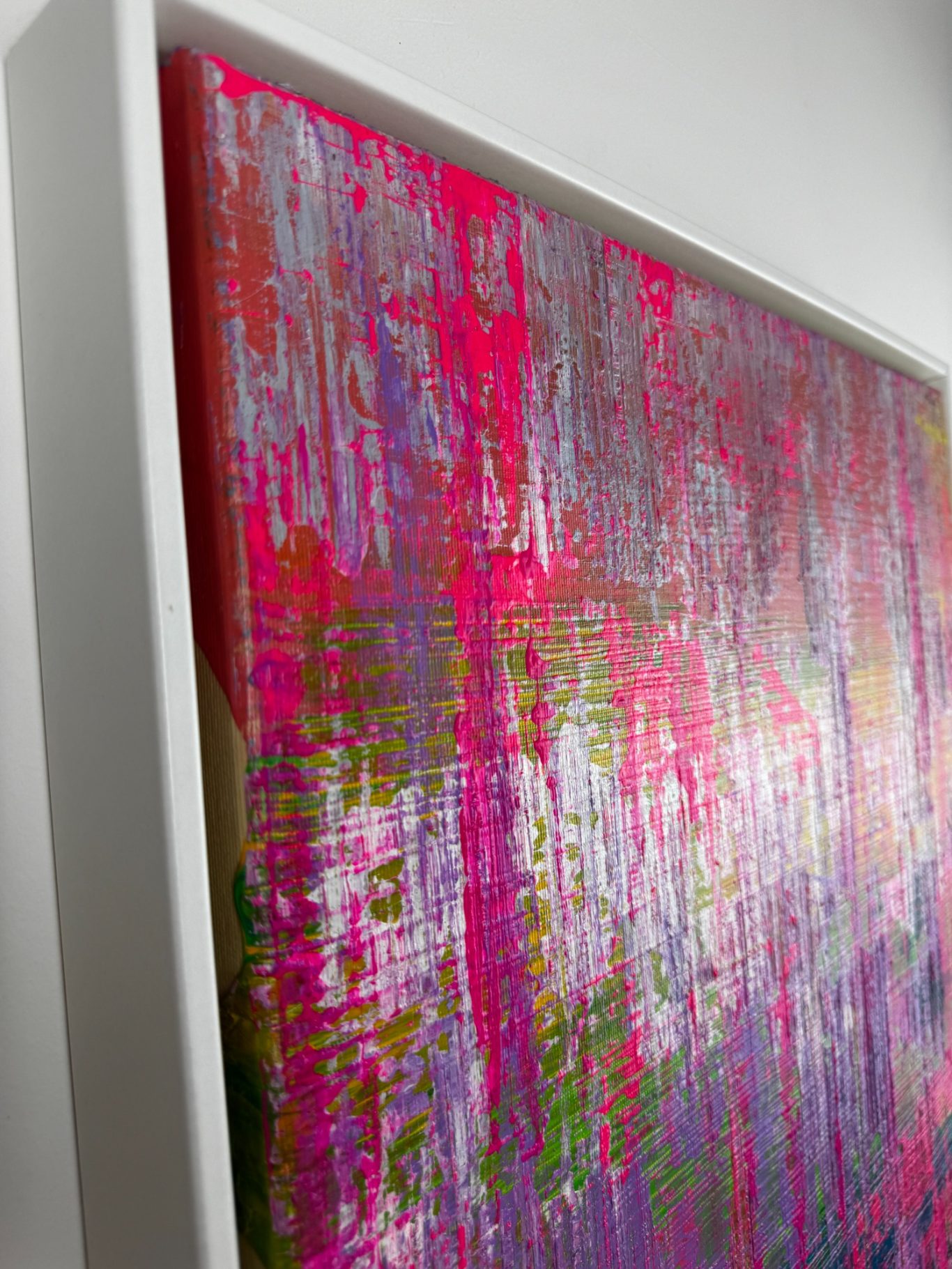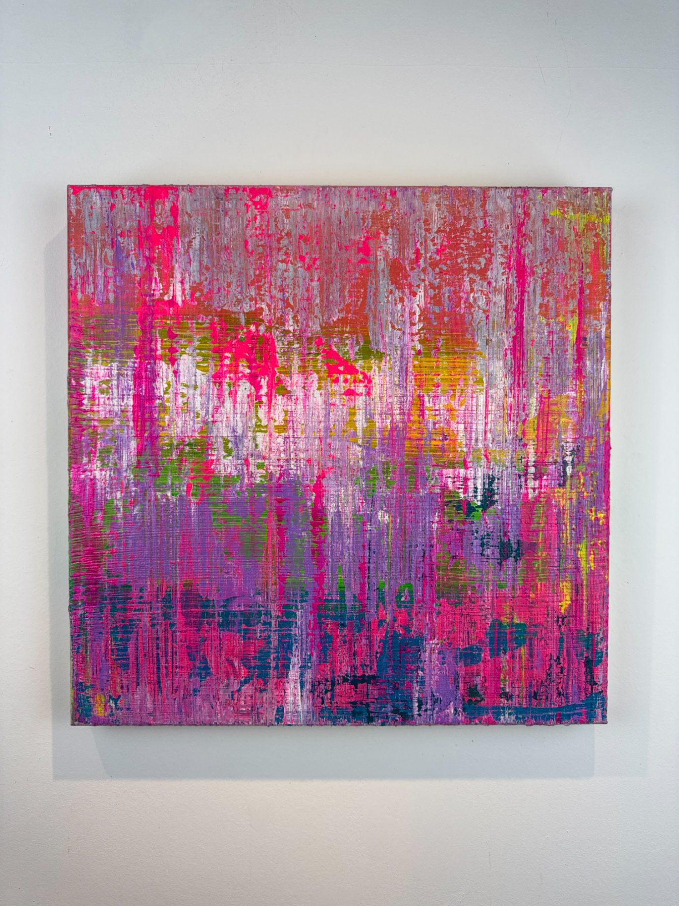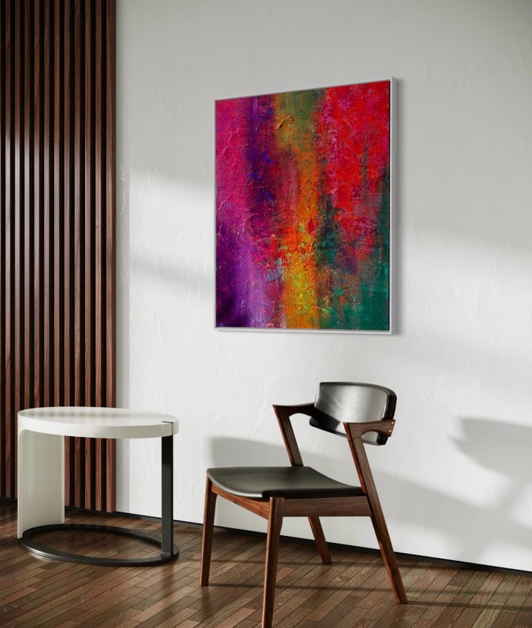 „Farbrauschen“ verdichtet leuchtende Schichten aus Magenta, Türkis, Gelb und Rot zu einem vibrierenden Farbspiel, das die Sinne umhüllt. Die mit dem Spachtel aufgetragene Struktur erzeugt eine lebendige Oberfläche, auf der Licht und Farbe in ständiger Bewegung zu sein scheinen – fast so, als würde die Leinwand selbst atmen.