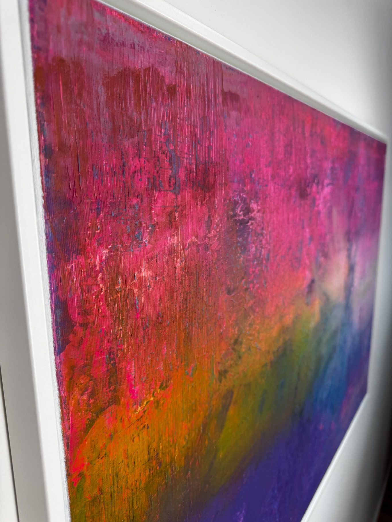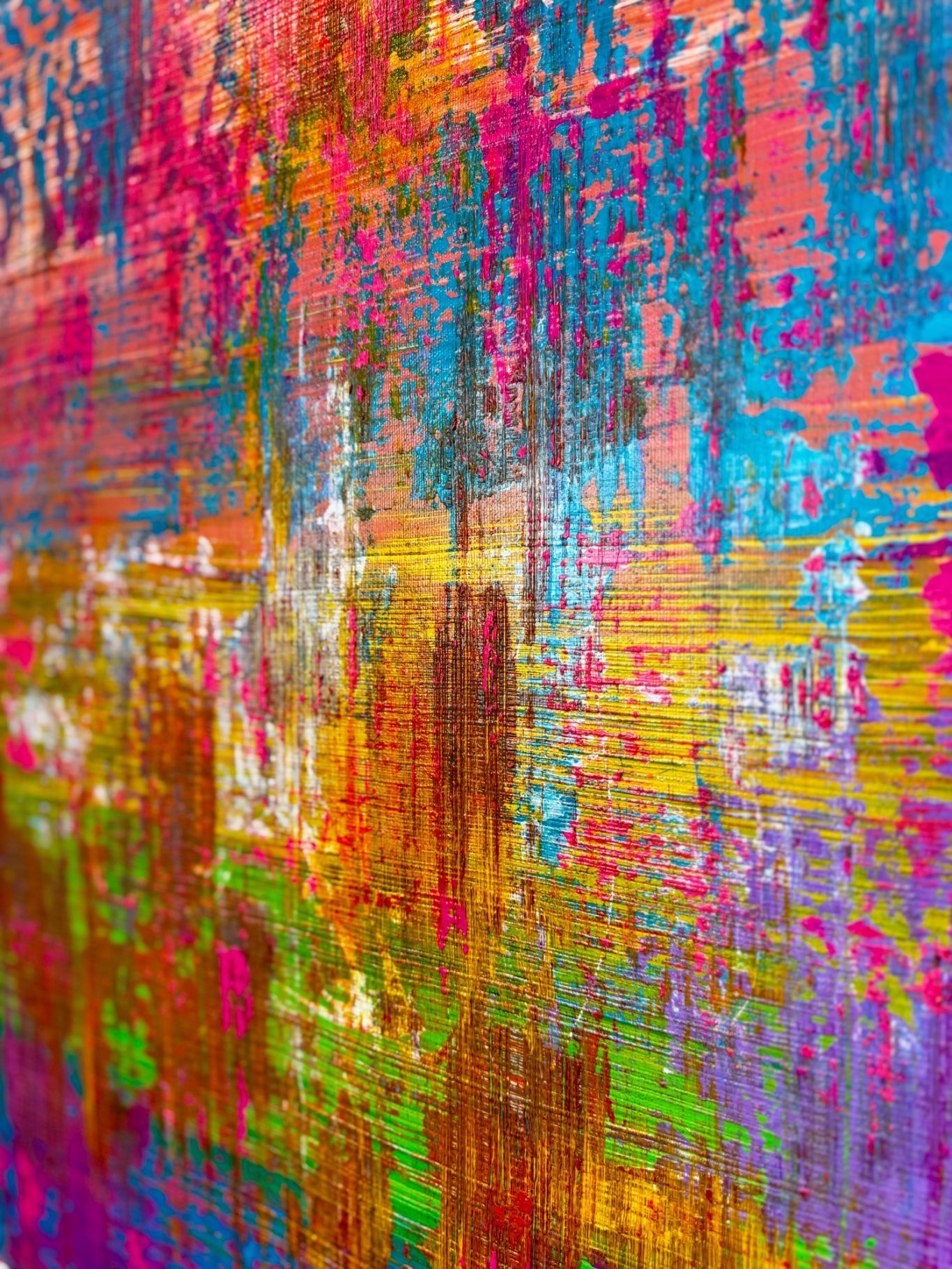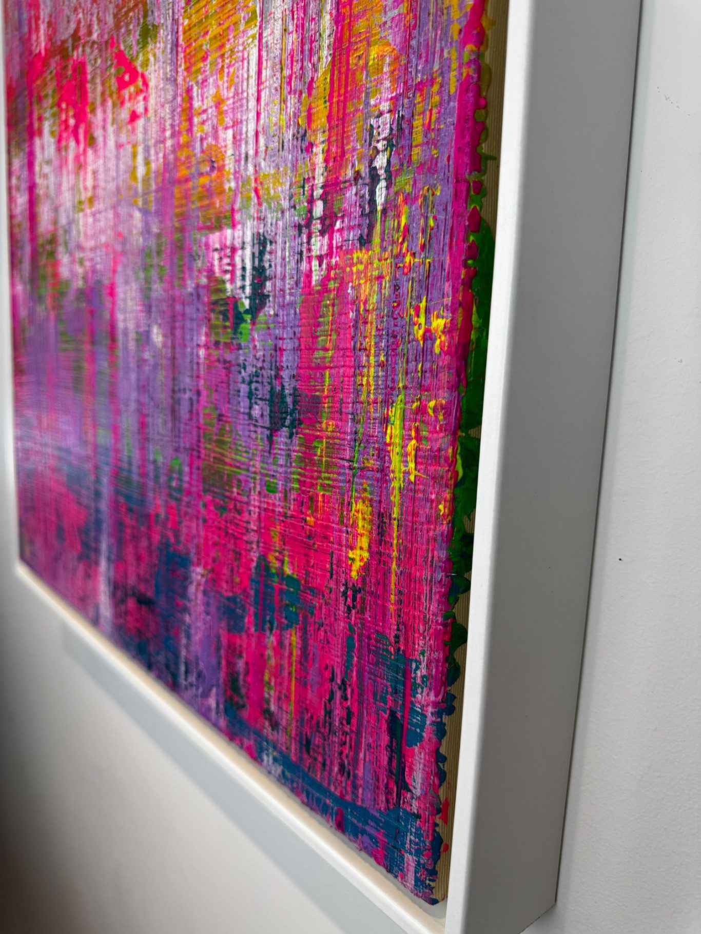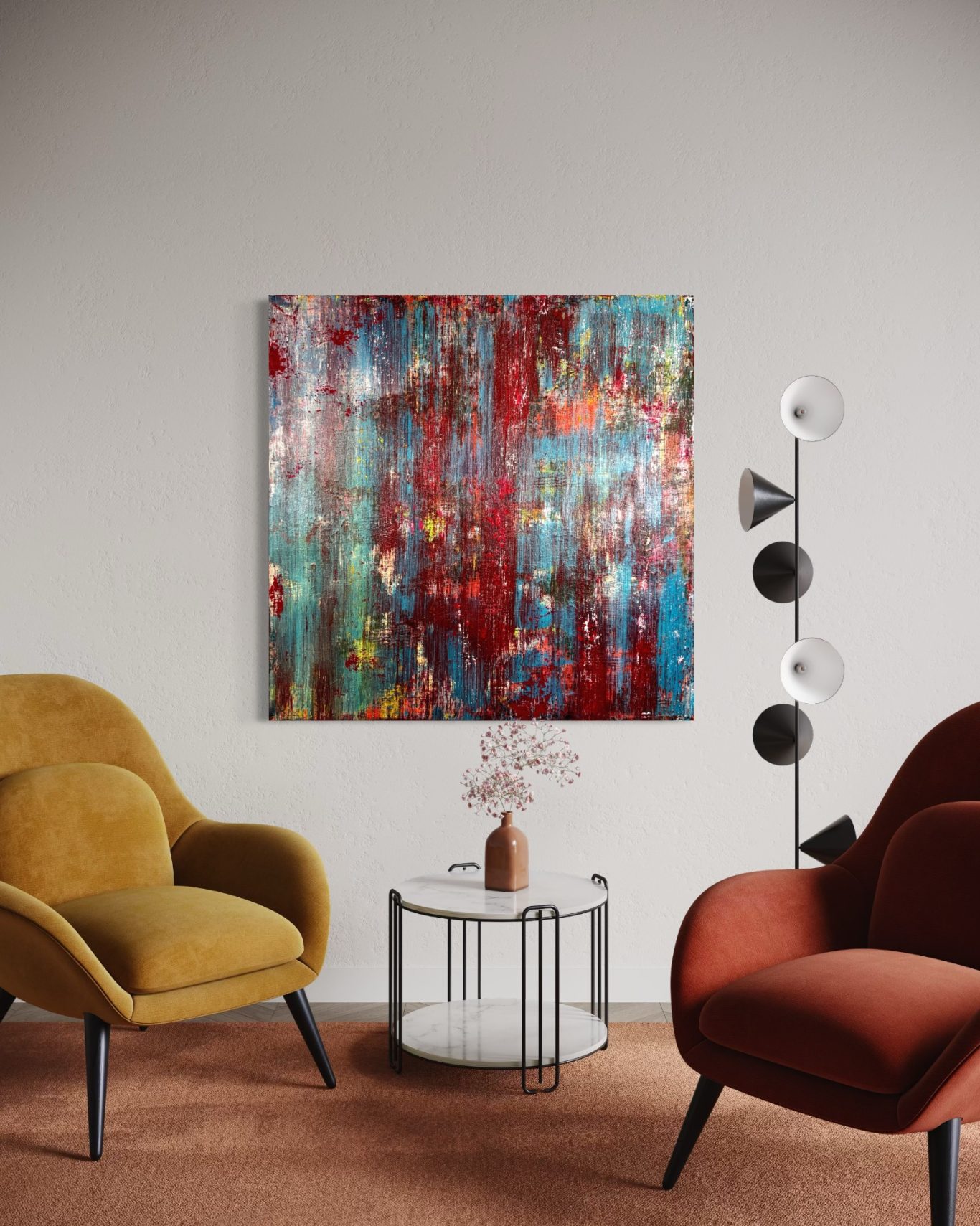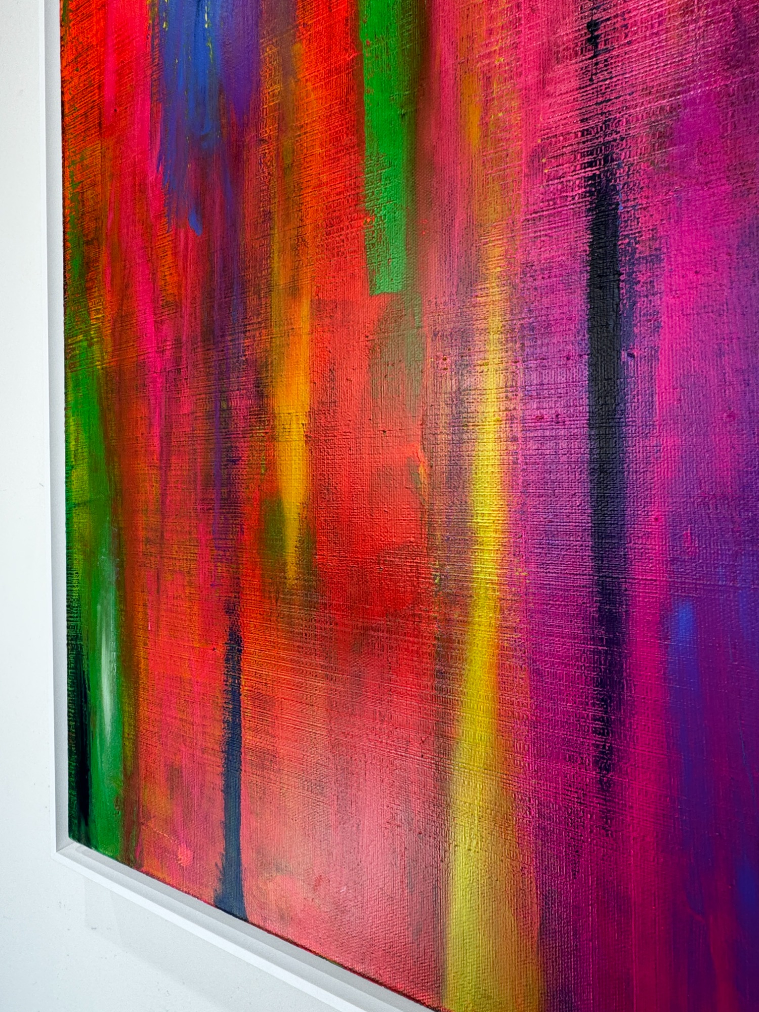 „Farbrauschen“ verdichtet leuchtende Schichten aus Magenta, Türkis, Gelb und Rot zu einem vibrierenden Farbspiel, das die Sinne umhüllt. Die mit dem Spachtel aufgetragene Struktur erzeugt eine lebendige Oberfläche, auf der Licht und Farbe in ständiger Bewegung zu sein scheinen – fast so, als würde die Leinwand selbst atmen.