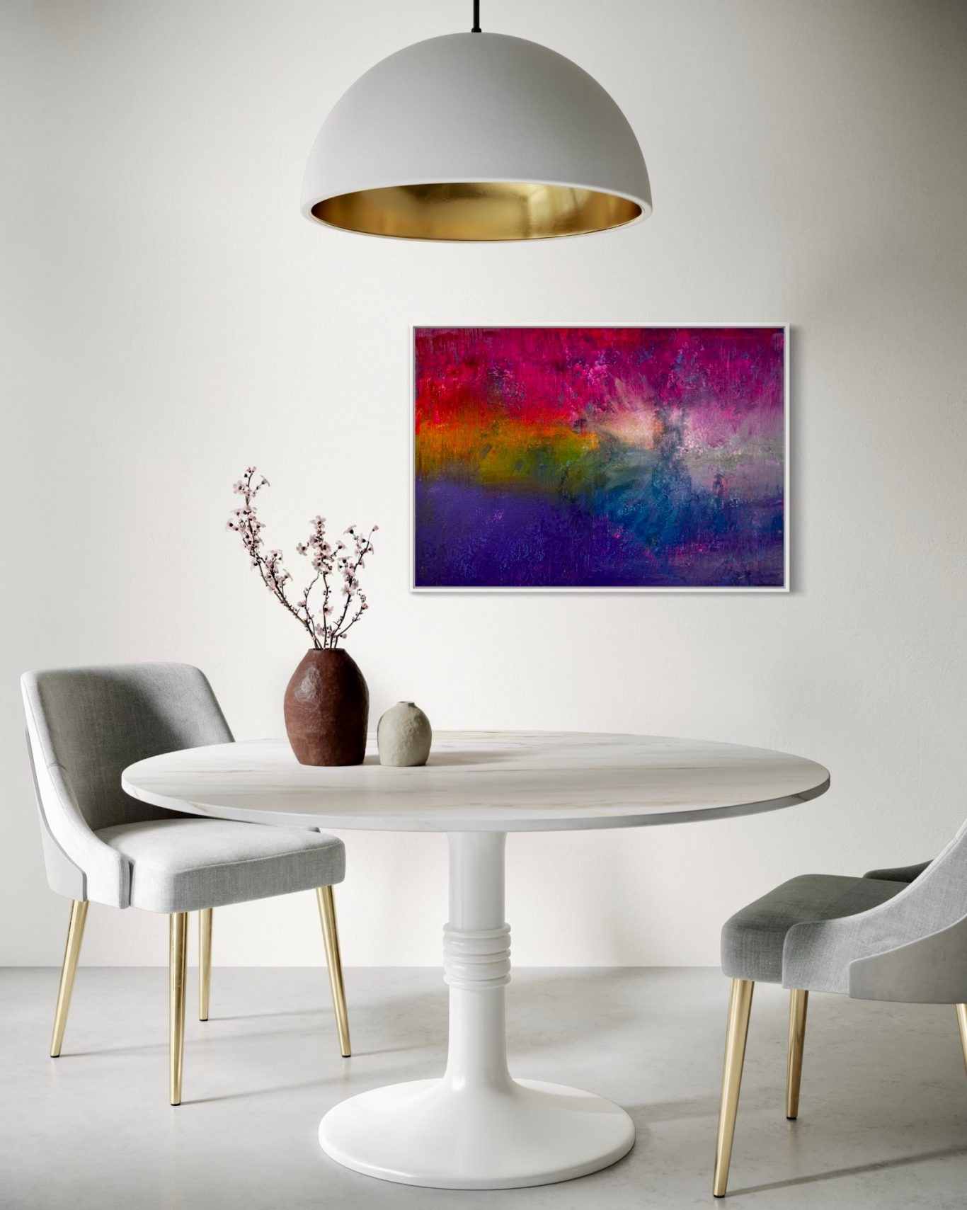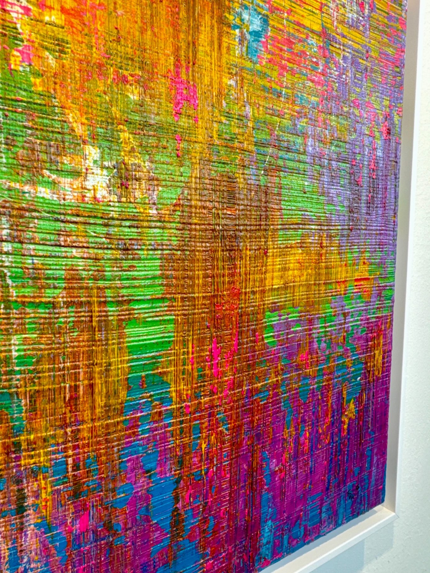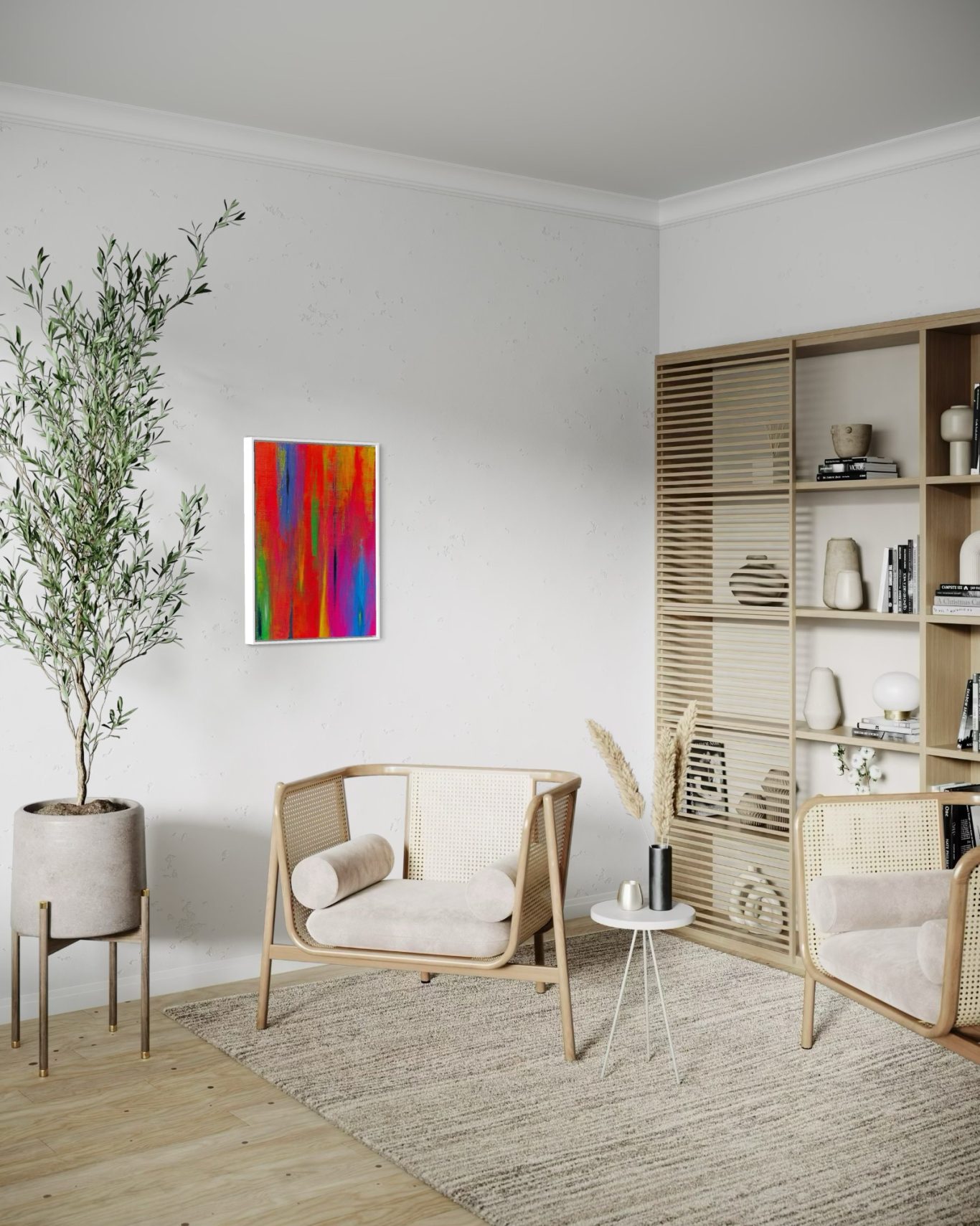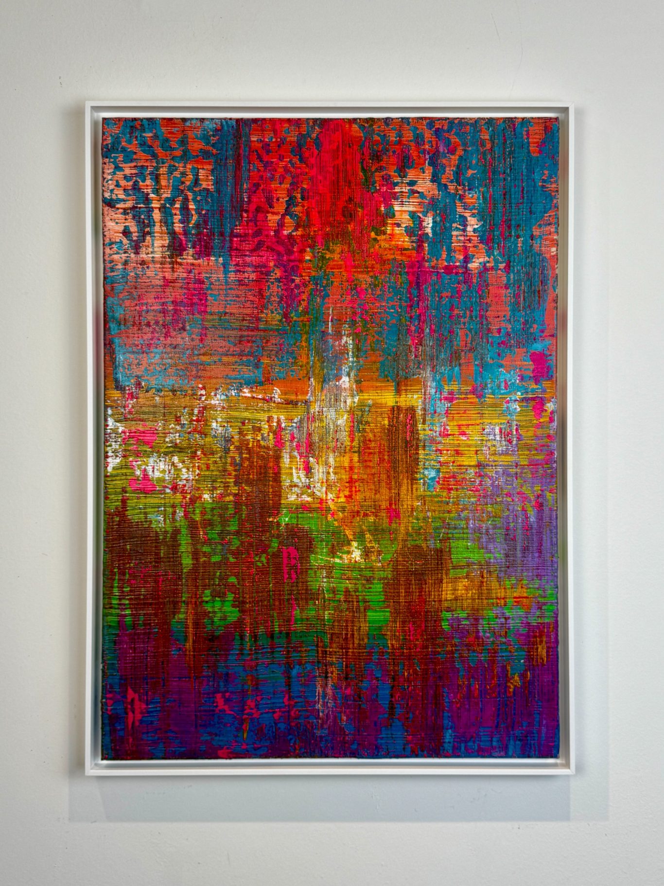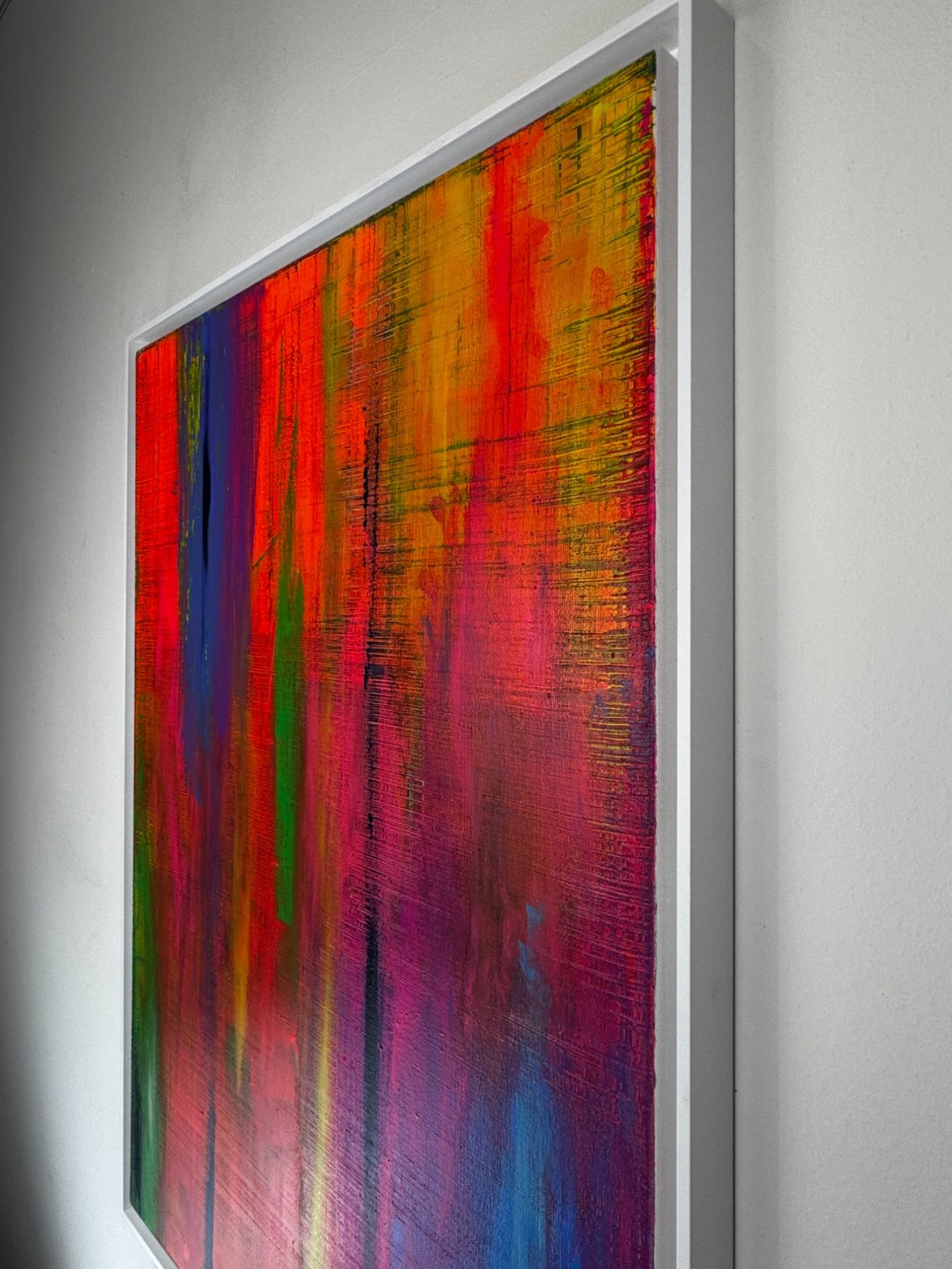 „Farbrauschen“ verdichtet leuchtende Schichten aus Magenta, Türkis, Gelb und Rot zu einem vibrierenden Farbspiel, das die Sinne umhüllt. Die mit dem Spachtel aufgetragene Struktur erzeugt eine lebendige Oberfläche, auf der Licht und Farbe in ständiger Bewegung zu sein scheinen – fast so, als würde die Leinwand selbst atmen.
