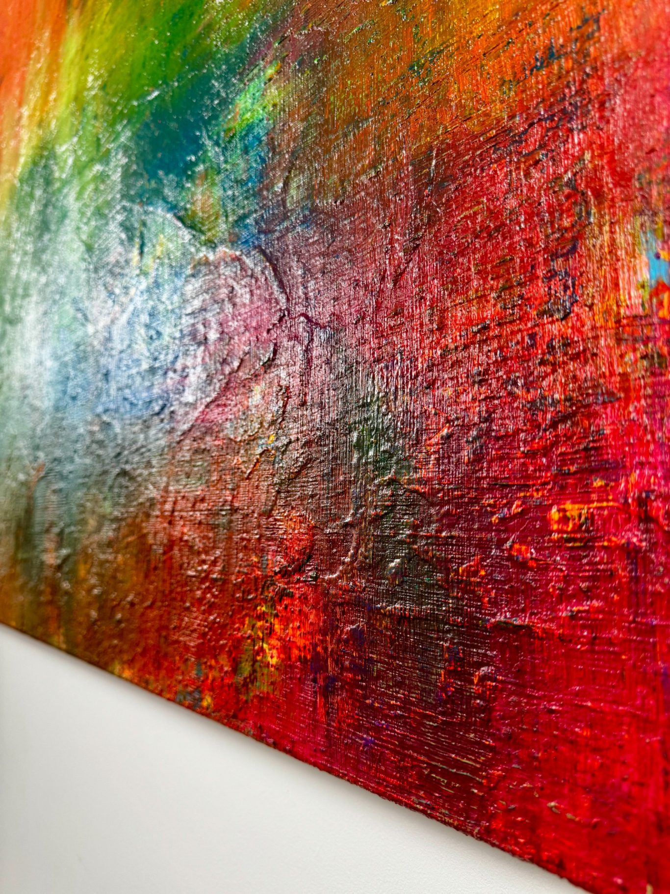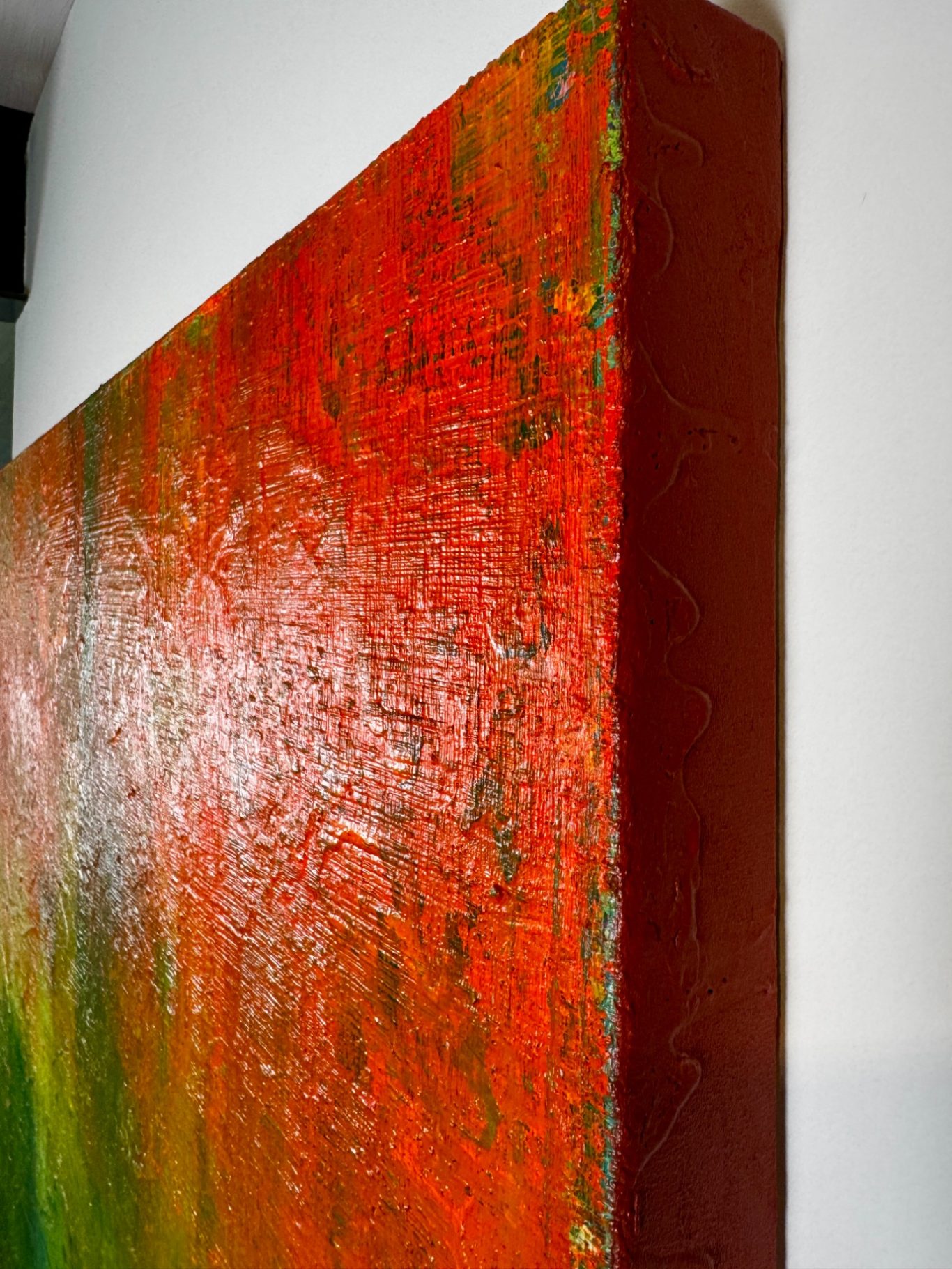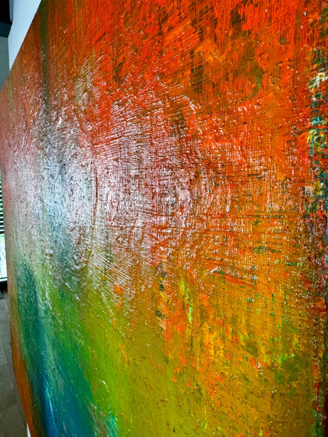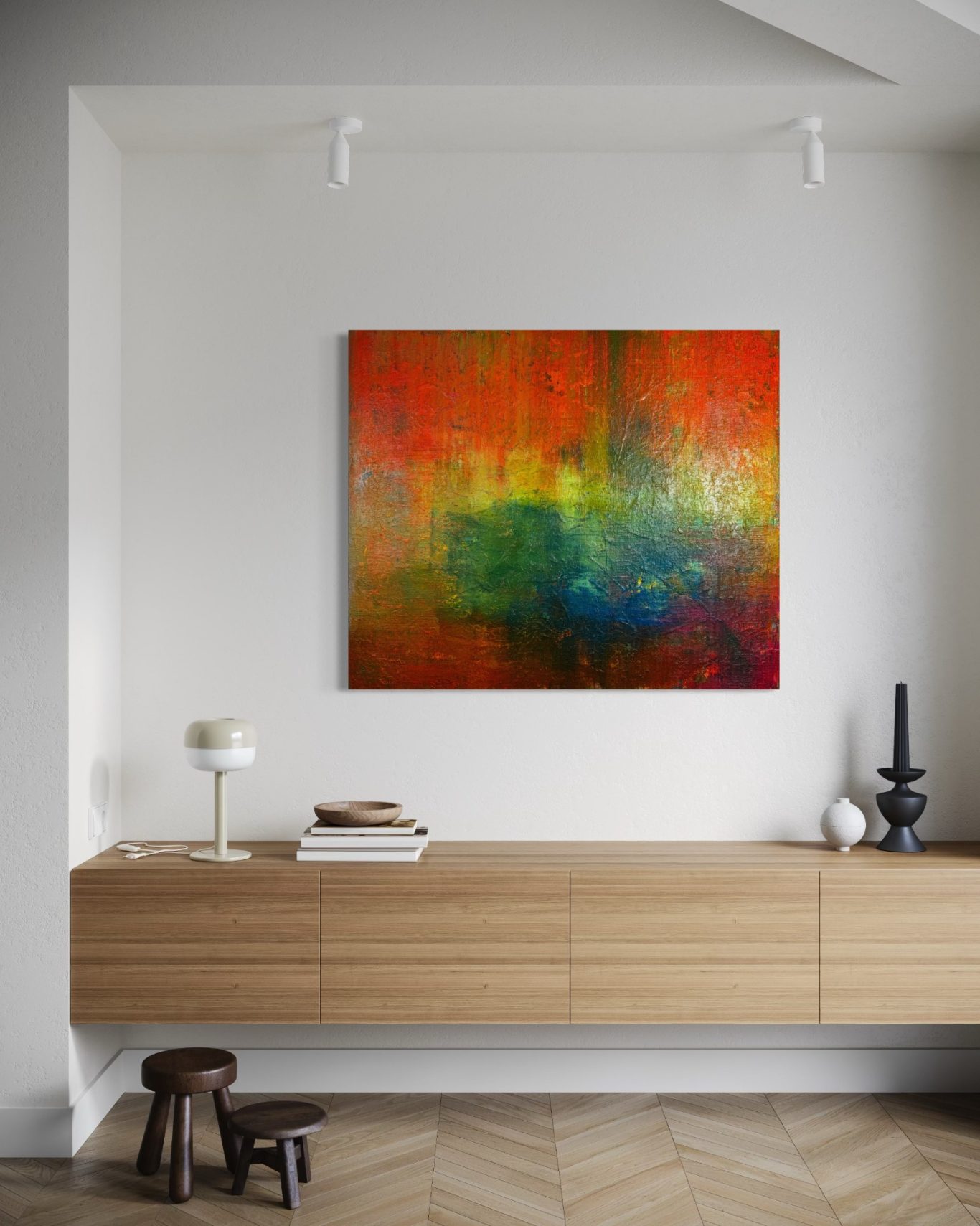 Warme Rottöne und leuchtendes Orange treffen auf kühle Blau- und Grünakzente. In dieser Farbverschmelzung entsteht eine Atmosphäre, die an ein loderndes Feuer erinnert – oder an die ersten Sonnenstrahlen, die nach einem langen Dunkel durchbrechen. Die vertikale Bewegung der Farben zieht den Blick nach oben – hin zum Licht, zur Hoffnung.