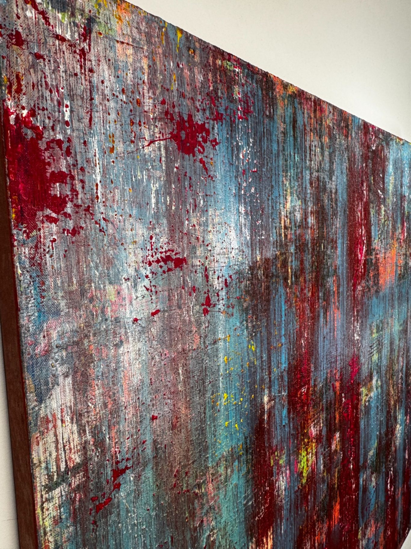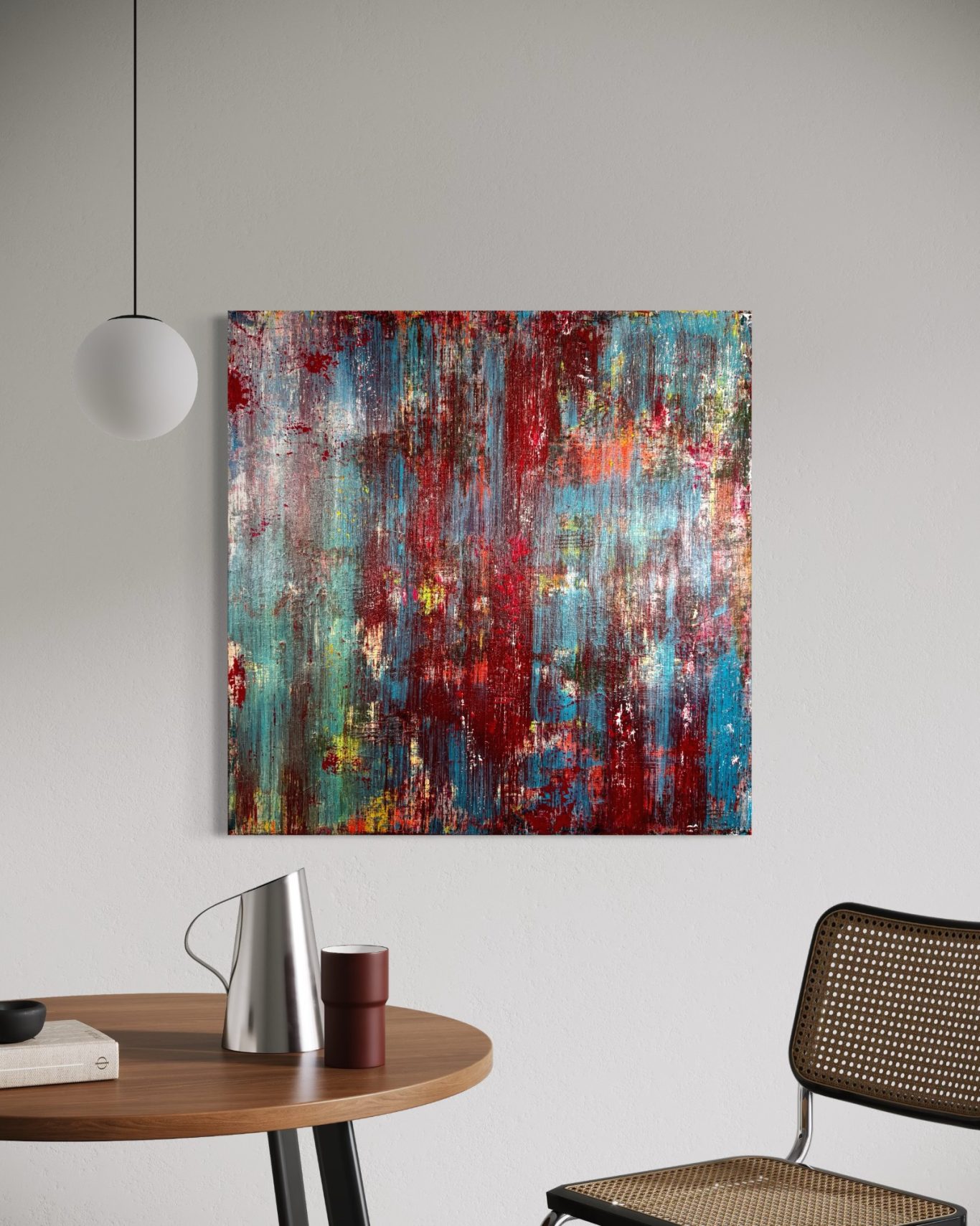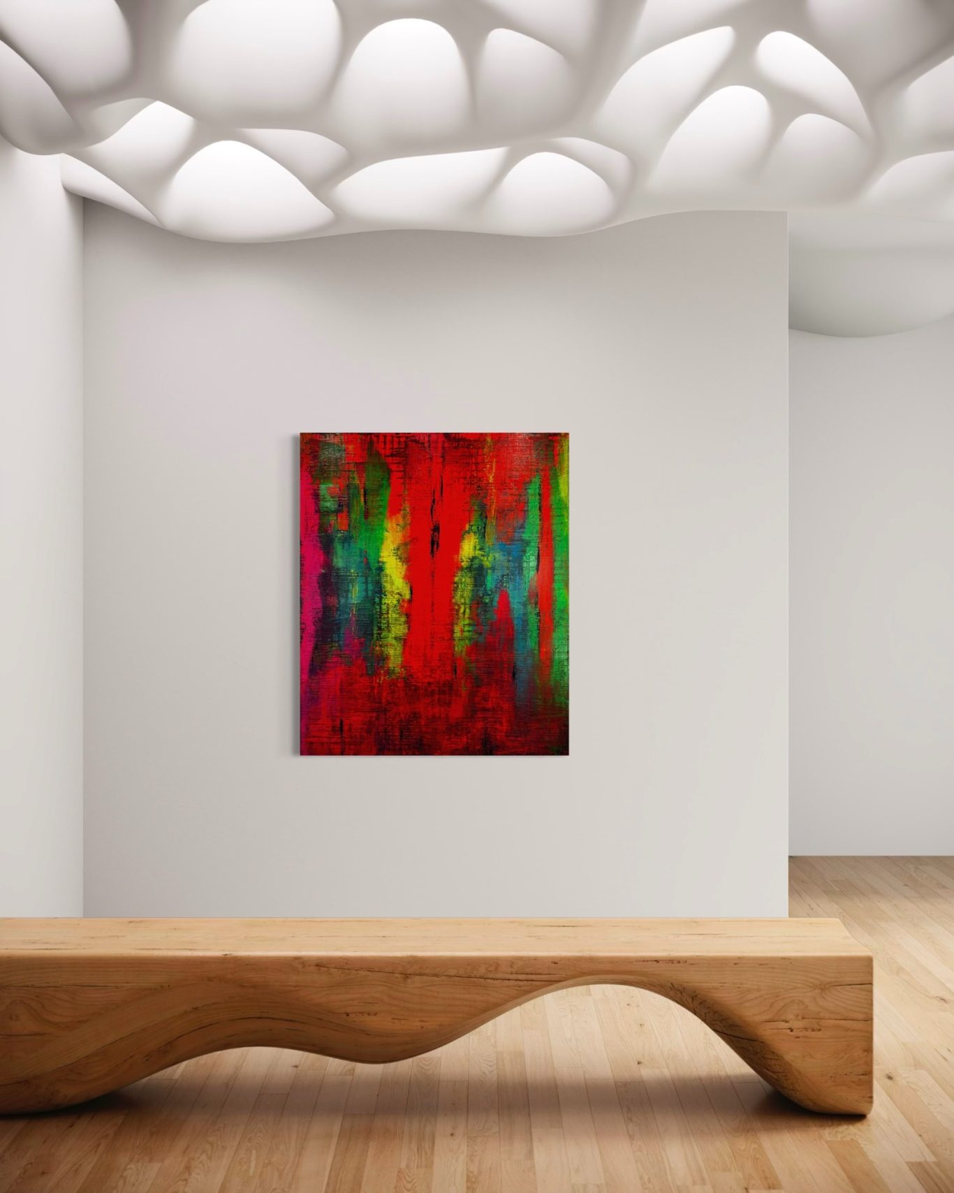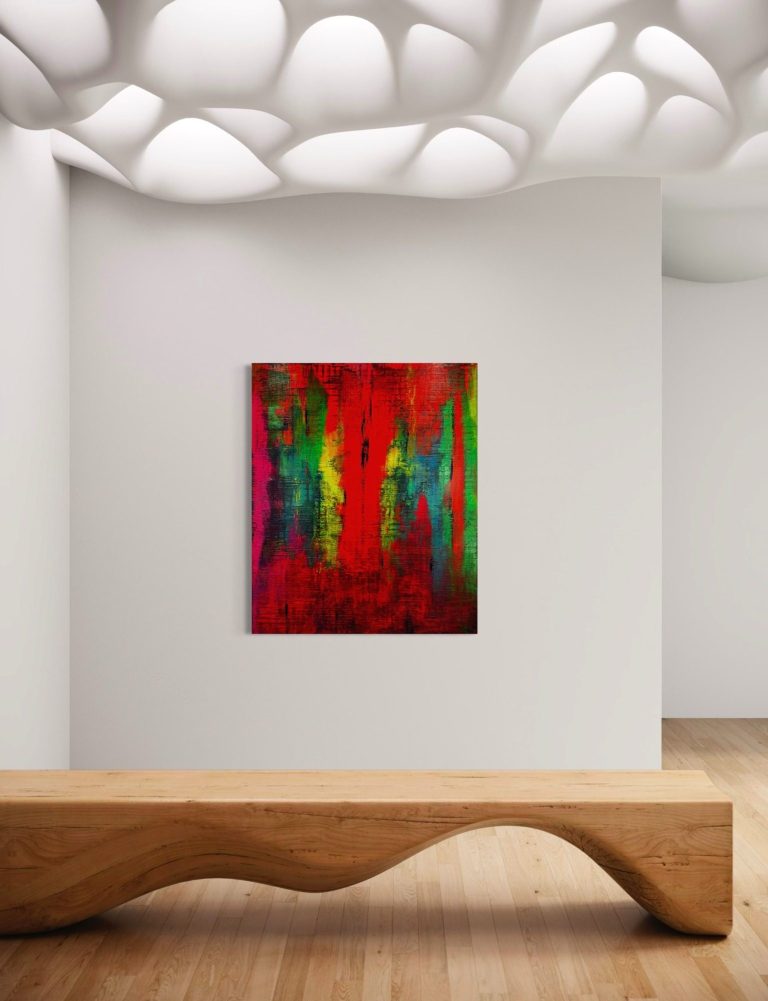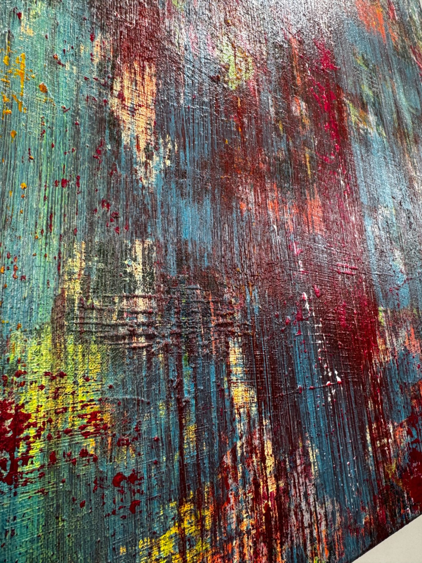 Warme Rottöne und leuchtendes Orange treffen auf kühle Blau- und Grünakzente. In dieser Farbverschmelzung entsteht eine Atmosphäre, die an ein loderndes Feuer erinnert – oder an die ersten Sonnenstrahlen, die nach einem langen Dunkel durchbrechen. Die vertikale Bewegung der Farben zieht den Blick nach oben – hin zum Licht, zur Hoffnung.