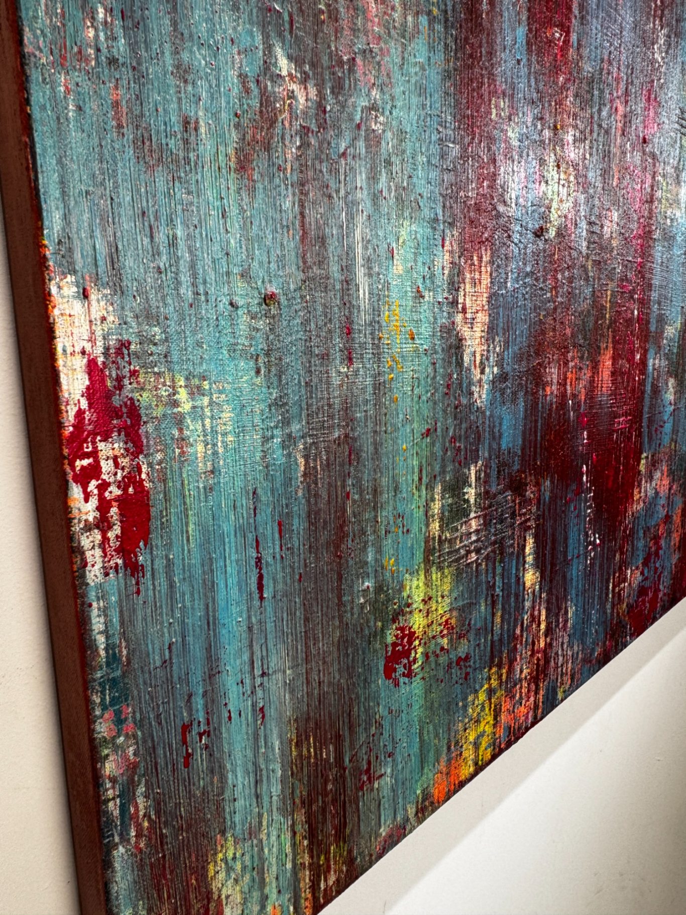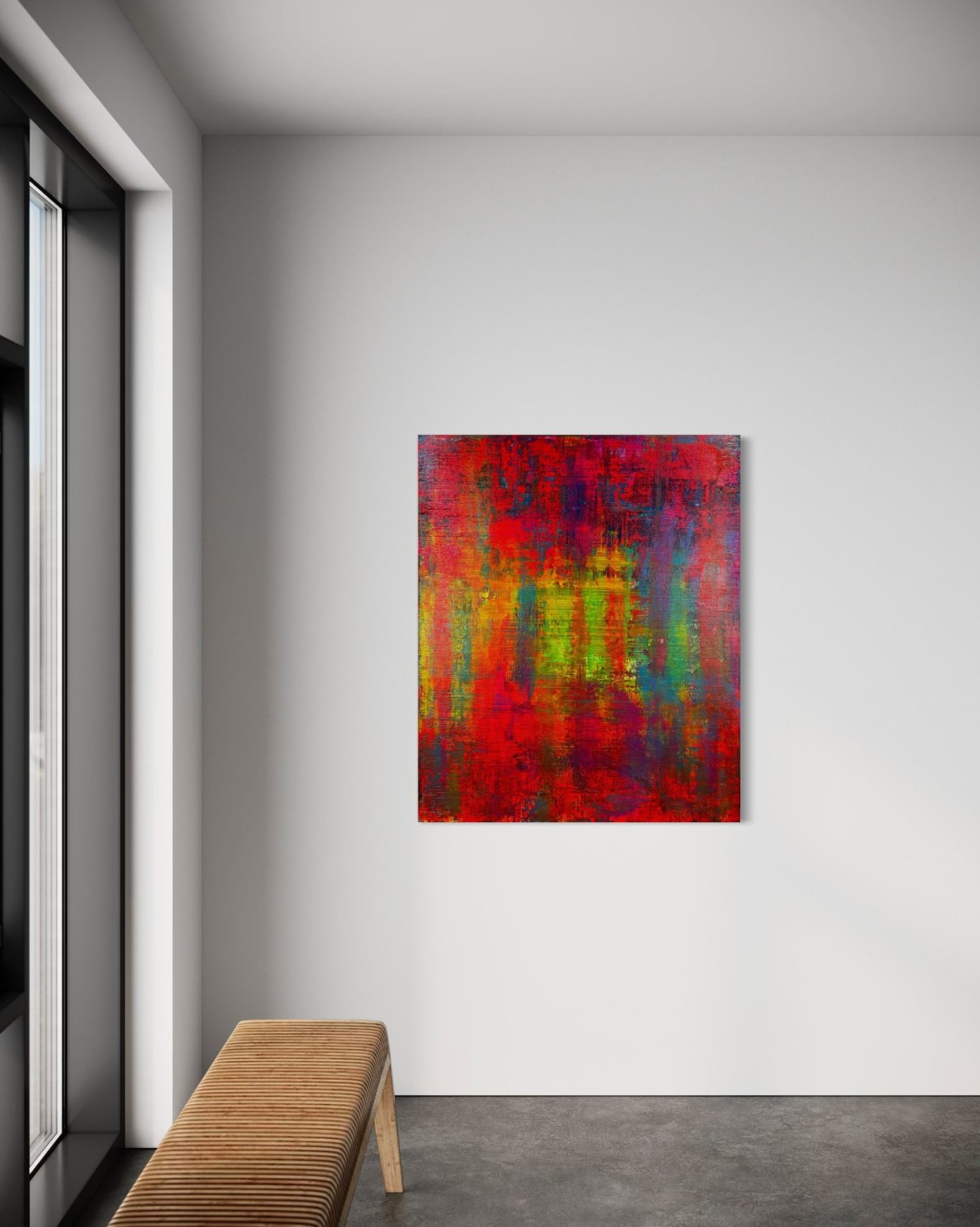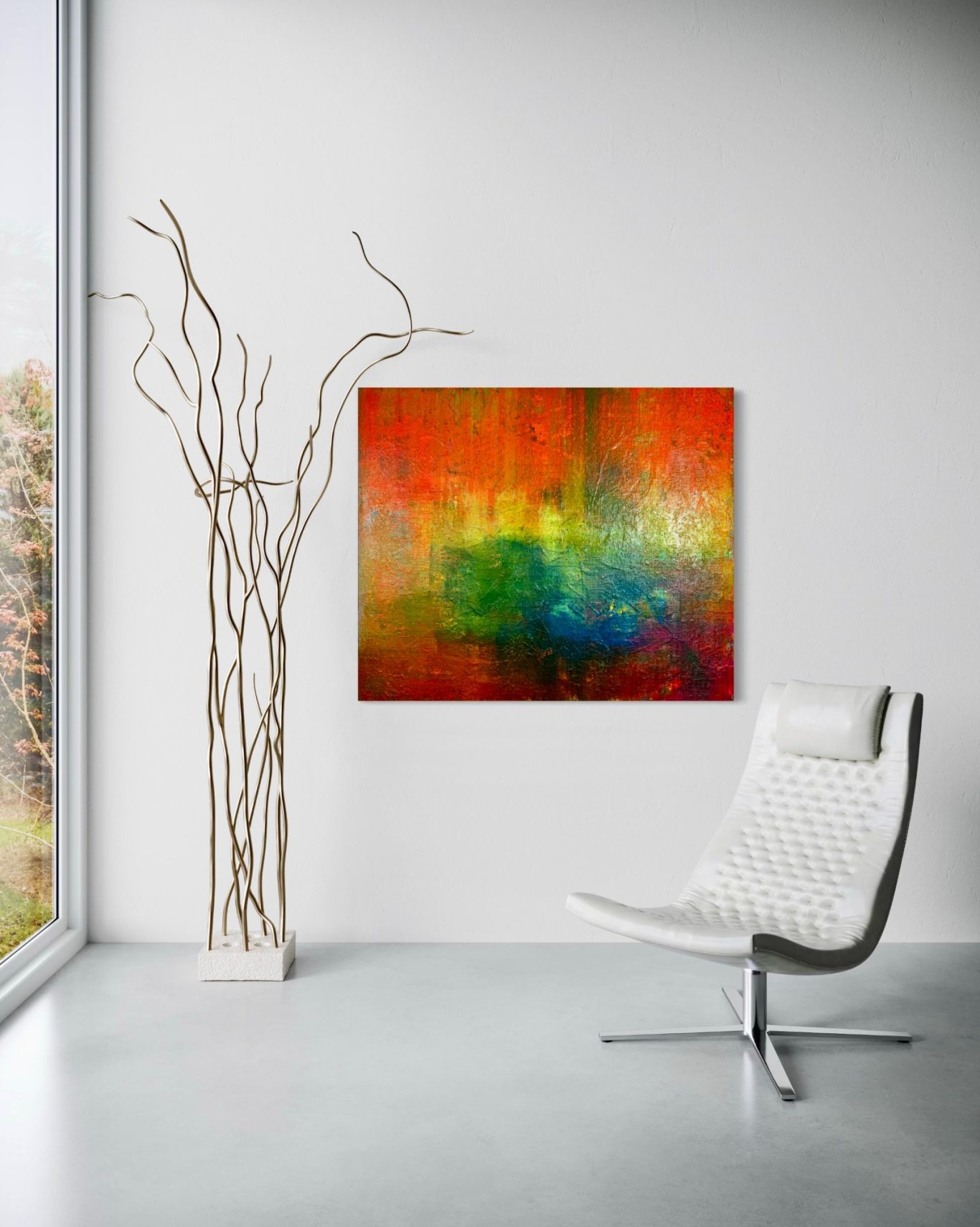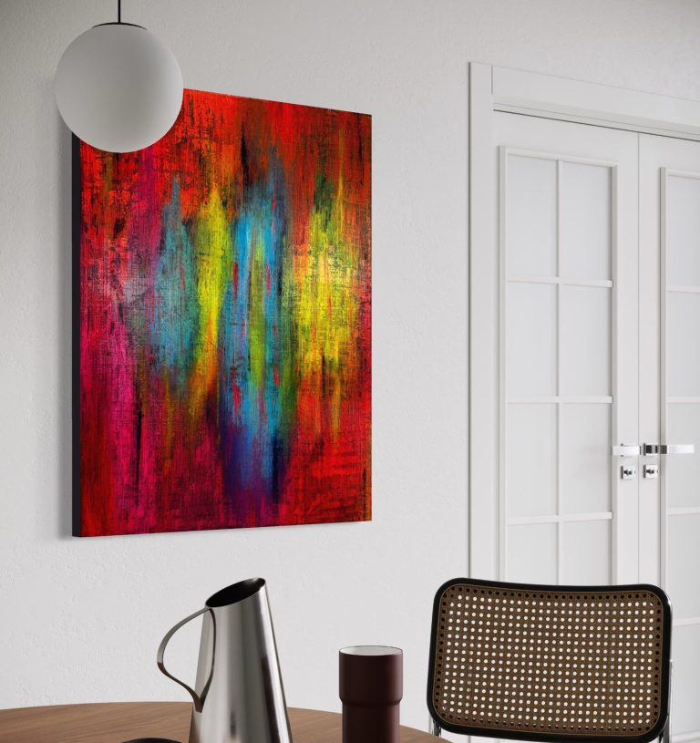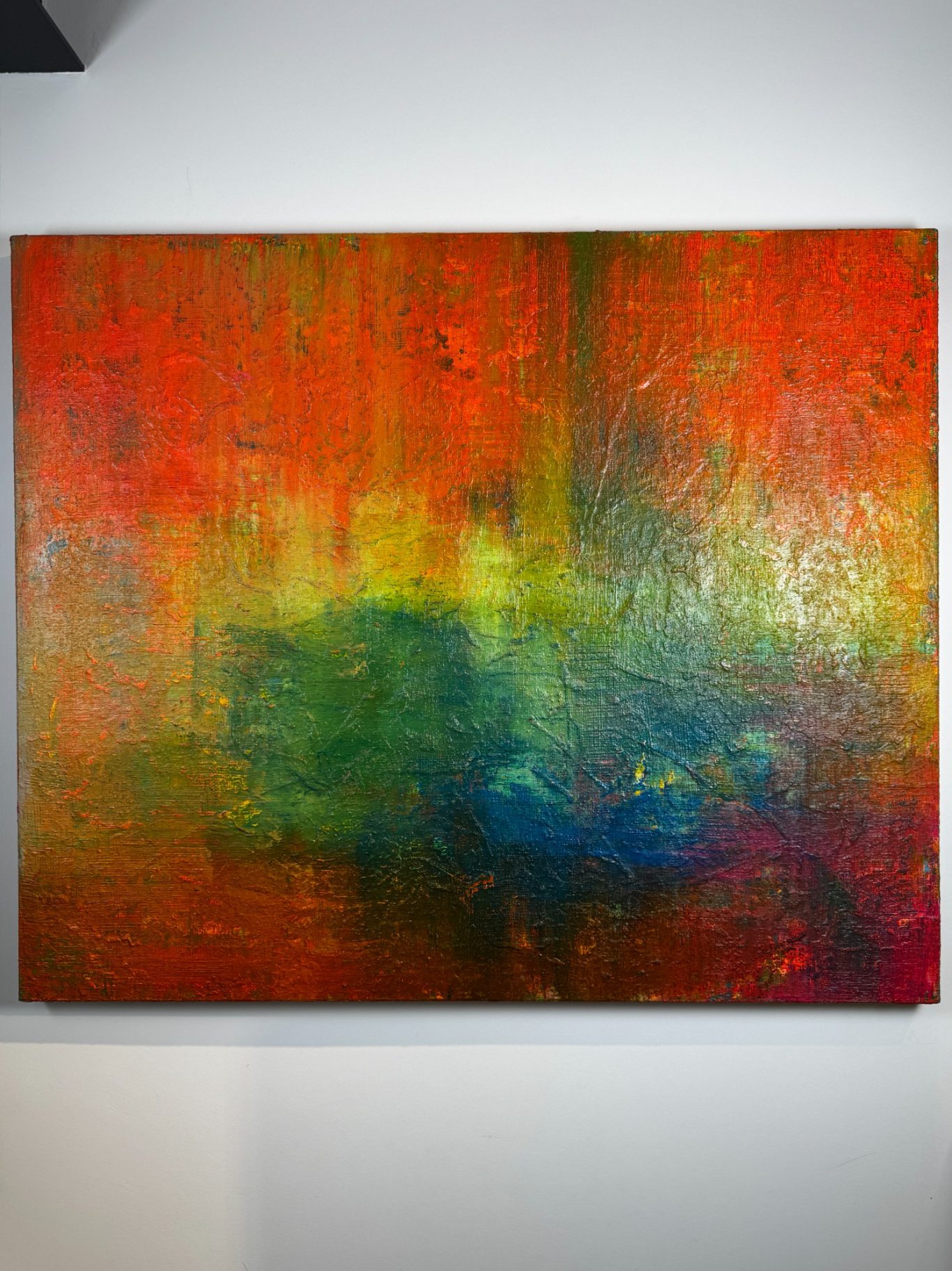 Warme Rottöne und leuchtendes Orange treffen auf kühle Blau- und Grünakzente. In dieser Farbverschmelzung entsteht eine Atmosphäre, die an ein loderndes Feuer erinnert – oder an die ersten Sonnenstrahlen, die nach einem langen Dunkel durchbrechen. Die vertikale Bewegung der Farben zieht den Blick nach oben – hin zum Licht, zur Hoffnung.