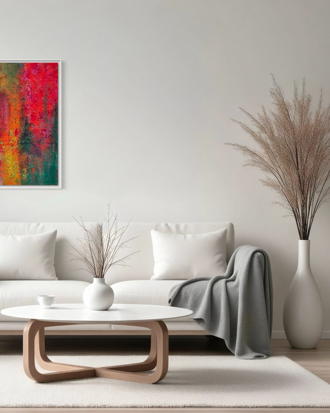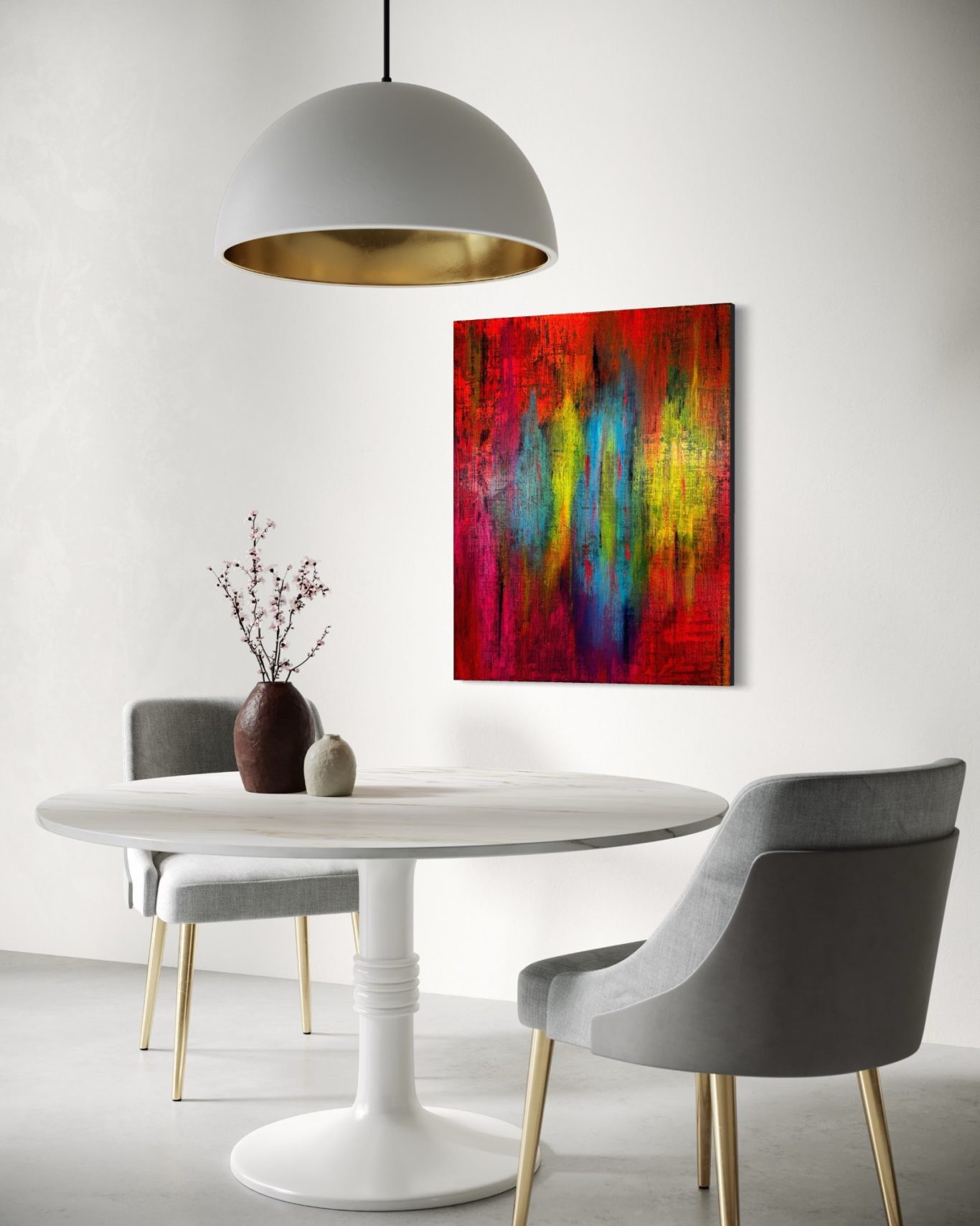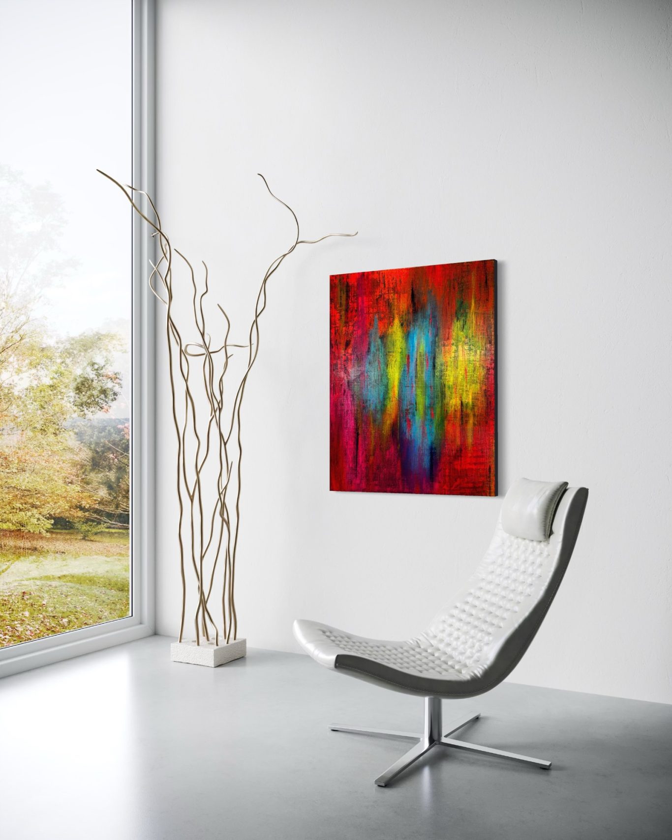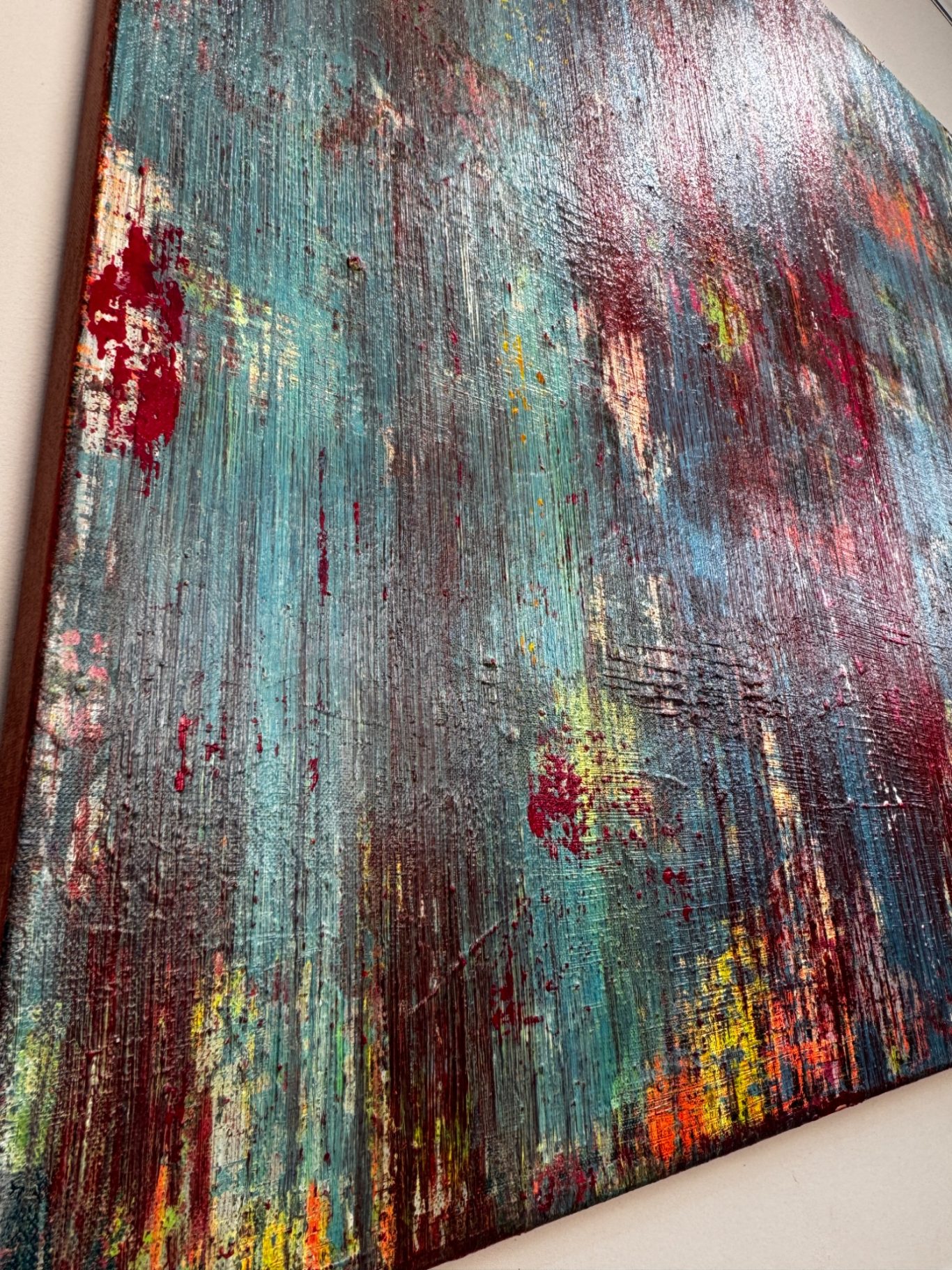 Warme Rottöne und leuchtendes Orange treffen auf kühle Blau- und Grünakzente. In dieser Farbverschmelzung entsteht eine Atmosphäre, die an ein loderndes Feuer erinnert – oder an die ersten Sonnenstrahlen, die nach einem langen Dunkel durchbrechen. Die vertikale Bewegung der Farben zieht den Blick nach oben – hin zum Licht, zur Hoffnung.