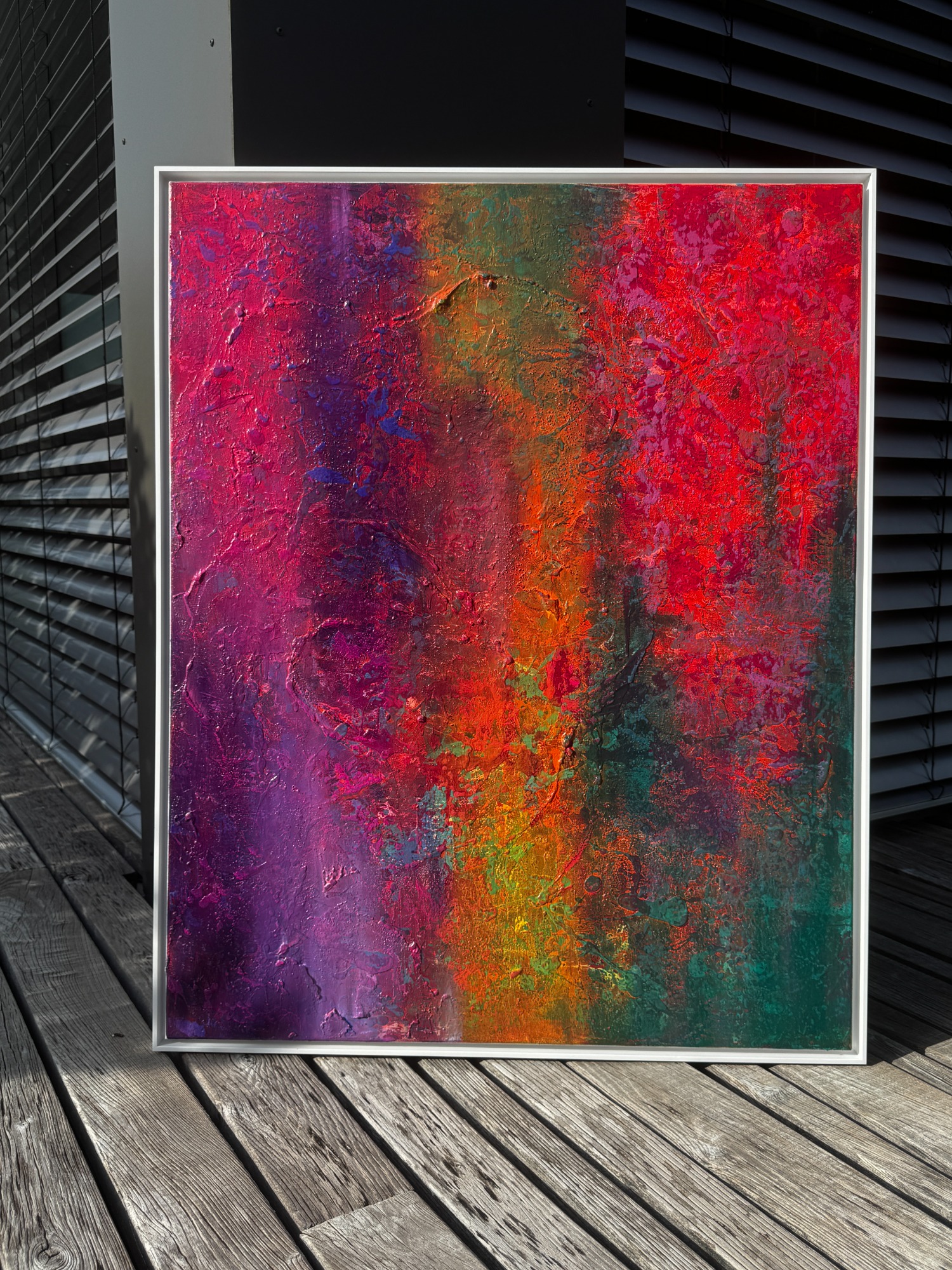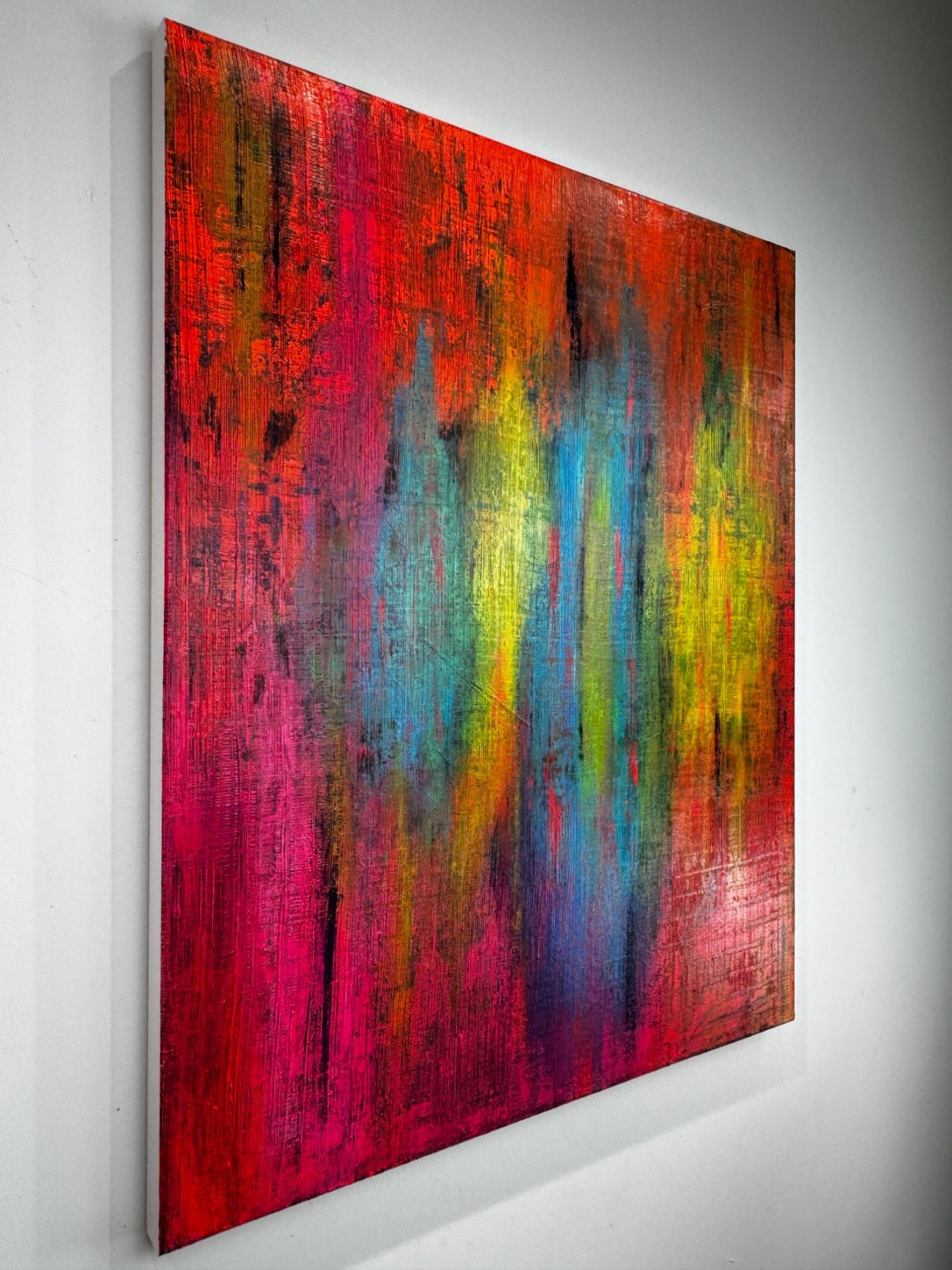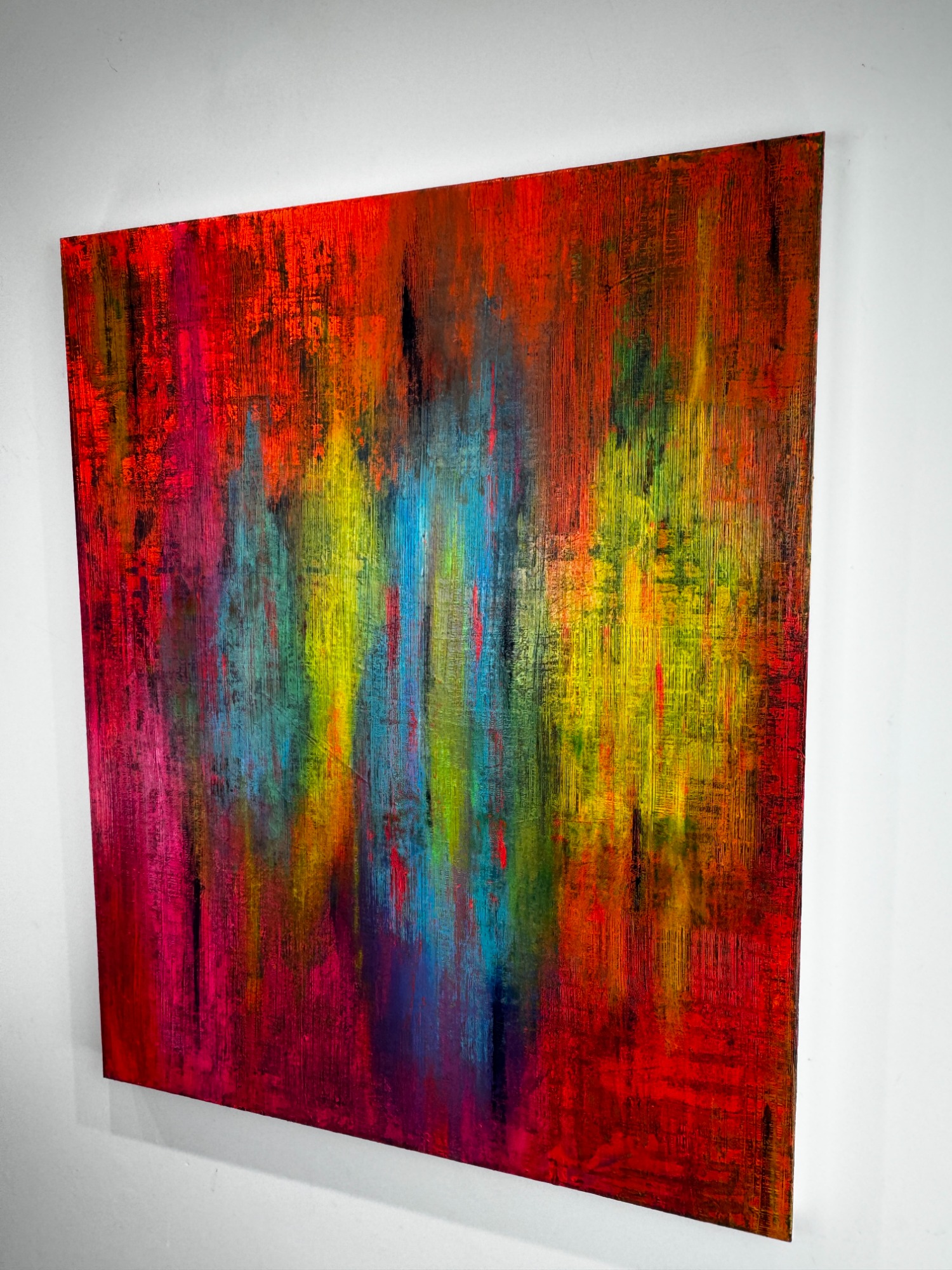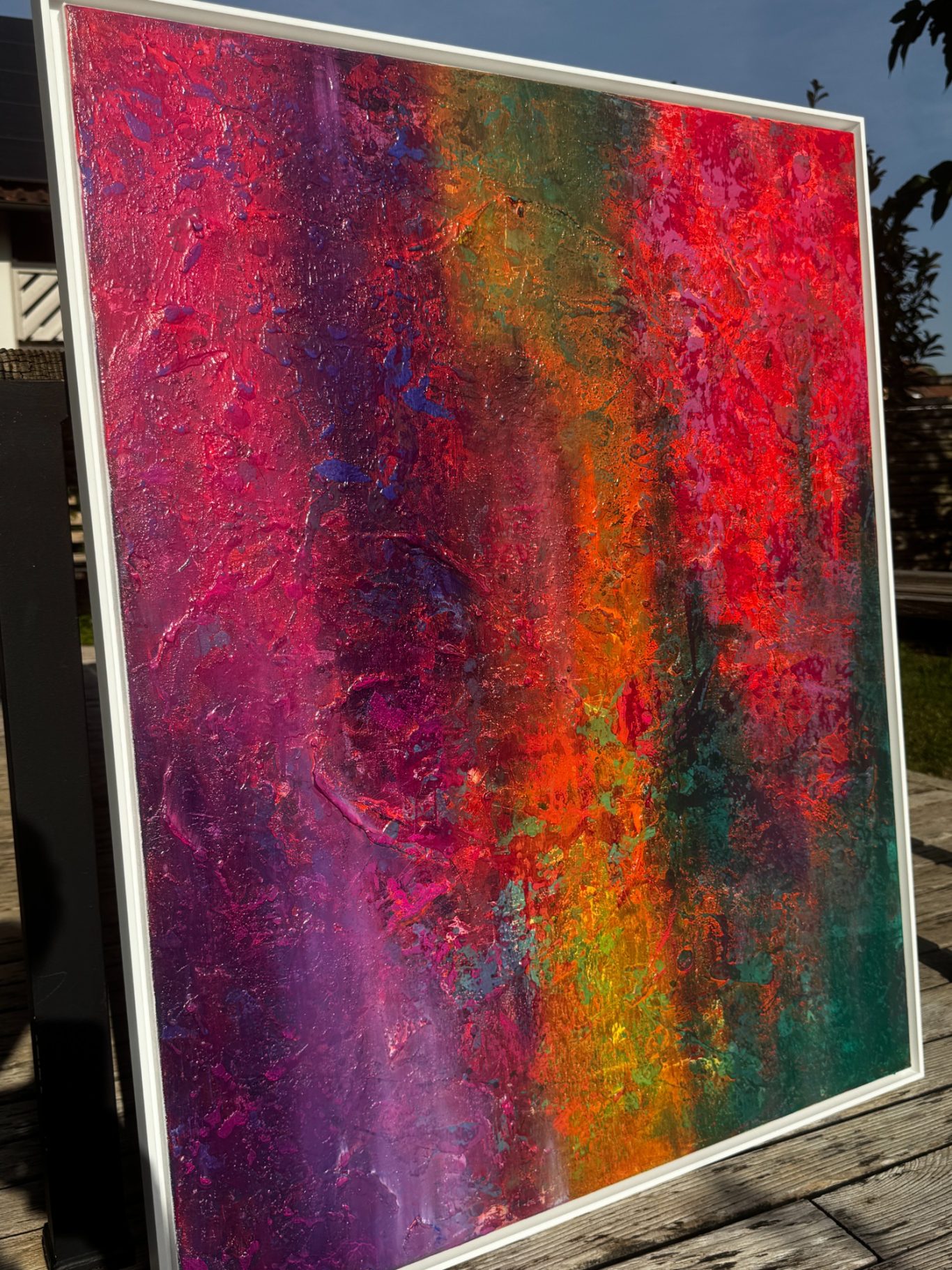 „Feuerweg“ ist leuchtend, intensiv und voller Bewegung. Das Werk zieht den Betrachter in einen farbigen Strom aus glühendem Rot, kräftigem Pink und warmem Orange, durchzogen von grünen und blauen Akzenten. Vertikale Bahnen lassen eine Aufwärtsbewegung entstehen, als würde sich ein energetischer Weg öffnen, der den Blick und die Gedanken nach oben führt.