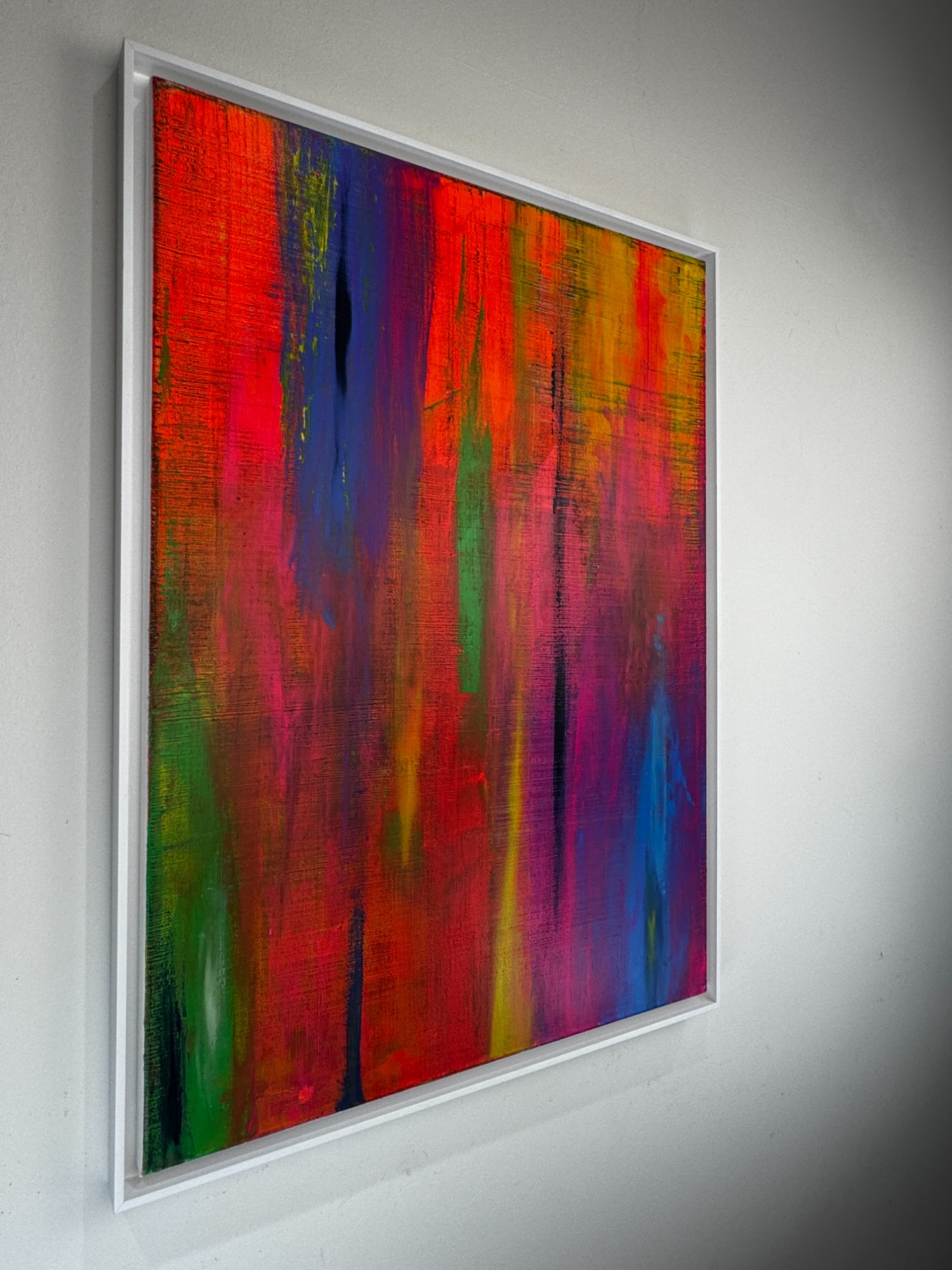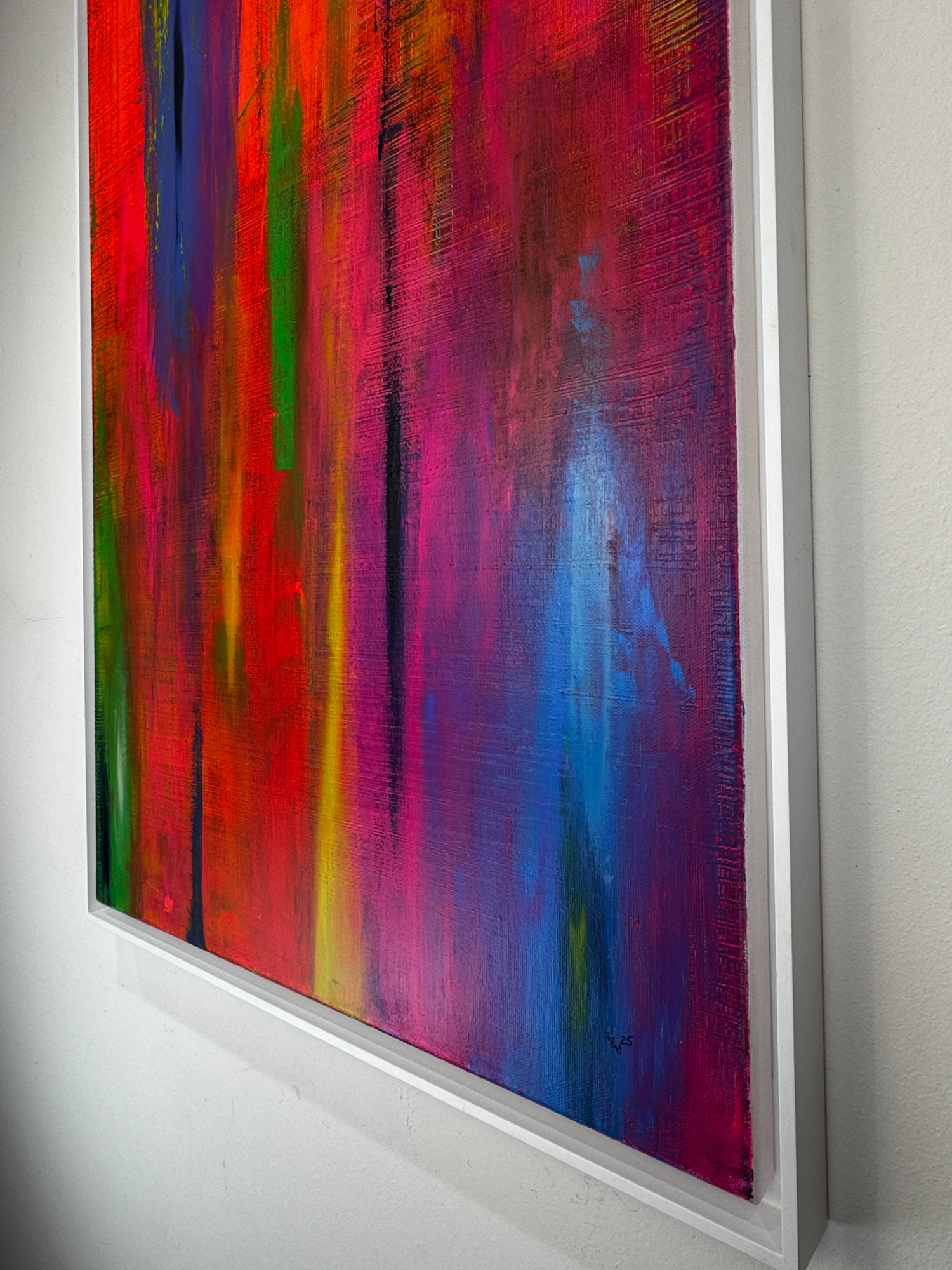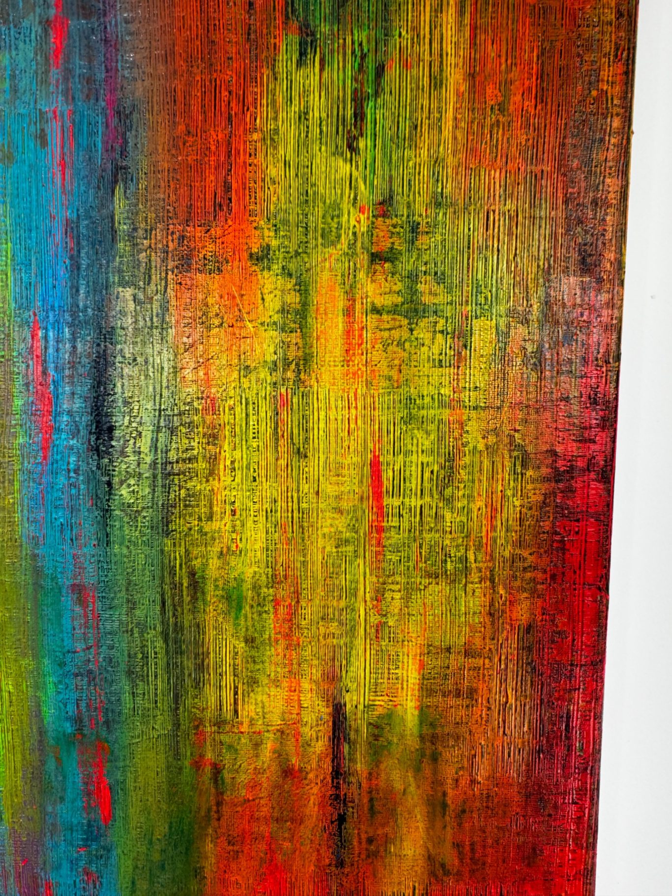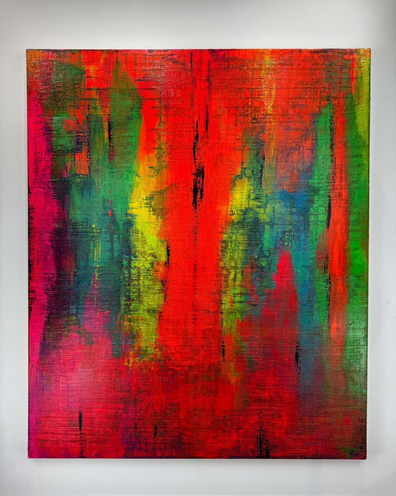 „Feuerweg“ ist leuchtend, intensiv und voller Bewegung. Das Werk zieht den Betrachter in einen farbigen Strom aus glühendem Rot, kräftigem Pink und warmem Orange, durchzogen von grünen und blauen Akzenten. Vertikale Bahnen lassen eine Aufwärtsbewegung entstehen, als würde sich ein energetischer Weg öffnen, der den Blick und die Gedanken nach oben führt.