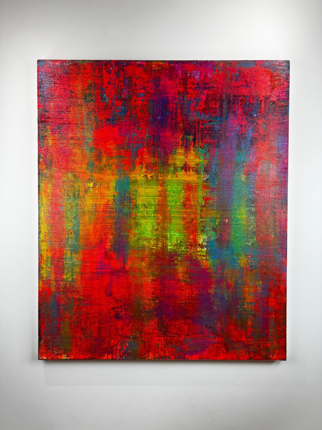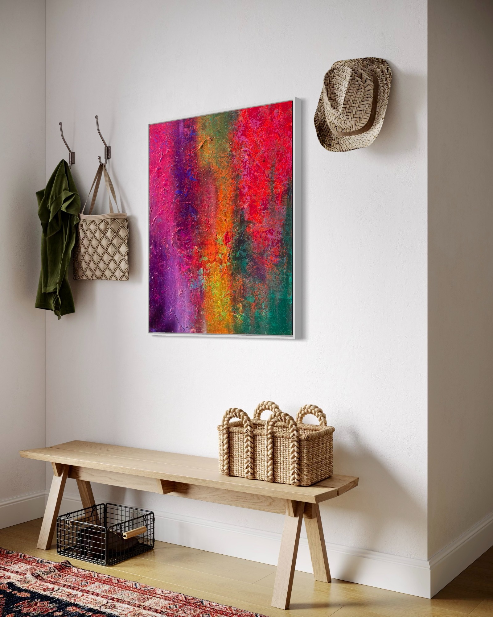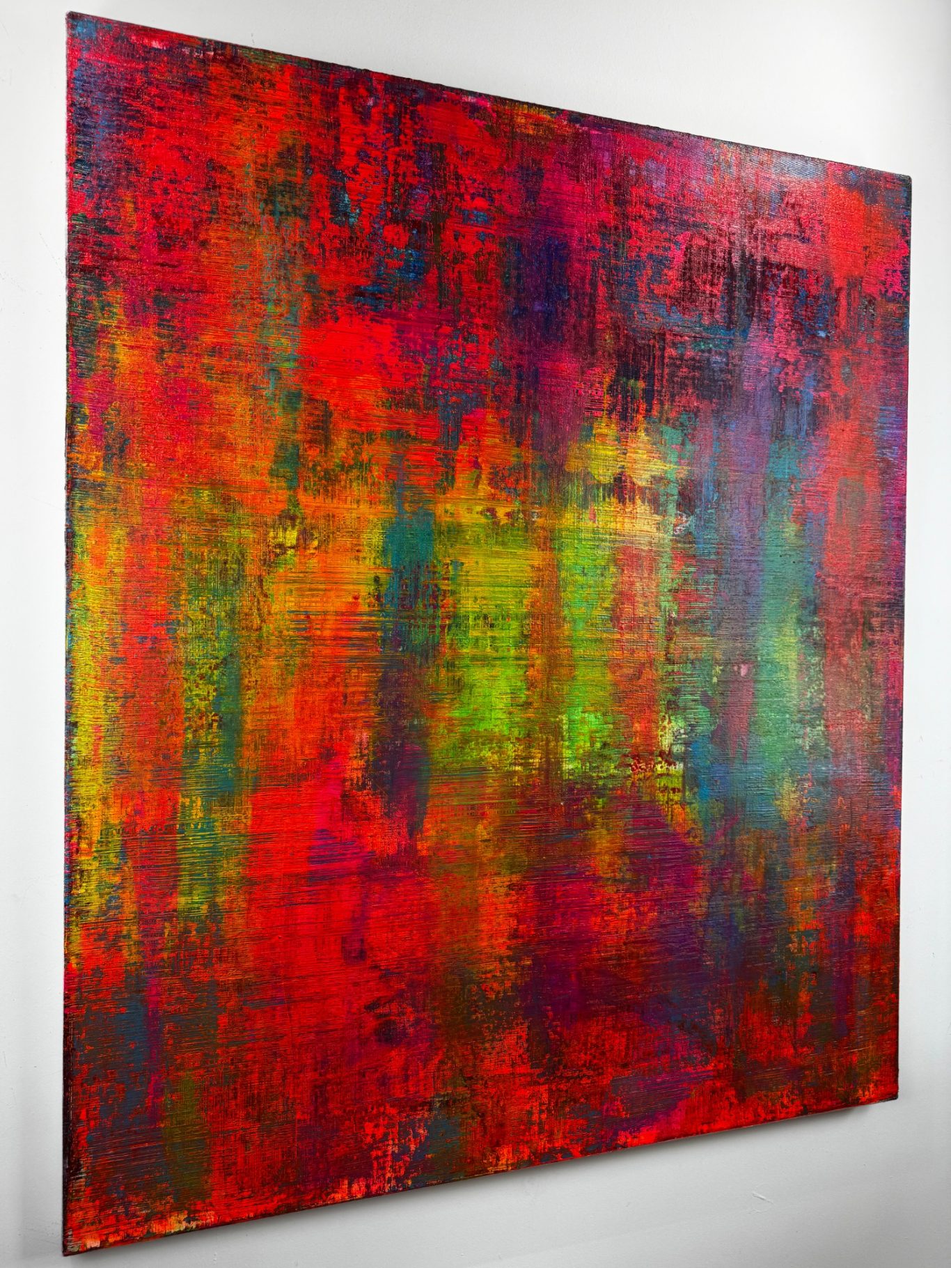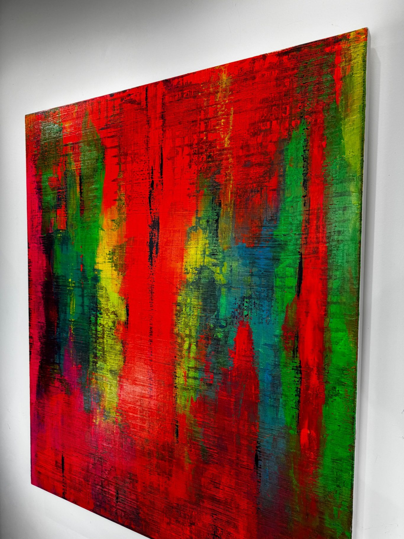 „Feuerweg“ ist leuchtend, intensiv und voller Bewegung. Das Werk zieht den Betrachter in einen farbigen Strom aus glühendem Rot, kräftigem Pink und warmem Orange, durchzogen von grünen und blauen Akzenten. Vertikale Bahnen lassen eine Aufwärtsbewegung entstehen, als würde sich ein energetischer Weg öffnen, der den Blick und die Gedanken nach oben führt.