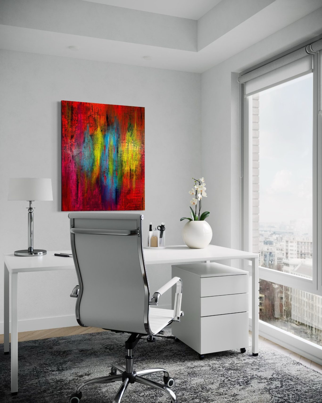 „Aurora Inferno“ entfaltet auf der Leinwand ein kraftvolles Farbfeuerwerk, das zwischen glühender Hitze und schimmerndem Licht tanzt. Leuchtendes Rot, sattes Orange und strahlendes Gelb verschmelzen mit tiefem Violett und kühlem Türkis zu einem intensiven Farbrausch, der den Blick unweigerlich fesselt.