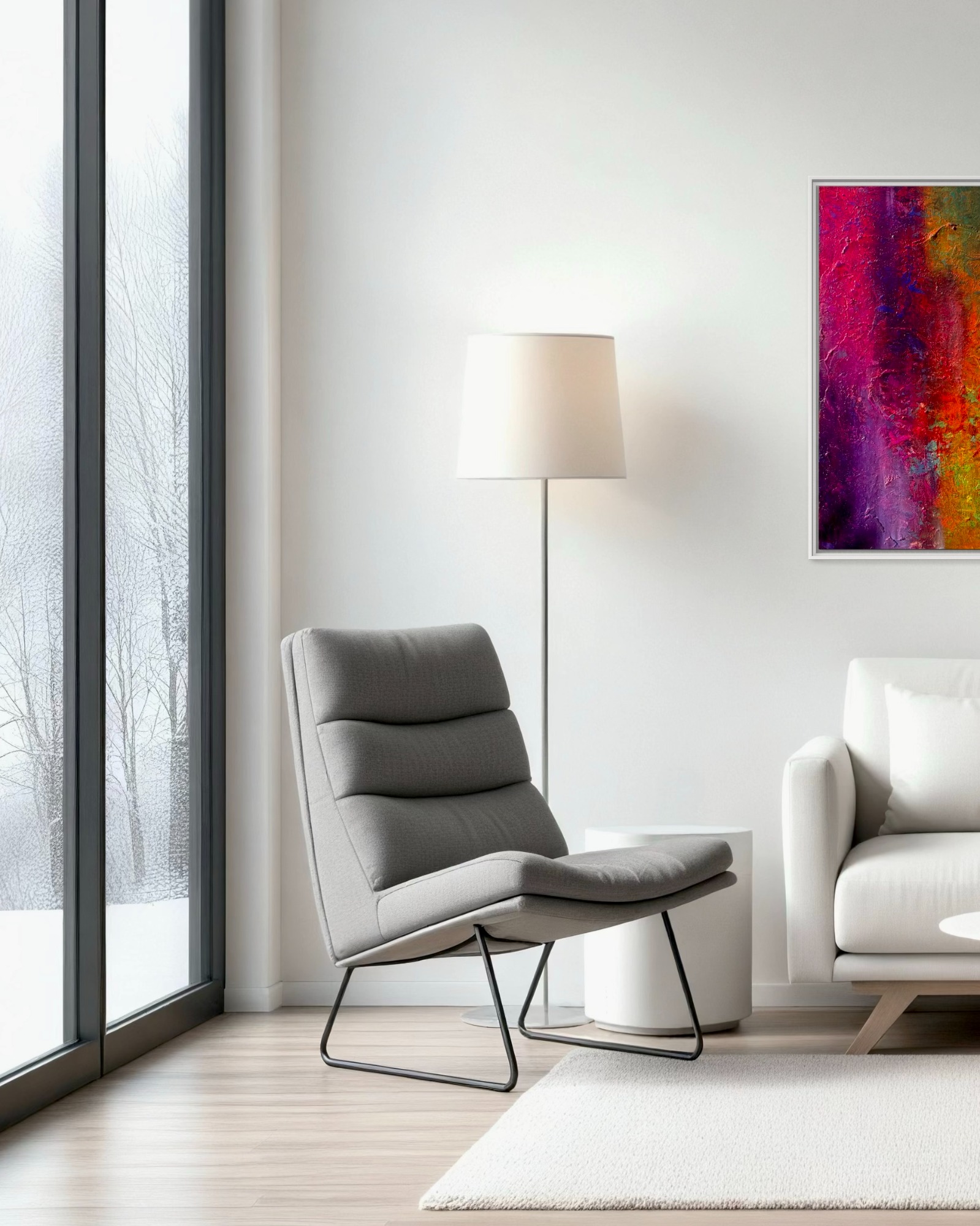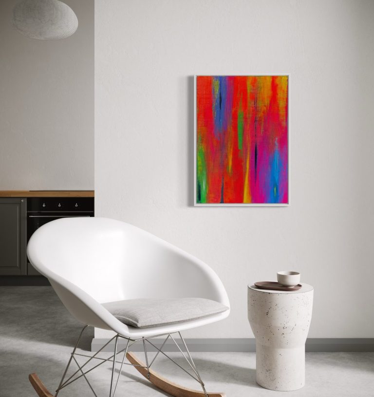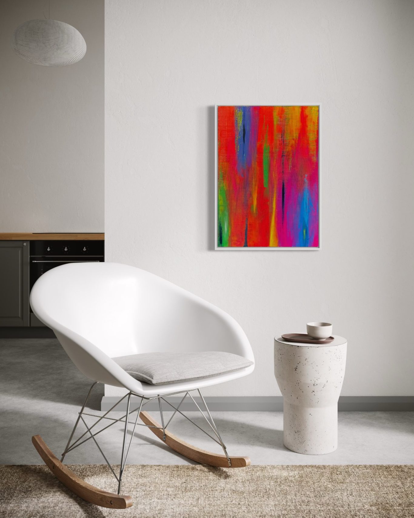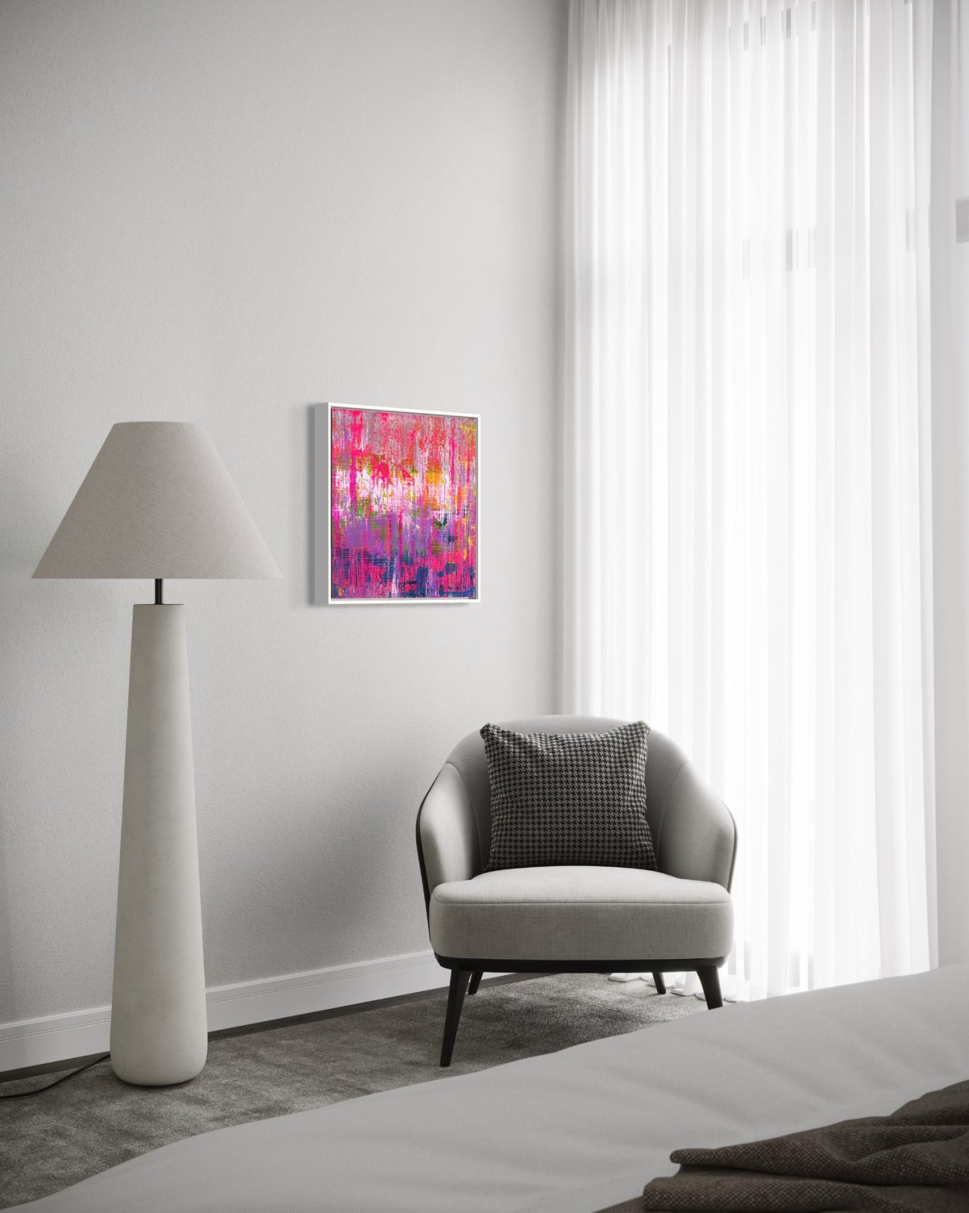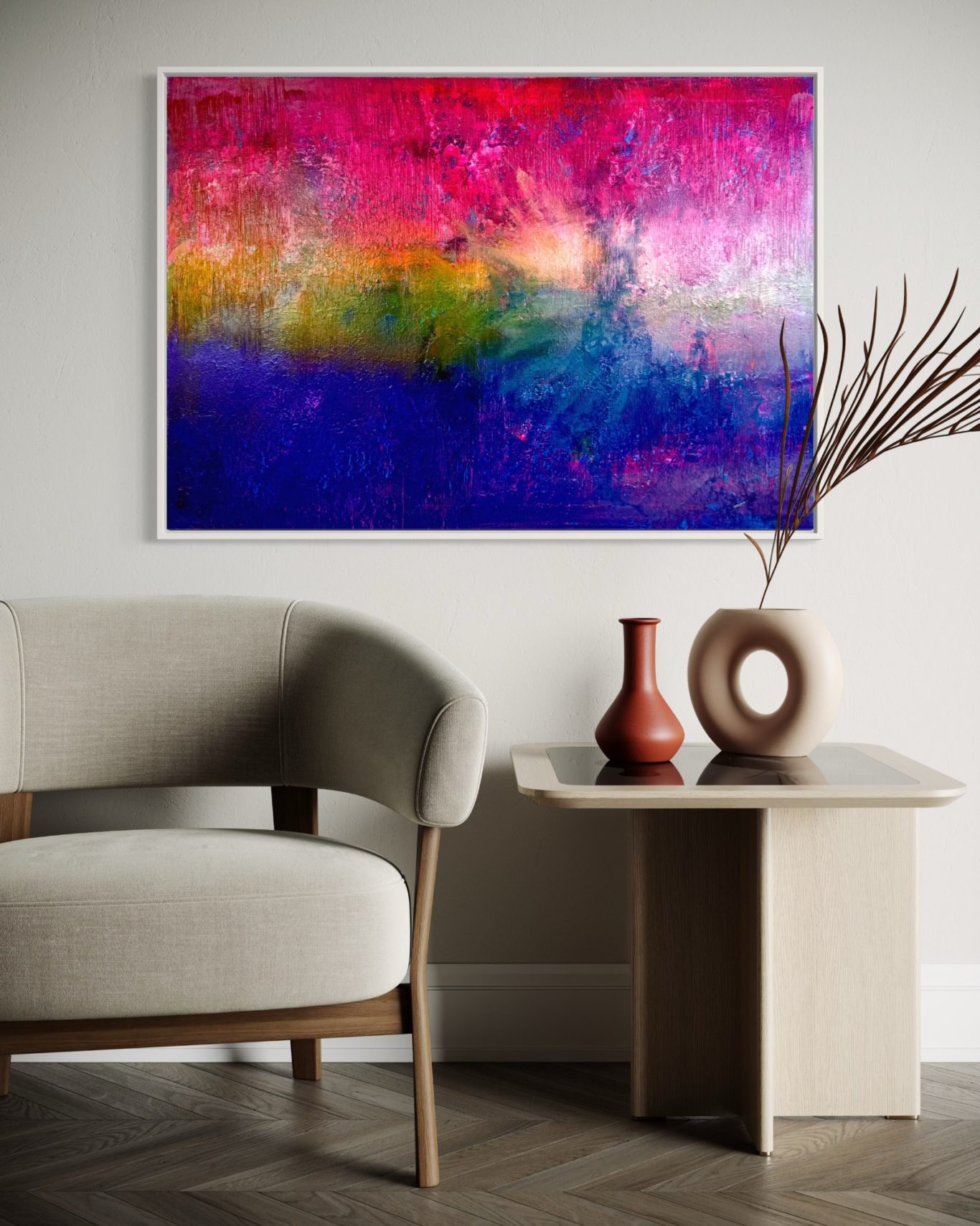 „Lichttanz“ ist ein Wirbel aus intensiven Farben, die sich wie fließende Strahlen über die Leinwand bewegen und die Magie von Licht in Bewegung einfangen. Leuchtende Pink-, Blau- und Gelbtöne verschmelzen zu einem vibrierenden Farbspiel, das an tanzende Nordlichter oder flackernde Sonnenreflexe erinnert.