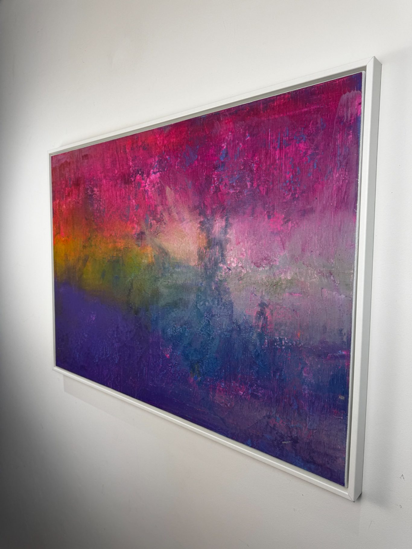 Leuchtendes Magenta trifft auf kraftvolles Violett, durchzogen von schimmernden Blau- und Grüntönen, die wie ein sanftes Aufatmen wirken. In der Mitte bricht ein Hauch von Licht hervor – als würde etwas Unerkanntes beginnen, sich zu zeigen.